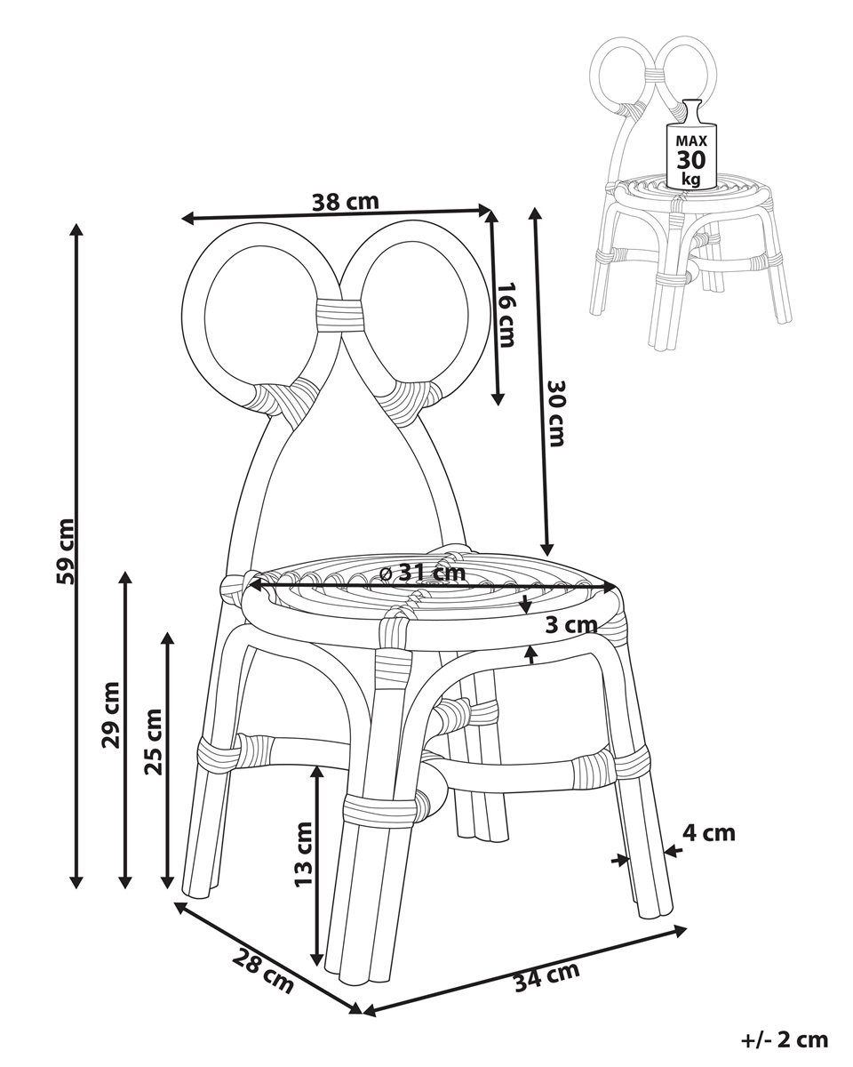Cadeira infantil em rattan natural com encosto. Esta encantadora cadeira para crianças, feita de rattan natural, apresenta um assento redondo que combina com qualquer almofada. O encosto tem um design único, com dois círculos no topo que fazem lembrar uma tesoura ou um laço – as possibilidades são infinitas. Sem braços, possui um perfil elegante e simples, perfeito para o quarto de qualquer criança. A sua estrutura leve facilita a movimentação pelos mais pequenos, incentivando a sua independência. Pintada numa cor adorável, esta cadeira certamente será uma das favoritas entre as crianças. Detalhes: Tipo de Produto: Cadeira para criança Estilo: Boho Cor: Natural Tipo de Material: Rattan Material Principal: Rattan/vime Material dos Pés: Rattan Material do Assento: Rattan Apoiador de Braço: Não Acabamento: Laminado Empilhável: Não Dimensões: Profundidade: 28 cm Altura do Assento: 29 cm Largura: 34 cm Altura: 59 cm Superfície do Assento: 31x31 cm Peso: 2 kg Peso Máximo Suportado: 30 kg A oferta inclui: 1 x Cadeira Características Principais: Design intemporal, Qualidade superior, Acabamentos precisos e perfeitos, Material natural, Leve e fácil de transportar Informação de Montagem: Não requer montagem Informações Adicionais: O produto é feito de materiais sensíveis às intempéries e deve ser armazenado em local abrigado quando não estiver em uso. Devido ao uso de materiais naturais, cada artigo pode apresentar ligeiras variações no tamanho, forma e cor. Estas variações não são consideradas falhas de produção ou defeitos do produto. Dicas de Manutenção: Rattan/vime: 1.Limpe apenas com um pano seco. Não use detergentes. Flor de Jacinto: 1.Limpe apenas com um pano seco. Não use detergentes.