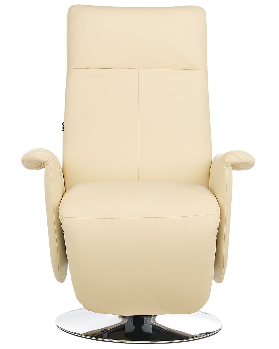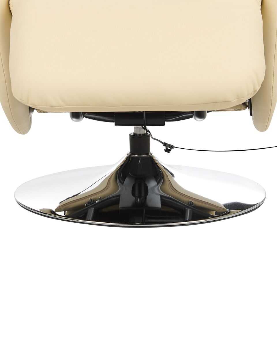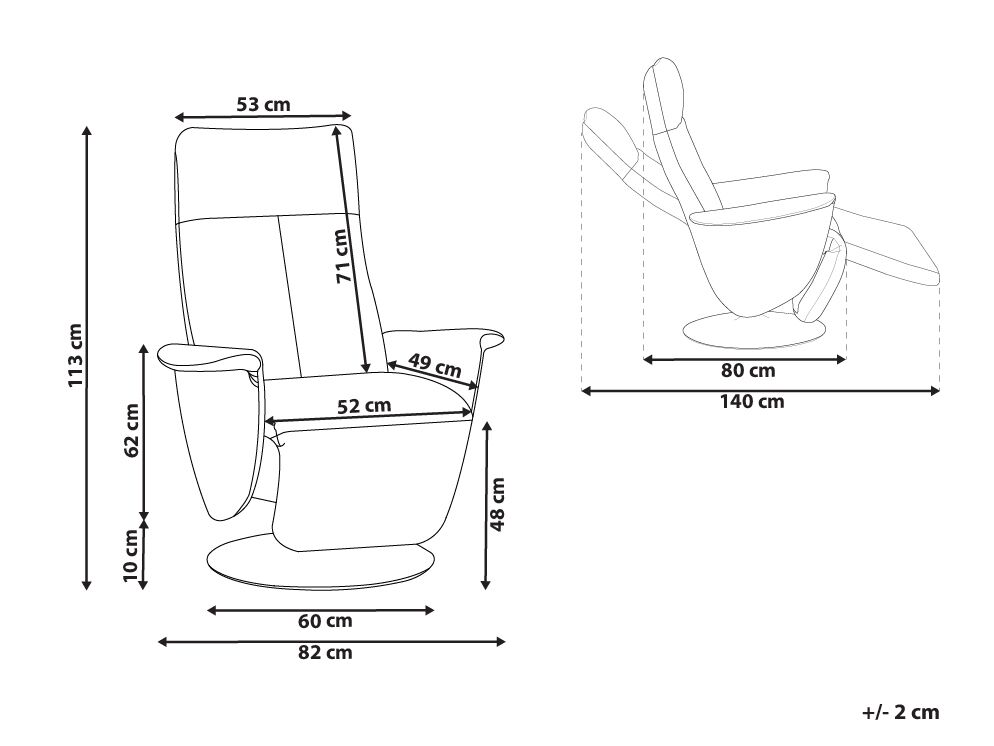 Poltrona elegante e moderna. Esta elegante poltrona reclinável é a forma perfeita de proporcionar conforto e descontração a qualquer espaço de vida. Ajustável a várias posições diferentes, apoia o corpo com um encosto alto e as pernas com o apoio ergonómico para os pés. É ideal para noites de cinema ou para um merecido descanso após longas horas de trabalho. Os estofos em pele sintética, de fácil manutenção, realçam o aspeto elegante e constituem uma adição elegante a qualquer interior. Detalhes: Tipo de Produto: Cadeira reclinável Estilo: Moderno Cor: Creme Tom: Creme Tipo de Material: Pele sintética Material Principal: Pele sintética Material Adicional: Metal Material do Enchimento: Espuma Material dos Pés: Metal Material do Assento: Pele sintética Composição Material: 100% pele sintética Estilo dos Braços: Diagonal Apoiador de Braço: Sim Protetores para os Pés: Não Desenho: Sólido Reclinação: Sim Densidade da Espuma do Assento: 24 kg/m3 Dimensões: Altura das Poltronas: 72 cm Profundidade: 80 cm Grossura do Assento: 6 cm Altura do Assento: 48 cm Largura: 82 cm Altura: 113 cm Superfície do Assento: 51x49 cm Peso: 24.5 kg Peso Máximo Suportado: 130 kg A oferta inclui: 1 x Poltrona Características Principais: Rotação a 360°, Assento confortável e relaxante, Encosto ergonómico e reclinável, Design moderno, Estofos em pele sintética de alta qualidade com um aspeto natural, Materiais de alta qualidade Informação de Montagem: Necessita de montagem completa. 20-40 min. Informações Adicionais: Para garantir a estabilidade da construção e segurança de uso, recomenda-se verificar se o produto foi montado corretamente 2 semanas após a instalação. Também é recomendado verificar se os parafusos estão devidamente apertados uma vez a cada 3 meses. Dicas de Manutenção: Pele sintética: 1.Limpe com água destilada e use produtos de limpeza à base de sabão em manchas difíceis 2.Por favor, aspire com um acessório adequado 3.Uma vez por semana, limpe com um pano húmido e seque após a limpeza. Não lubrifique 4.Use apenas produtos de limpeza e condicionadores suaves dedicados para a pele sintética. Metal: 1.Limpe com um detergente suave num pano macio, seque depois 2.Para elementos cromados ou cobre, use agente de polimento 3.Para evitar arranhões, não use produtos de limpeza abrasivos.