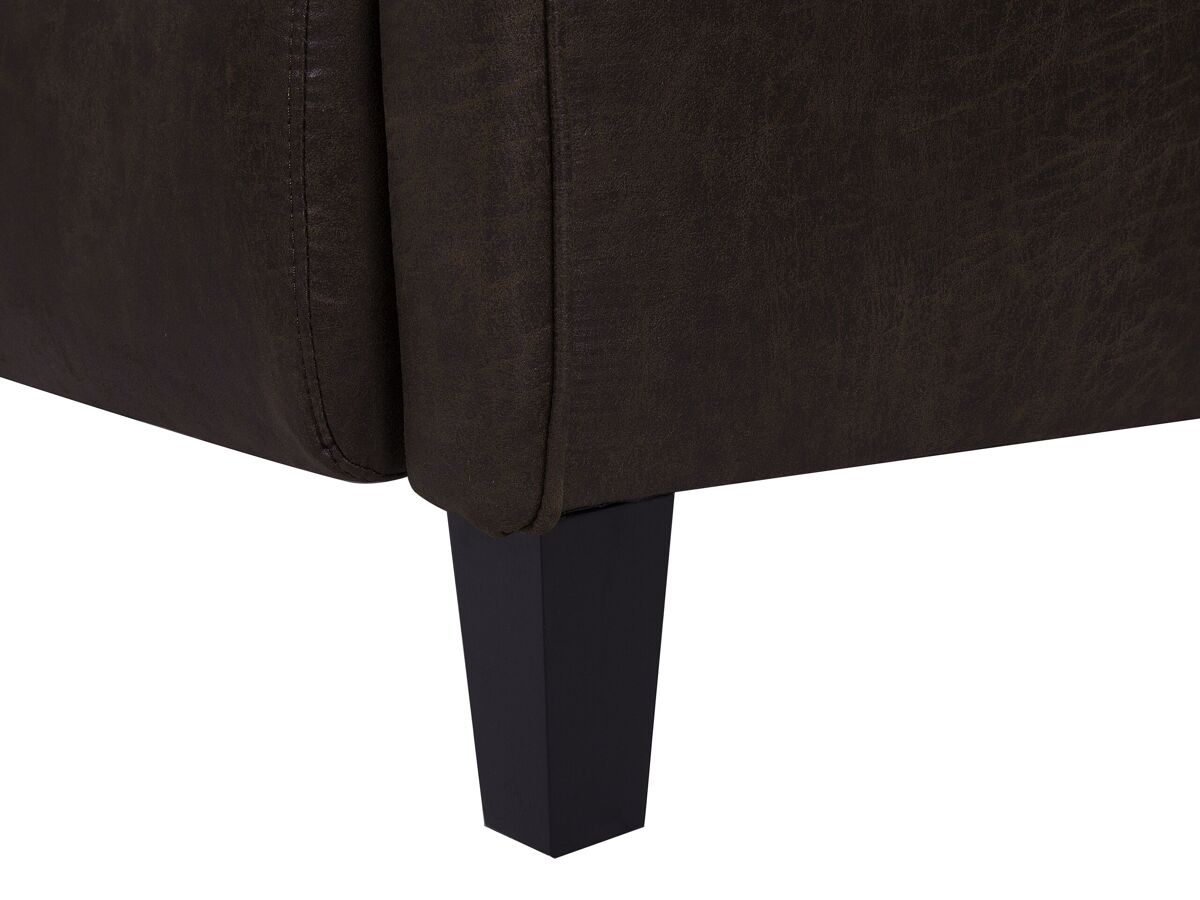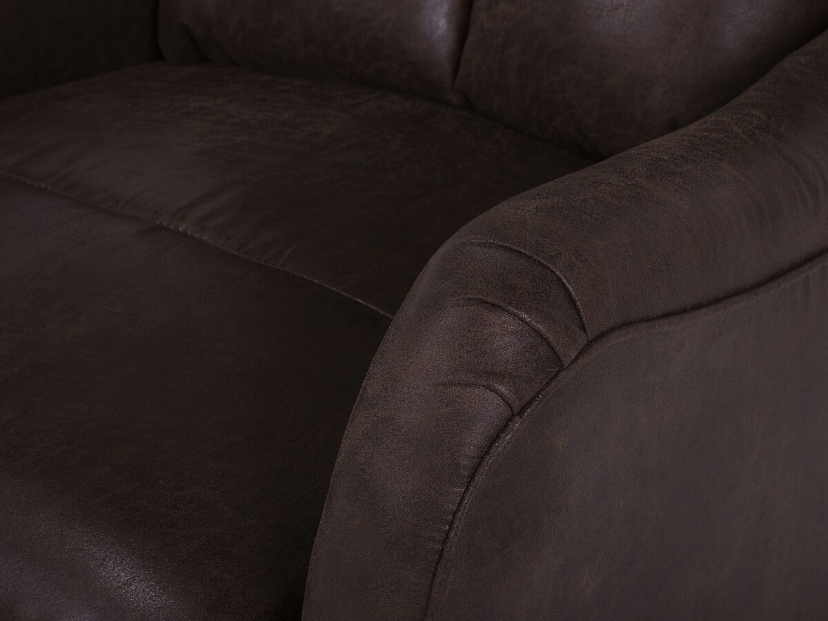 Cadeirão manualmente reclinável. Inspirada por formas vintage, esta poltrona reclinável acrescenta um toque de sofisticação e glamour antigo a qualquer sala de estar ou área de entretenimento. Os braços perfilados e as pernas inclinadas em madeira de tom escuro criam uma peça única de mobiliário que capta a atenção de todos. O mecanismo manual de reclinação integrado e o apoio para os pés permitem relaxar em três posições para o máximo conforto. Esta poltrona não é apenas uma parte essencial de longas maratonas de filmes, mas também uma decoração distinta em interiores de estilo tradicional e retro. Além disso, o seu estofamento clássico torna-a uma peça intemporal. Detalhes: Tipo de Produto: Cadeira reclinável Estilo: Retro Cor: Castanho Tom: Castanho escuro Tipo de Material: Pele sintética Material Principal: Pele sintética Material Adicional: Metal Material do Enchimento: Espuma Material dos Pés: Madeira Material do Assento: Pele sintética Composição Material: 100% pele sintética Estilo dos Braços: Direito Apoiador de Braço: Sim Protetores para os Pés: Não Desenho: Sólido Reclinação: Sim Construção do Assento: Molas onduladas Densidade da Espuma do Assento: 28 kg/m3 Dimensões: Altura das Poltronas: 64 cm Profundidade: 73 cm Grossura do Assento: 10 cm Altura do Assento: 46 cm Largura: 68 cm Altura: 108 cm Superfície do Assento: 52x53 cm Peso: 24 kg Peso Máximo Suportado: 130 kg A oferta inclui: 1 x Poltrona Características Principais: Encosto e apoio de pés ajustáveis, Braços cómodos e perfeitamente ajustados, Assento confortável e relaxante, Estilo retro, Acolchoado de qualidade superior Informação de Montagem: Parcialmente necessária. 5-15 min. Informações Adicionais: Para garantir a estabilidade da construção e segurança de uso, recomenda-se verificar se o produto foi montado corretamente 2 semanas após a instalação. Também é recomendado verificar se os parafusos estão devidamente apertados uma vez a cada 3 meses. Dicas de Manutenção: Pele sintética: 1.Por favor, aspire com um acessório adequado 2.Uma vez por semana, limpe com um pano húmido e seque após a limpeza. Não lubrifique 3.Use apenas produtos de limpeza e condicionadores suaves dedicados para a pele sintética 4.Limpe com água destilada e use produtos de limpeza à base de sabão em manchas difíceis. Madeira: 1.Só para artigos com acabamento a óleo: podem ser novamente oleados após algum tempo para se manterem em bom estado 2.Secar imediatamente após a limpeza, para impedir que a água se acumule no material 3.Use apenas detergente neutro e um pano macio. Sempre limpe na direção do grão.