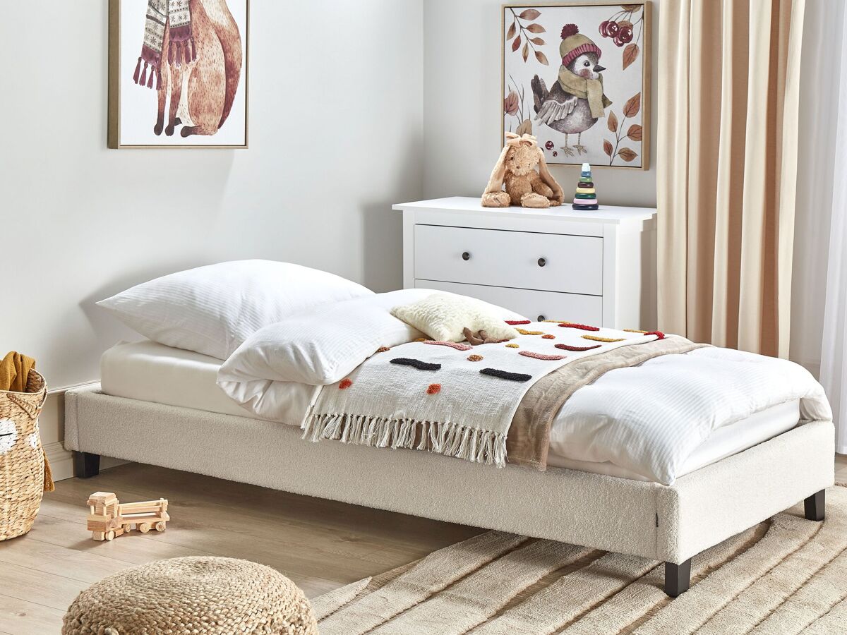 Sommier individual de design clássico. Desfrute de uma noite de sono tranquila com este sommier minimalista. O seu design moderno e universal complementa qualquer decoração de interiores. Revestido em tecido de alta qualidade com aparência de bouclé, a estrutura possui ripas de madeira que garantem uma distribuição uniforme do peso corporal. Sem uma cabeceira, esta cama é ideal para quartos com tetos baixos ou inclinados. Detalhes: Tipo de Produto: Cama de criança Estilo: Escandinavo Cor: Creme Tom: Creme Tipo de Material: Tecido Material Principal: Bouclé Material Adicional: Contraplacado de madeira Composição Material: 100% poliéster Tecido Estofado na Parte Posterior: Não Dimensões: Largura: 100 cm Comprimento: 213 cm Altura: 29 cm Superfície para Dormir: 90x200 cm Peso: 16 kg Peso Máximo Suportado: 300 kg A oferta inclui: 1 x Estrado de ripas (Número de ripas: 13), 1 x Estrutura de cama, Não inclui: colchão, roupa de cama e almofadas Características Principais: Adequado para qualquer tipo de colchão, Base de ripas para absorção de choque para óptimo suporte, Estilo minimalista (escandinavo), Estrutura concebida para proporcionar estabilidade máxima, Acolchoado de qualidade superior Informação de Montagem: Necessita de montagem completa. 20-40 min. Informações Adicionais: A altura do colchão mostrado na imagem é de 20 cm, pelo que recomendamos a utilização de um colchão com altura similar. Dicas de Manutenção: Poliéster: 1.Limpe com um shampoo seco e uma esponja húmida ou com um detergente neutro 2.Aspire com um acessório adequado. Madeira de chopo: 1.Use apenas detergente neutro e um pano macio. Sempre limpe na direção do grão 2.Secar imediatamente após a limpeza, para impedir que a água se acumule no material 3.Só para artigos com acabamento a óleo: podem ser novamente oleados após algum tempo para se manterem em bom estado.