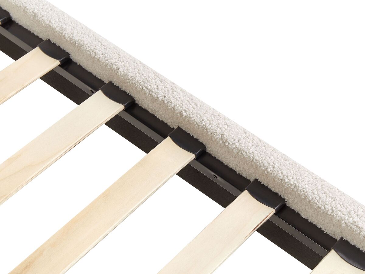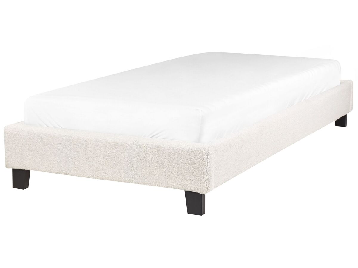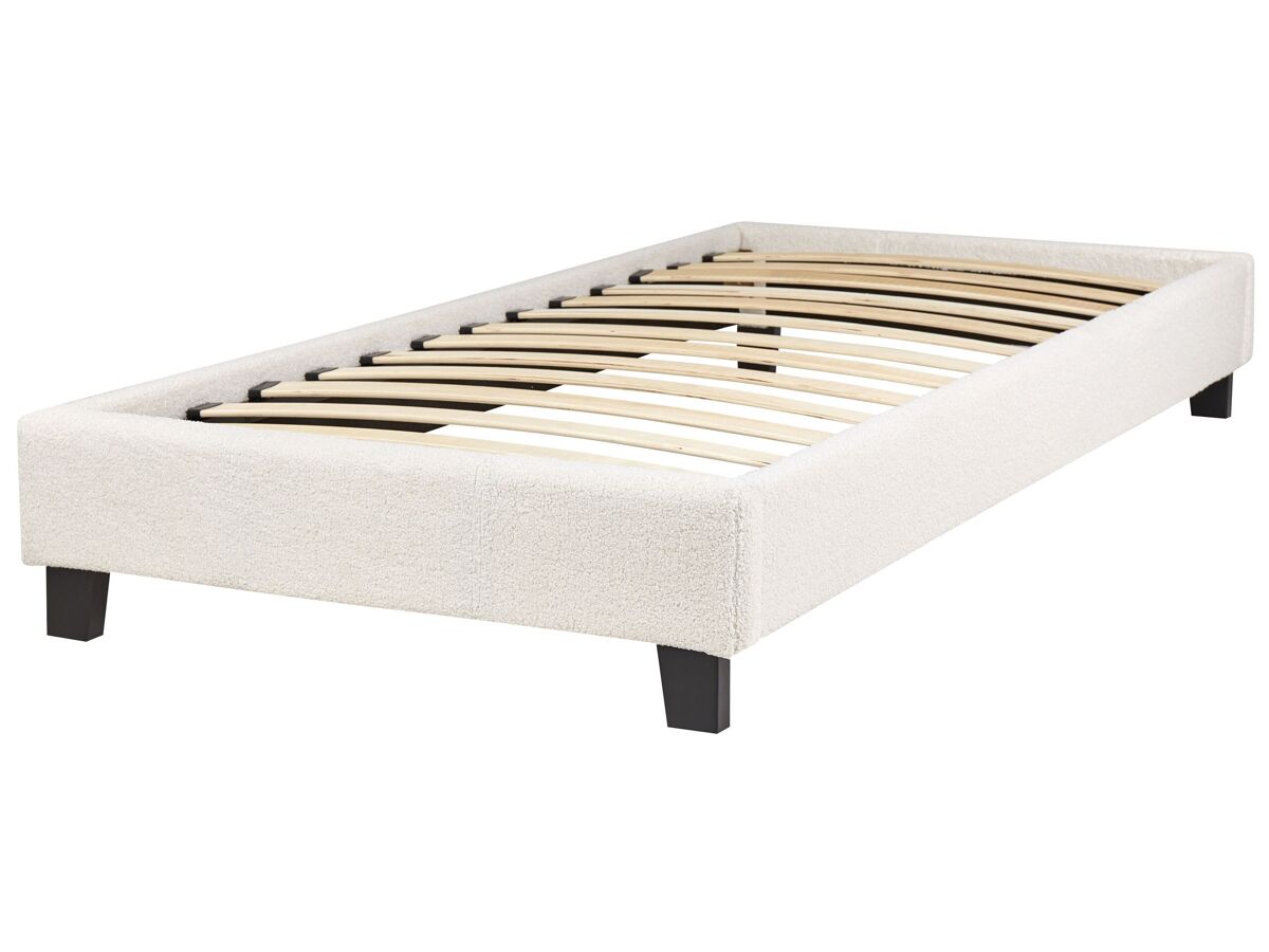 Base de cama individual de design clássico. Desfrute de uma noite de sono tranquila com esta base de cama minimalista. O seu design moderno e universal complementa qualquer decoração de interiores. Revestida em tecido de alta qualidade com aparência de bouclé, a estrutura possui ripas de madeira que garantem uma distribuição uniforme do peso corporal. Sem uma cabeceira, esta cama é ideal para quartos com tetos baixos ou inclinados.