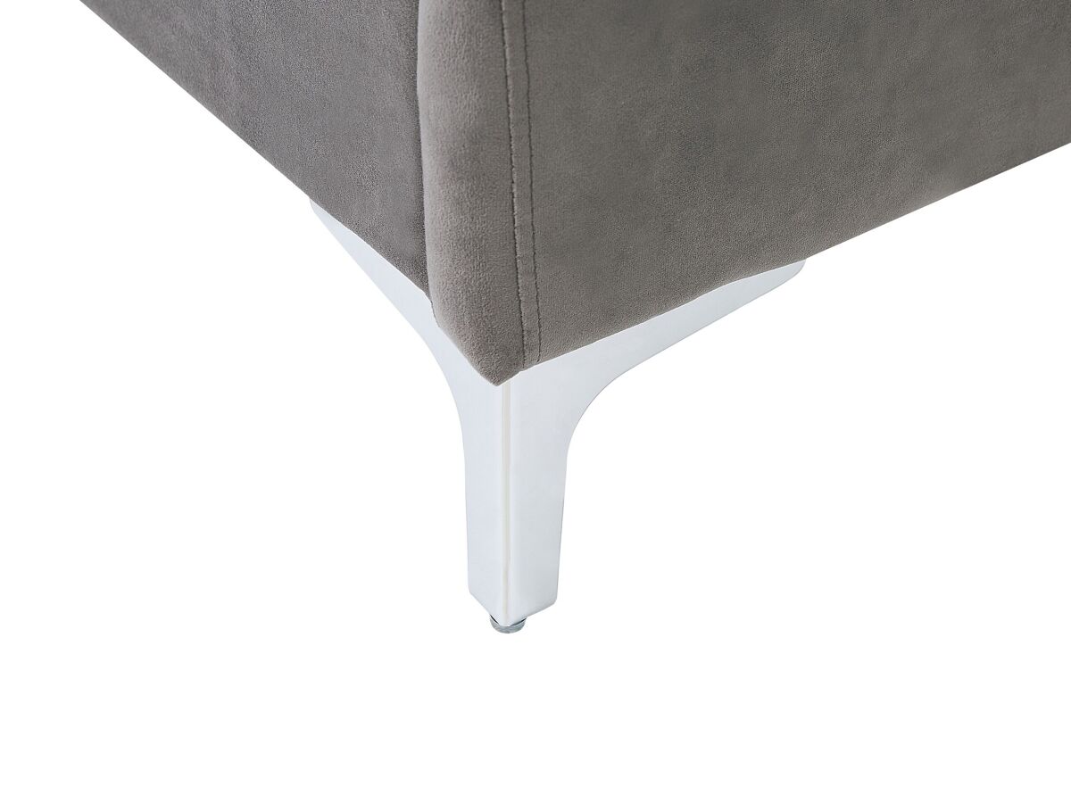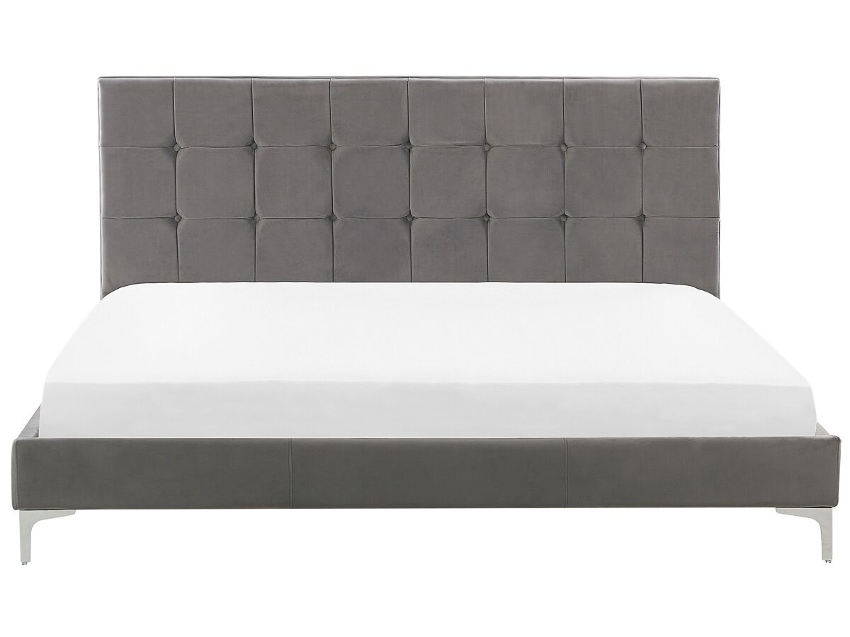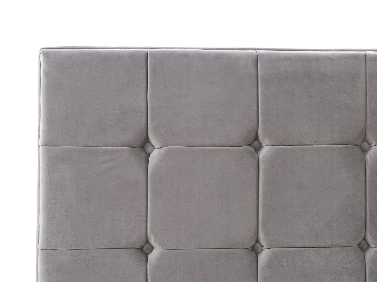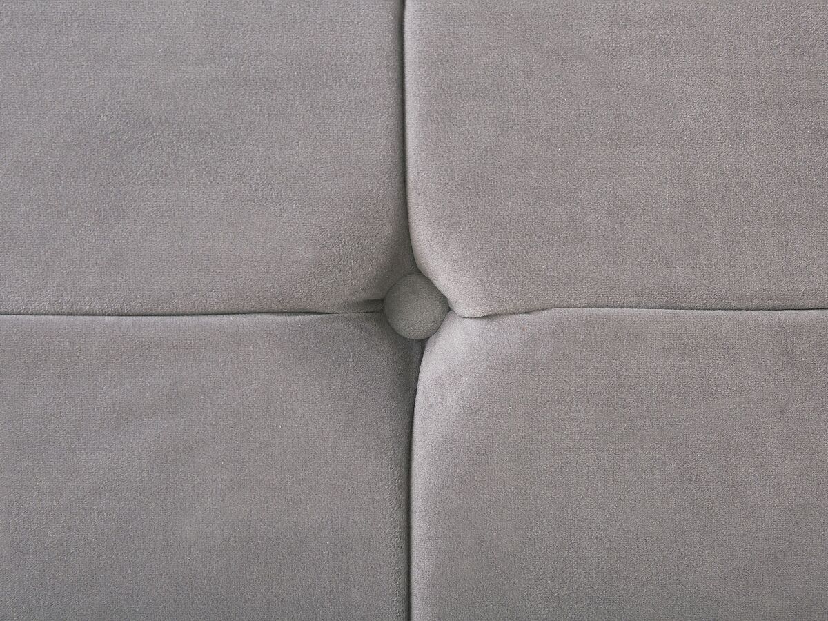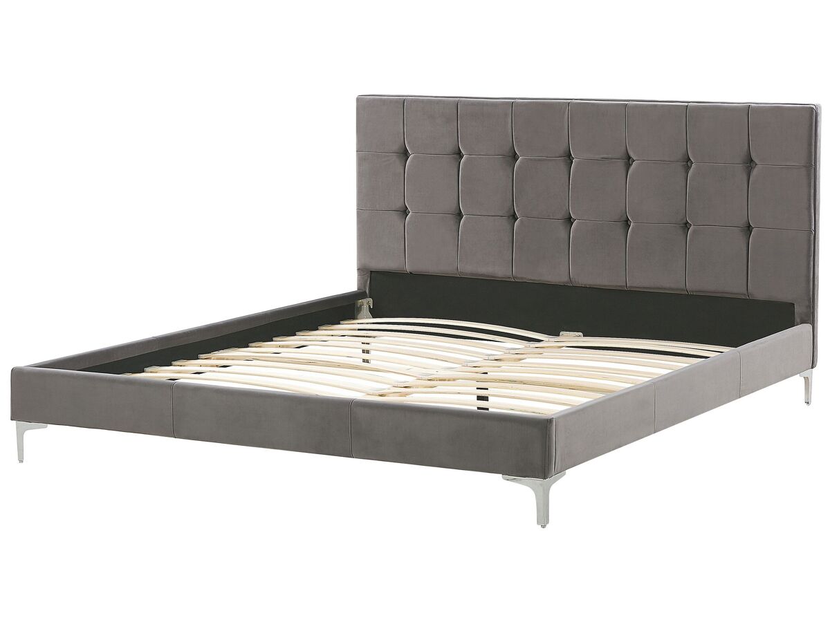 Cama estofada com base de ripas. Com esta cama estofada, criada ao combinar formas modernas diretas com toques decorativos clássicos, o seu quarto ganhará um visual elegante. A sua estrutura de perfil baixo é revestida com um lindíssimo veludo suave ao toque e complementada por simples pernas de metal. A alto cabeceira é espessamente acolchoada para que se possa apoiar confortavelmente e desfrutar do seu livro favorito ou relaxar a ver televisão. Os profundos botões dão à cama um toque de luxo, tornando-a um deslumbrante e elegante ponto central que combina com qualquer estilo de decoração de interiores.