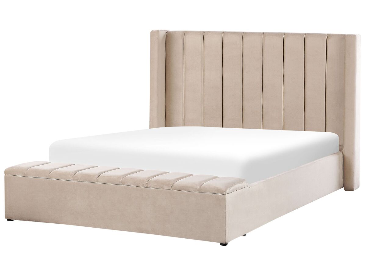 Cama estofada com espaço de armazenamento. Esta cama estofada em veludo fará toda a diferença em qualquer quarto de dormir moderno e tradicional. Com a cabeceira e um banco de arrumação incorporado, não só oferece o melhor conforto de descanso como também é muito funcional. Com um enchimento espesso, a cabeceira estufada é simplesmente perfeita para se apoiar e ler um livro ou ver televisão. O banco de arrumação pode ser utilizado como um assento ou lugar extra para guardar roupa de cama, almofadas, vestuário, etc.