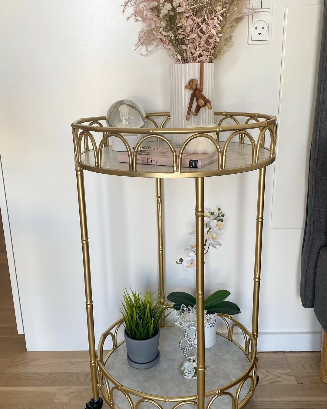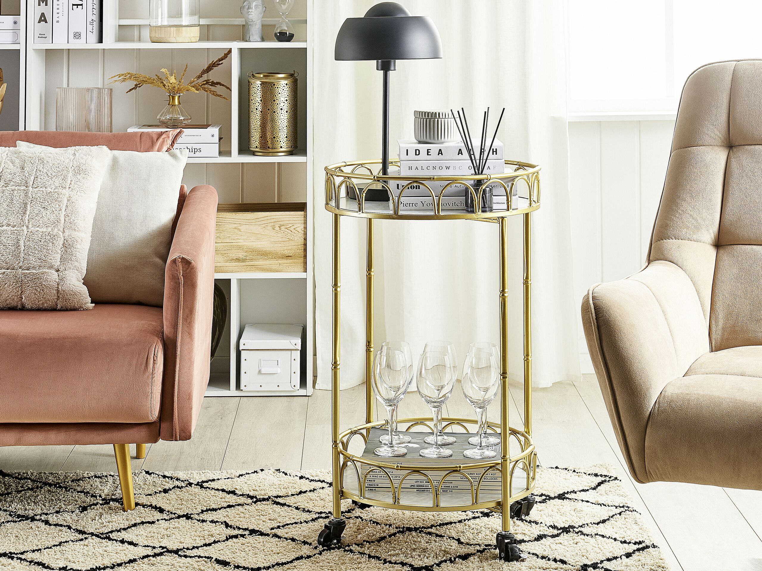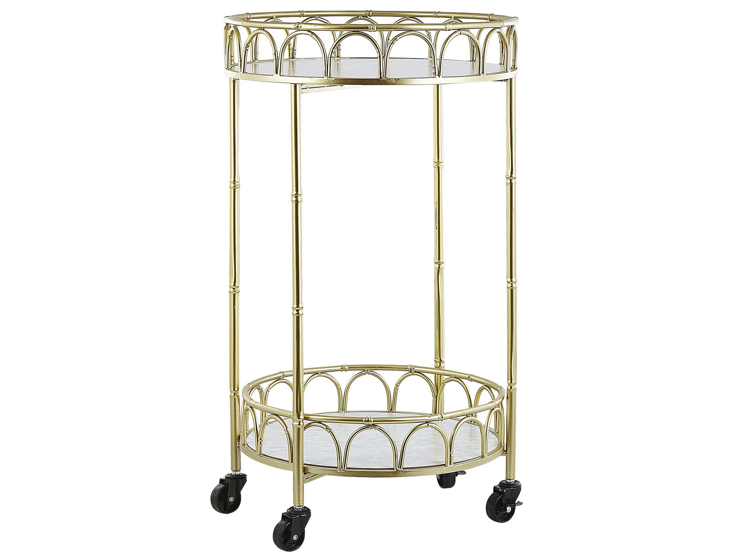 Carrinho dourado com efeito de mármore. Dê à sua casa um detalhe charmoso com esta mesa com rodas que funciona como um carrinho de cozinha ou de bar. Exponha os seus livros ou fotografias emolduradas na prateleira superior e utilize a prateleira inferior para guardar copos ou garrafas de vinho. A estrutura de metal pintada e combinada com os tampos de efeito mármore e fazem dela uma adição marcante para uma sala de estar, mas será também uma mais-valia em todas as cozinhas de inspiração glamorosa. Com esta elegante mesa lateral, o seu espaço terá um aspeto contemporâneo e moderno.