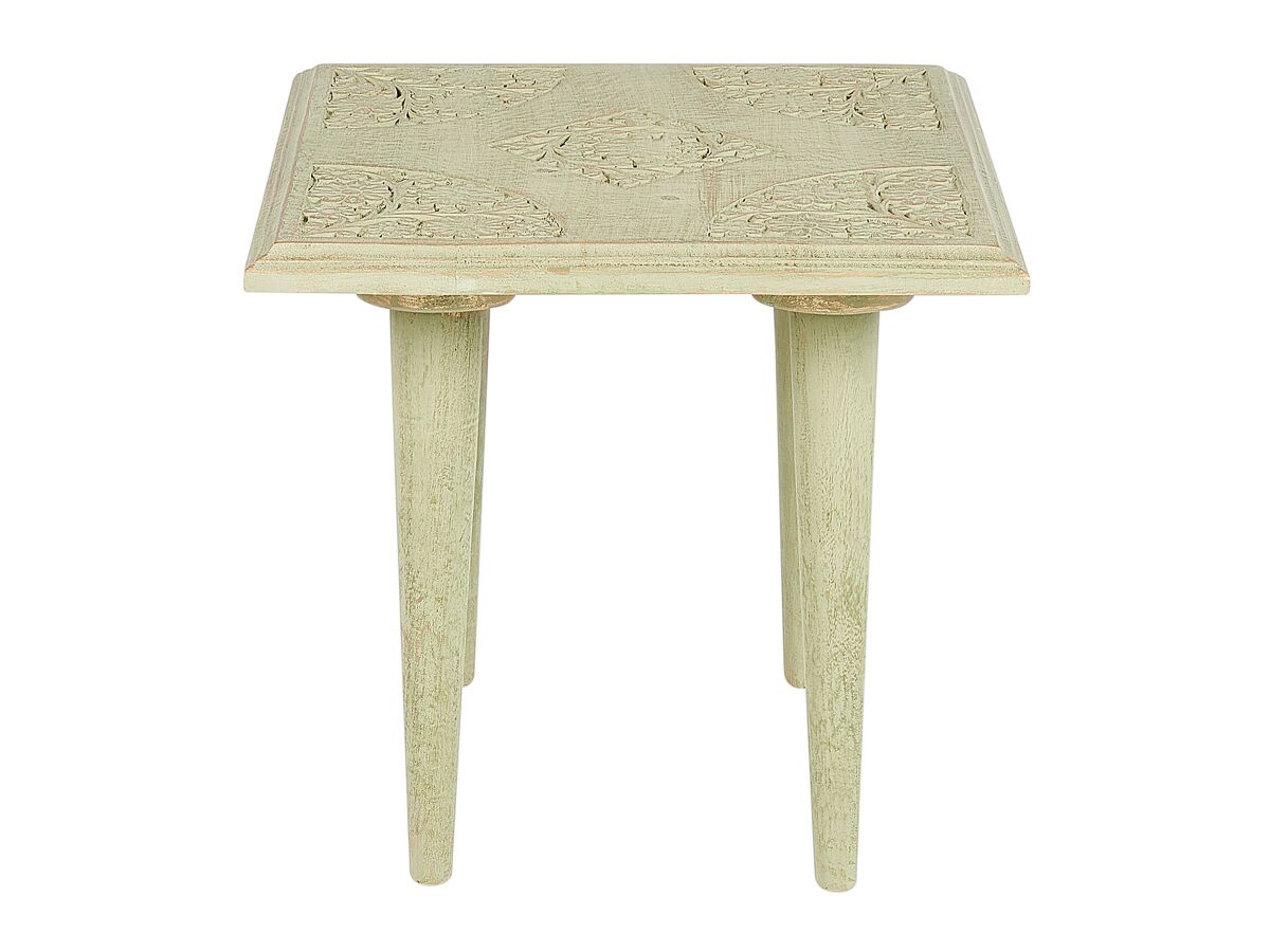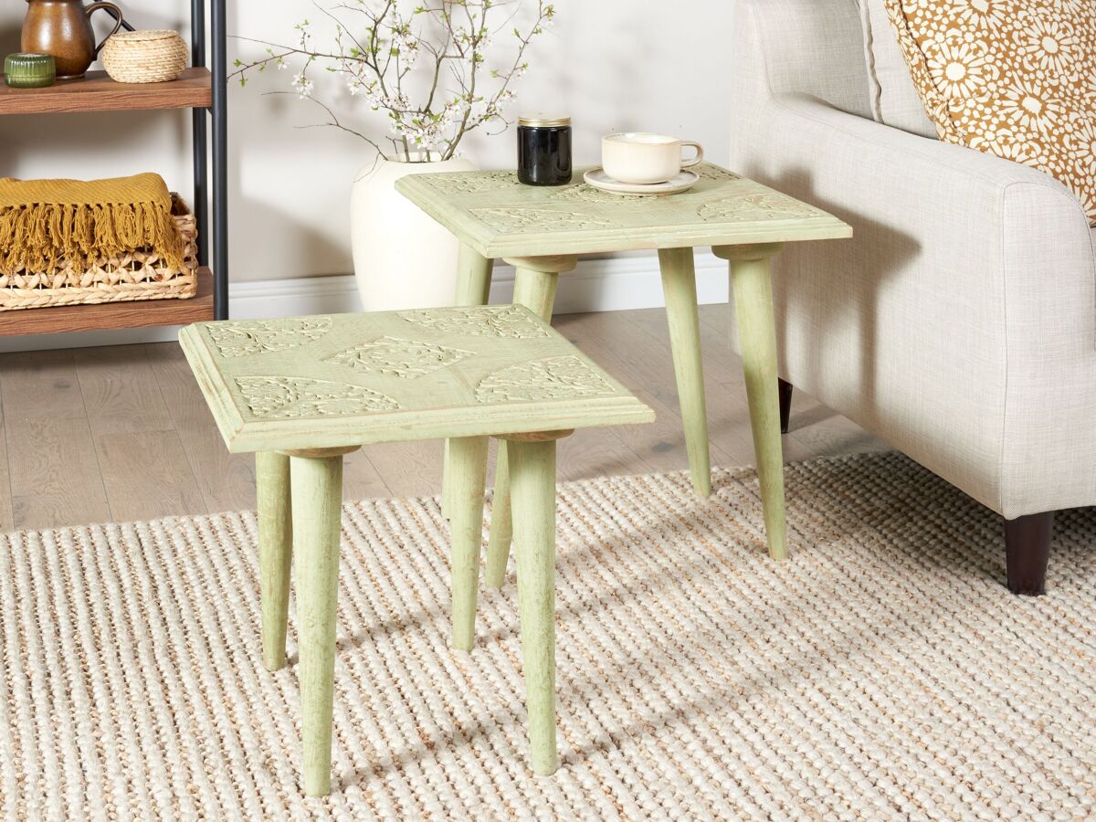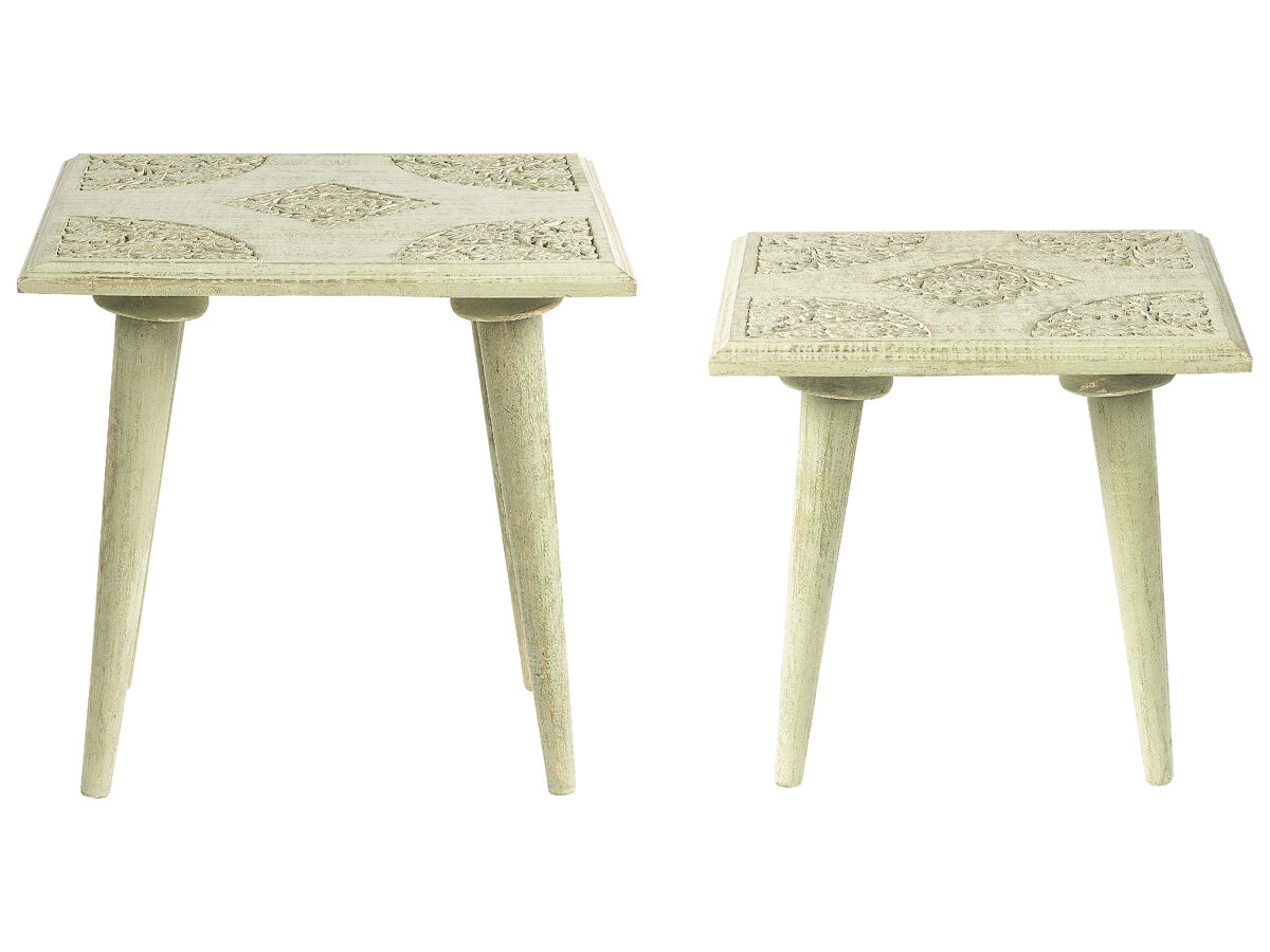 Conjunto de 2 mesas laterais . Dê um toque de frescura ao interior da sua casa com este conjunto de duas sólidas mesas de apoio. O seu tampo quadrado esculpido oferece espaço suficiente para todos os pequenos acessórios do quotidiano. O efeito de desgaste apresentado pelas peças confere-lhes um caráter nitidamente retro. Feitos de madeira natural, os móveis foram criados à mão com total atenção aos detalhes.