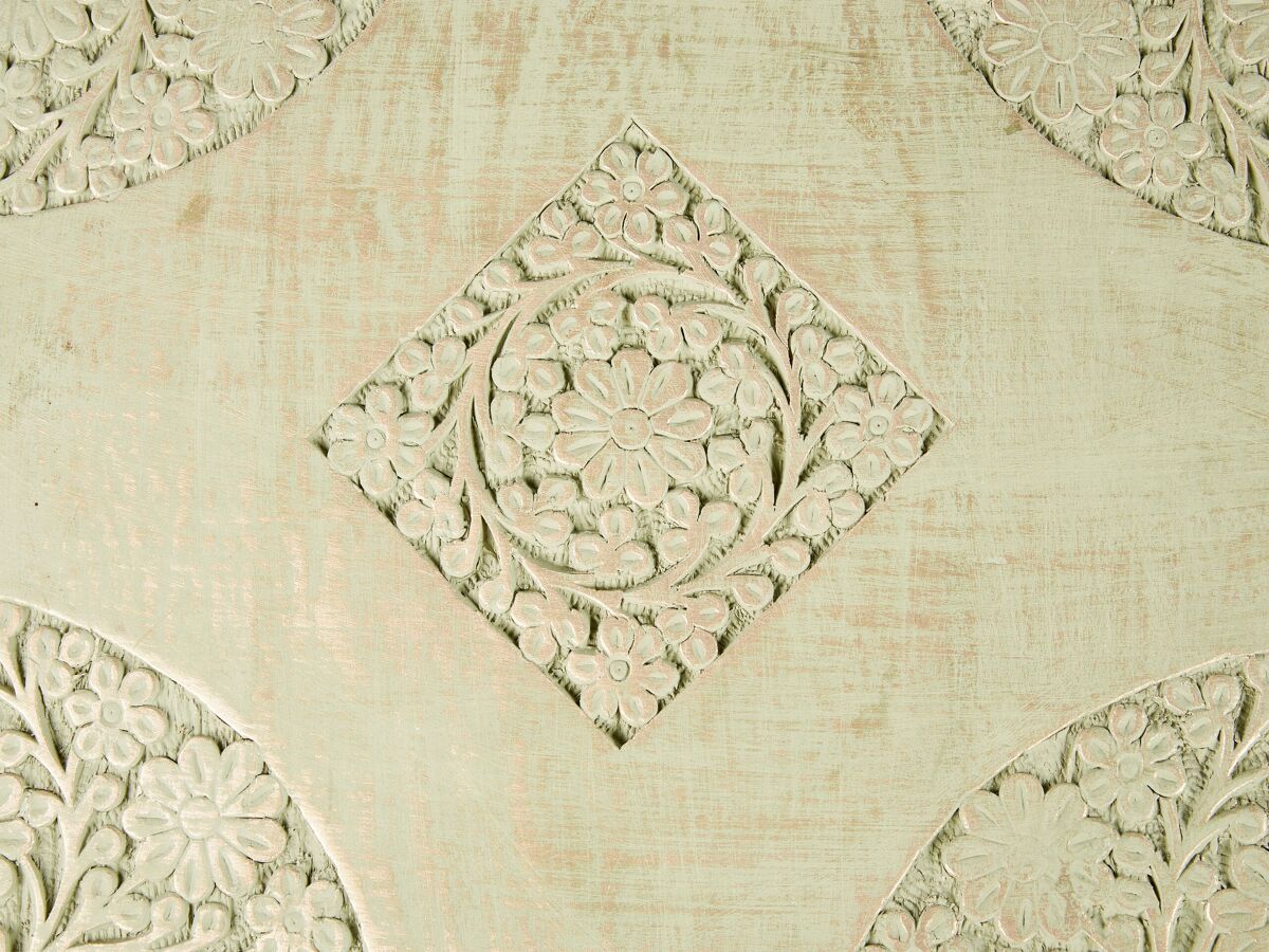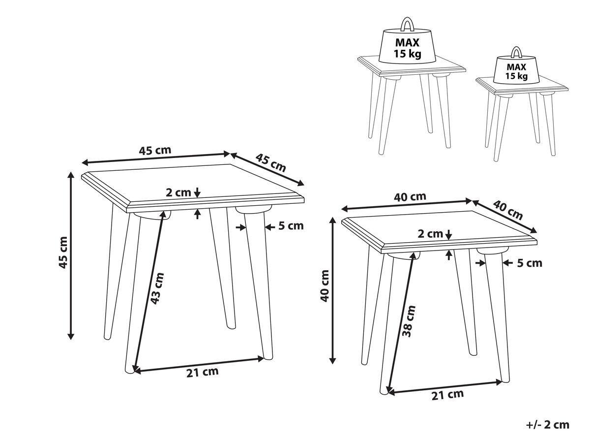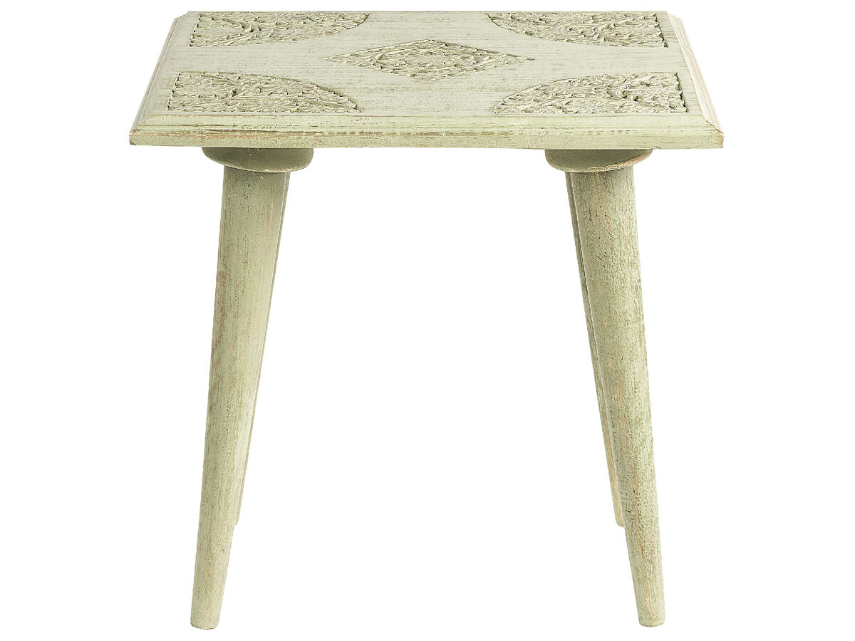 Conjunto de 2 mesas laterais . Dê um toque de frescura ao interior da sua casa com este conjunto de duas sólidas mesas de apoio. O seu tampo quadrado esculpido oferece espaço suficiente para todos os pequenos acessórios do quotidiano. O efeito de desgaste apresentado pelas peças confere-lhes um caráter nitidamente retro. Feitos de madeira natural, os móveis foram criados à mão com total atenção aos detalhes.