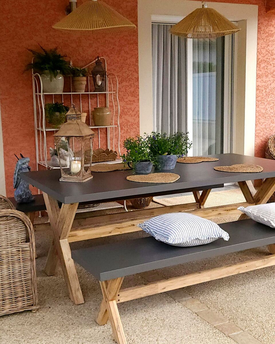 Características Principais: Perfeito para refeições com grupos grandes, O complemento ideal para o jardim, Acabamento tipo cimento para uma aparência industrial, Materiais de alta qualidade, Adequado para uso interior e exterior