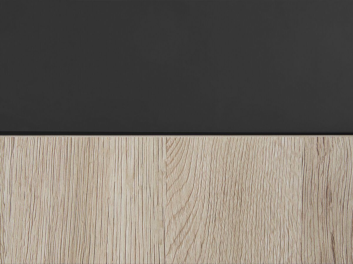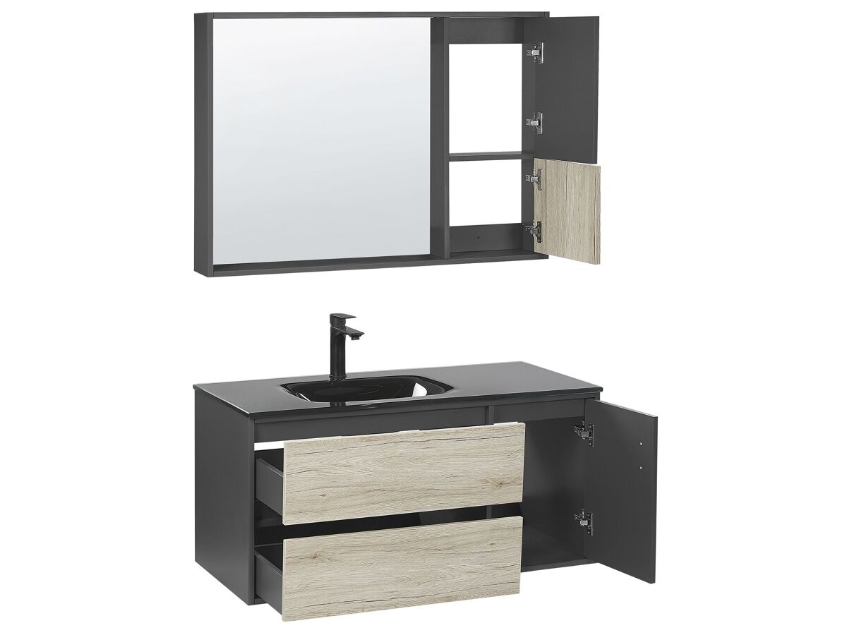 Móvel com lavatório e espelho. Certifique-se de que a sua casa de banho oferece todo o espaço de armazenamento que precisa, com este elegante conjunto de móveis. Inclui um armário com lavatório e um armário de parede com espelho, para manter todos os seus itens essenciais fora da vista. No Móvel de lavatório estão disponíveis duas gavetas profundas e um compartimento com porta, bem como duas prateleiras adicionais por trás do espelho. O conjunto é perfeito para uma casa de banho com espaço limitado. Móveis de tons escuros, com frente em acabamento tipo madeira funcionam bem com qualquer estilo de decoração.