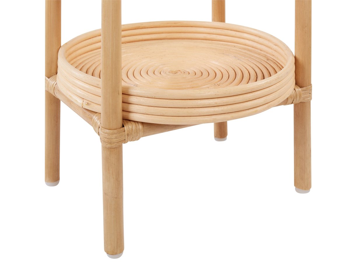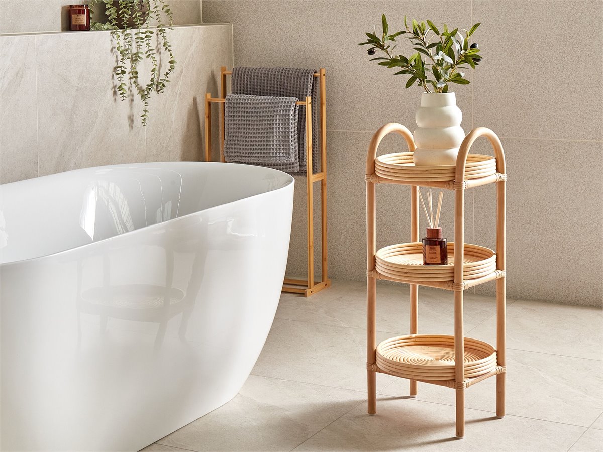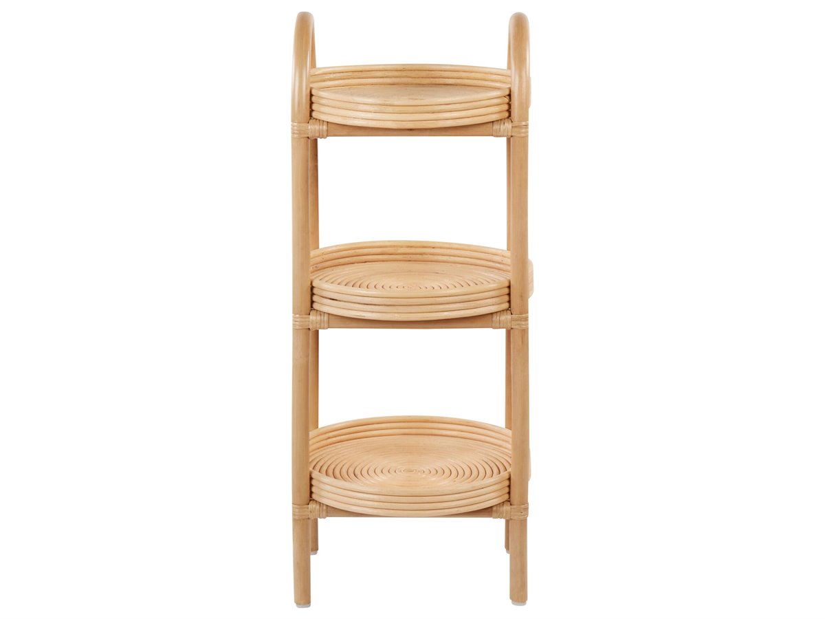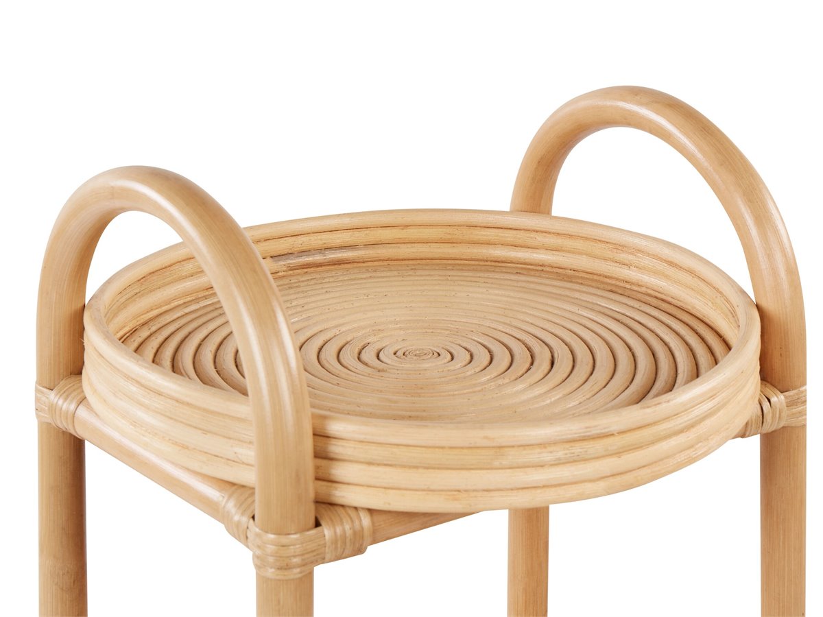 Mesa de apoio com 3 prateleiras. Esta elegante mesa de apoio de três níveis acrescenta um toque de encanto natural a qualquer espaço interior ou exterior. Fabricada em rattan natural, oferece uma ampla arrumação para os objetos essenciais, enquanto o seu design robusto mas leve garante uma fácil mobilidade. Ideal para expor objetos decorativos, plantas ou necessidades diárias, combina funcionalidade com estilo.