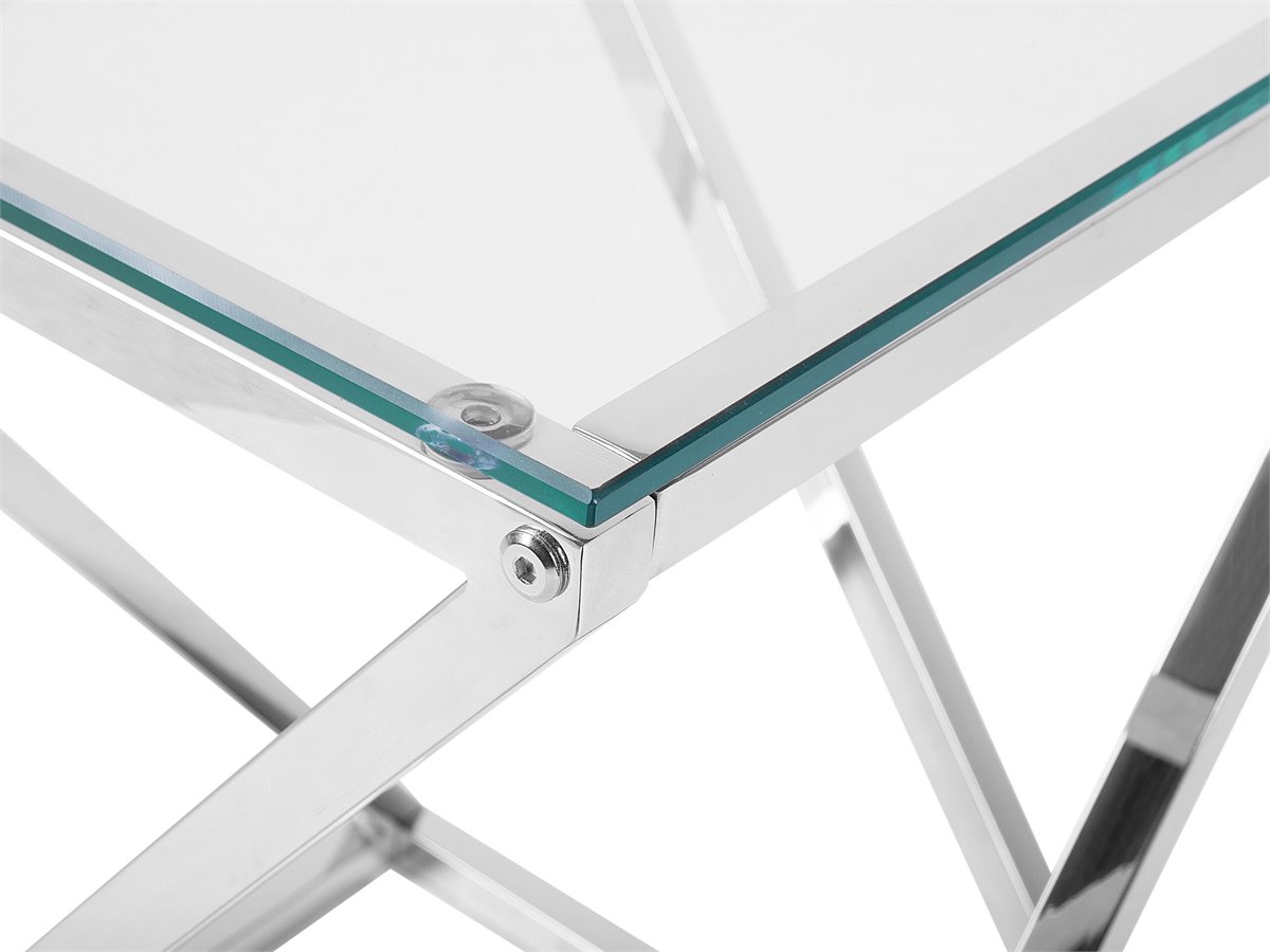 Mesa de apoio sofisticada e única. Esta mesa de apoio sofisticada, de design moderno, irá adicionar um toque de classe à sua decoração. Excecionalmente robusta e de fácil manutenção, a peça apresenta um tampo transparente, feito de vidro temperado durável e uma base metálica robusta que garante a estabilidade de toda a construção. O seu visual marcadamente industrial, conjugado com os seus acabamentos brilhantes, adicionará um toque de luxo a qualquer divisão.
