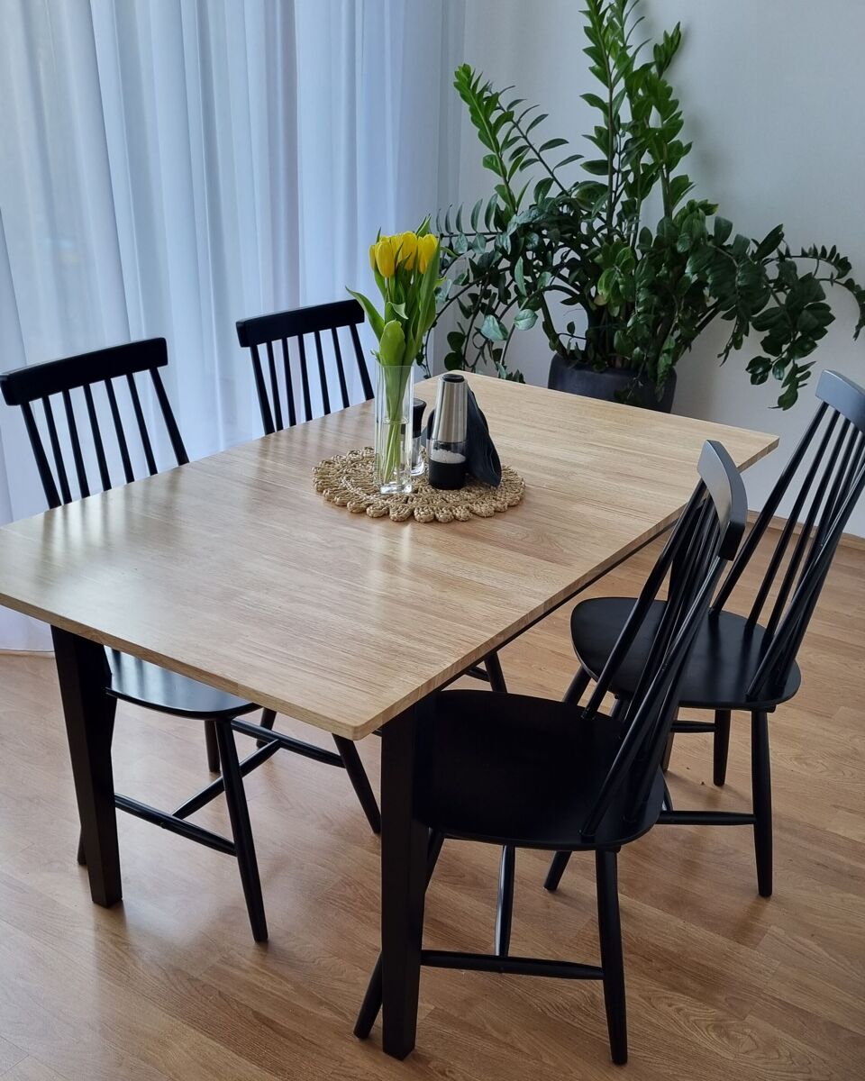 Mesa de jantar clássica em madeira de seringueira. Crie um espaço de jantar encantador com esta elegante mesa de jantar. Ela encaixa-se perfeitamente em muitos interiores, do minimalista e escandinavo, passando pela decoração clássica. Oferece uma ampla superfície para comer, trabalhar e jogar. A combinação de madeira clara natural e elementos pintados dá mais frescura e animação a qualquer espaço. A sua construção sólida e os materiais de alta qualidade garantem uma utilização confortável por longo tempo e uma manutenção fácil.
