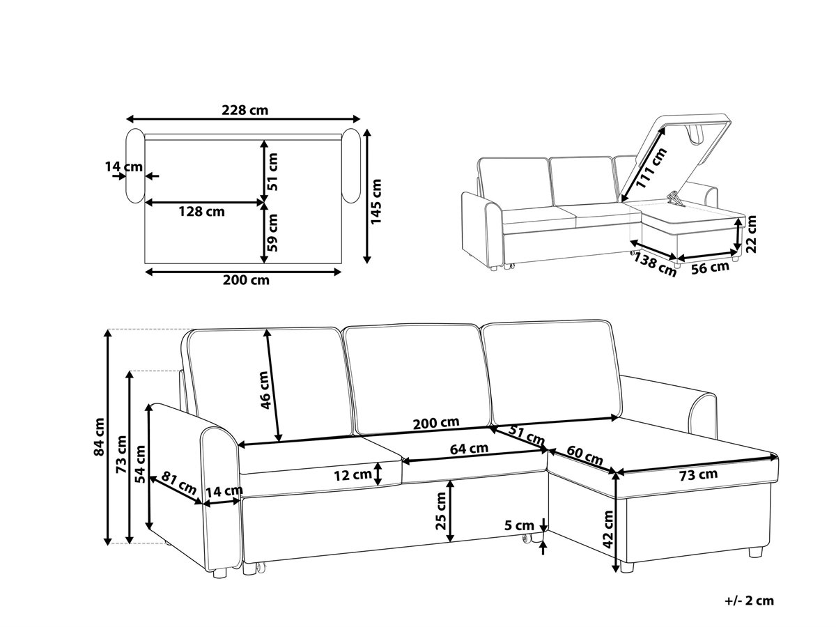 Sofá de esquina confortável com armazenamento. Crie um recanto confortável que tornará os seus serões ainda mais agradáveis. Este sofá possui uma chaise do lado esquerdo e transforma-se facilmente numa cama de casal. Dispõe de um compartimento oculto amplo para arrumação de roupa de cama. Os assentos e as almofadas do encosto, bastante acolchoados e com capas removíveis, proporcionam um conforto elevado. Revestido num tecido de poliéster resistente numa cor clássica, este sofá é suportado por pernas metálicas e adequa-se a uma vasta gama de estilos interiores. Detalhes: Tipo de Produto: Sofá de esquina Estilo: Industrial Cor: Preto Tipo de Material: Tecido Material Principal: Poliéster Material Adicional: Material sintético Material do Enchimento: Espuma Composição Material: 100% poliéster Formato: Em forma de L Estilo dos Braços: Direito Protetores para os Pés: Não Peças Modulares: Não Orientação: à esquerda Reclinação: Não Cobertura das Almofadas Removíveis: Sim Construção do Assento: Molas onduladas Densidade da Espuma do Assento: 50 kg/m3 Assentos para: 3 pessoas Função para Dormir: Sim Mecanismo de Abertura para Sofá - Cama: Puxável Armazenamento: Sim Dimensões: Altura das Poltronas: 54 cm Profundidade: 145 cm Grossura do Assento: 12 cm Altura do Assento: 42 cm Largura: 228 cm Altura: 84 cm Superfície do Assento: 200x51 cm Superfície para Dormir: 200x111 cm Peso: 87 kg Peso Suportado por Pessoa: 150 kg A oferta inclui: 1 x Sofá de canto Características Principais: Facilmente convertível numa cama, Acolchoado espesso proporciona um conforto ideal, Design intemporal, Acolchoado de qualidade superior, Fabrico sólido e preciso, Espaço de arrumação funcional para todos os seus intens pessoais, Estofado com qualidade superior, Capas de almofada removíveis Informação de Montagem: Parcialmente necessária. 20-40 min. Dicas de Manutenção: Poliéster: 1.Aspire com um acessório adequado 2.Limpe com um shampoo seco e uma esponja húmida ou com um detergente neutro.