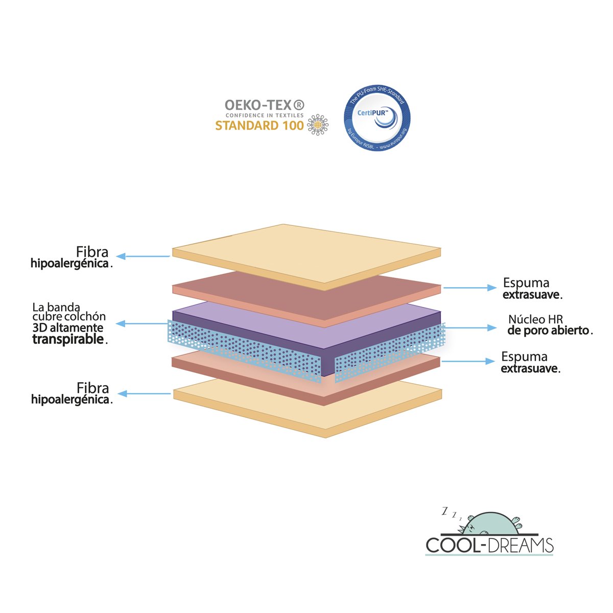 COLCHÃO 🔝 VENTAS MORFEO com certificação Oeko-Tex e CertiPUR, núcleo de espuma de 9 cm, densidade 23 k/m3, tecido elástico de 200gr em ambas as faces, acolchoamento de fibra contínua de 150gr e capa de espuma super macia. Tem um rebordo 3D para maior respirabilidade.