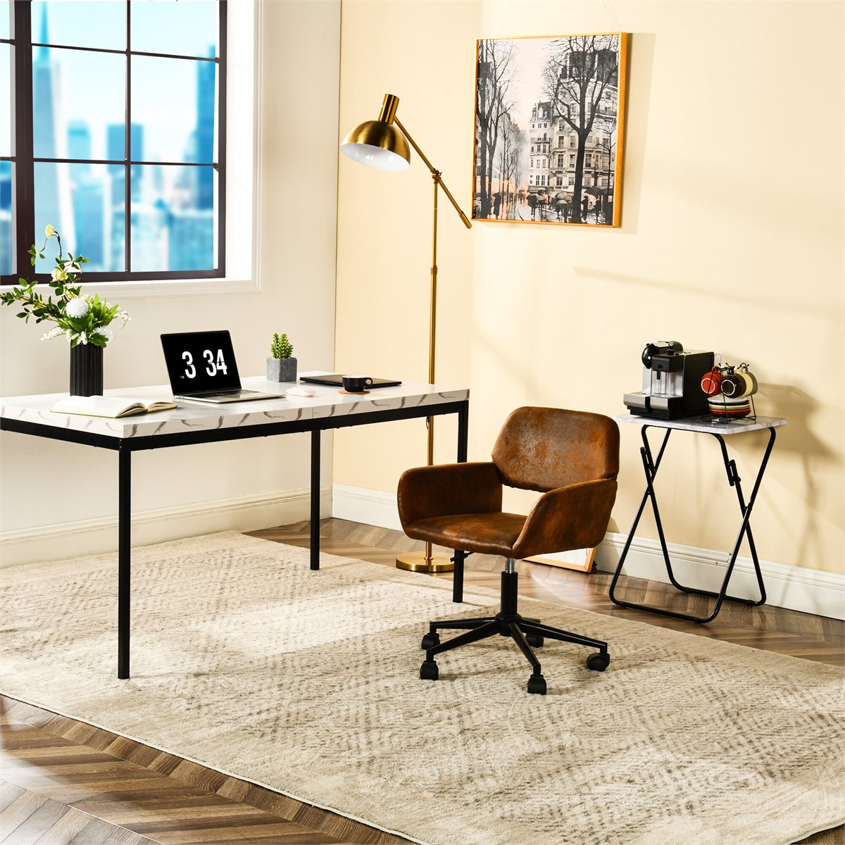 Combine o estilo industrial com o conforto moderno com esta cadeira de jantar giratória estofada. O seu acabamento com efeito camurça castanha confere-lhe um aspeto acolhedor e elegante, perfeito para combinar com uma mesa de jantar de madeira, metal ou estilo rústico.