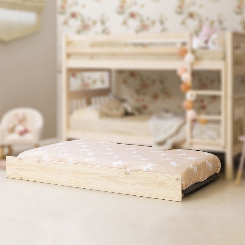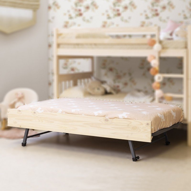 Cama de arrasto elevável com base de ripas e estrutura metálica de 90x190cm. É uma cama auxiliar de arrasto que pode ser ao nível do chão ou pode ser levantada como se mostra na fotografia. A parte da frente da gaveta é em MDF lacado a branco, branco lavado ou pinho.