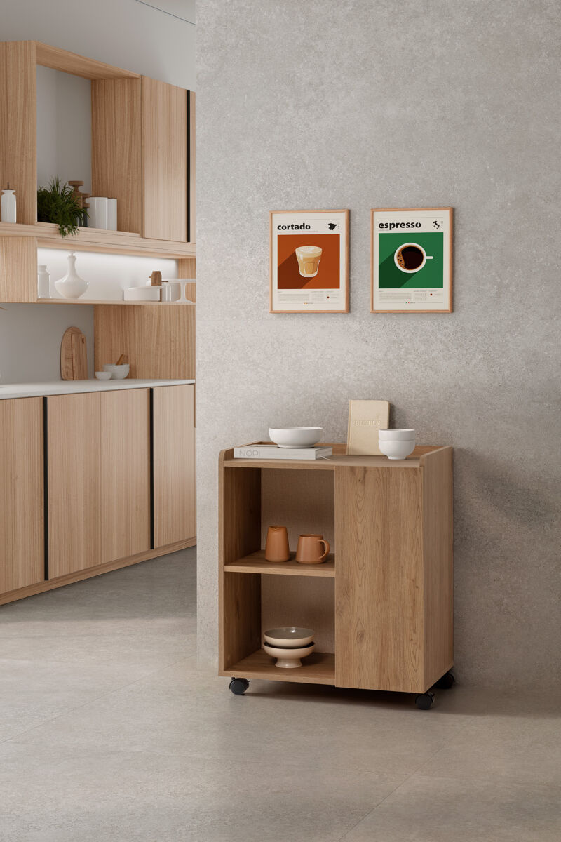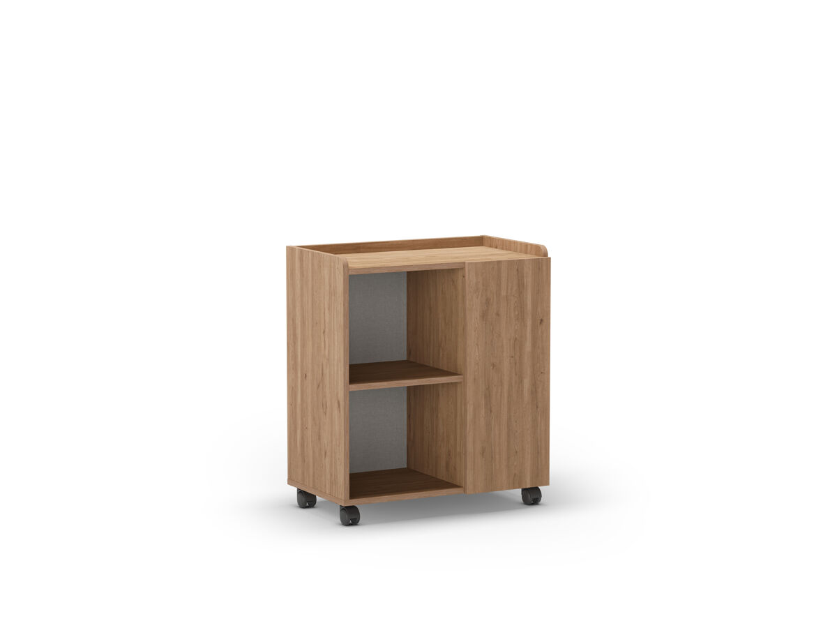 Este móvel lateral é funcional e contemporâneo. Apresenta um acabamento que evoca o calor e a textura da madeira natural. O móvel está equipado com um espaço de arrumação fechado, ideal para manter arrumados objetos pessoais ou de escritório.