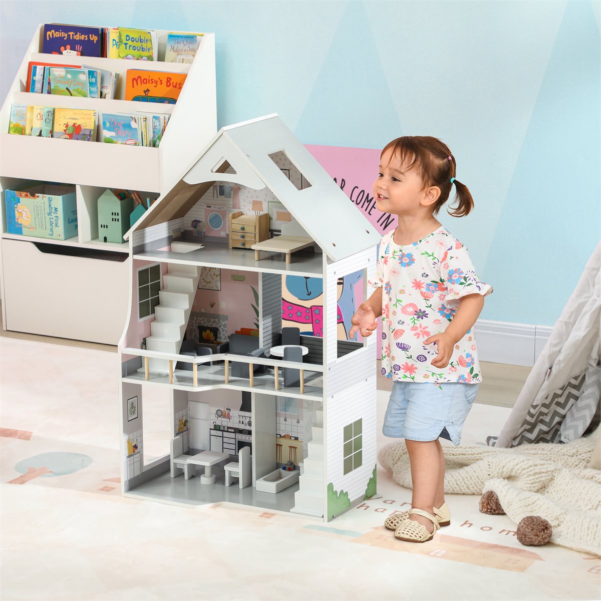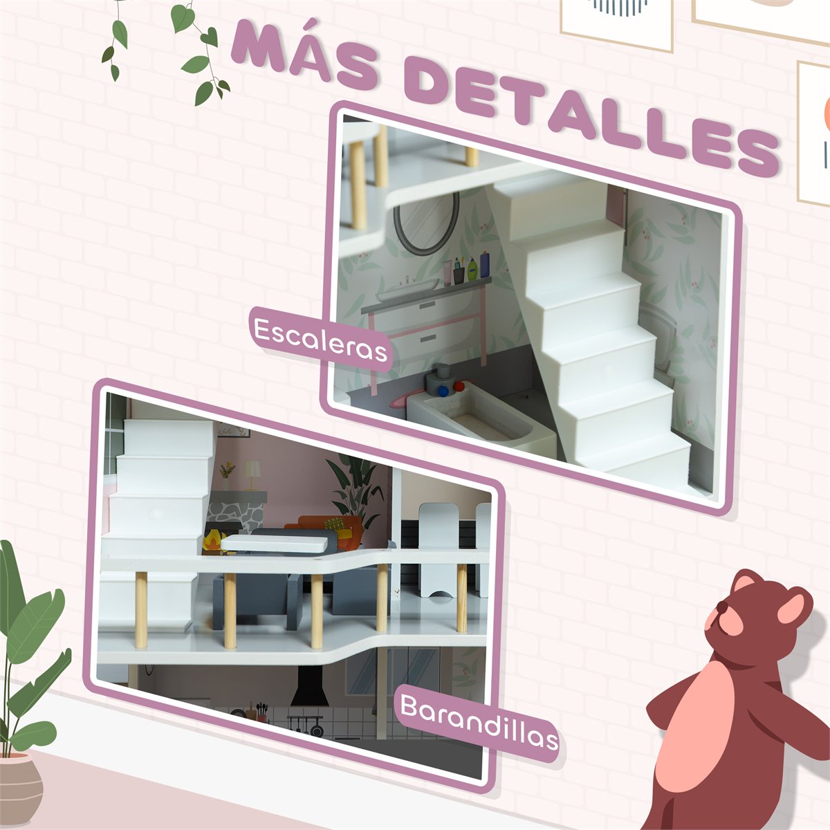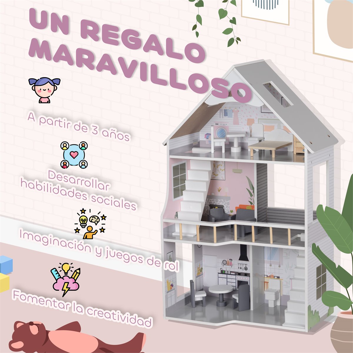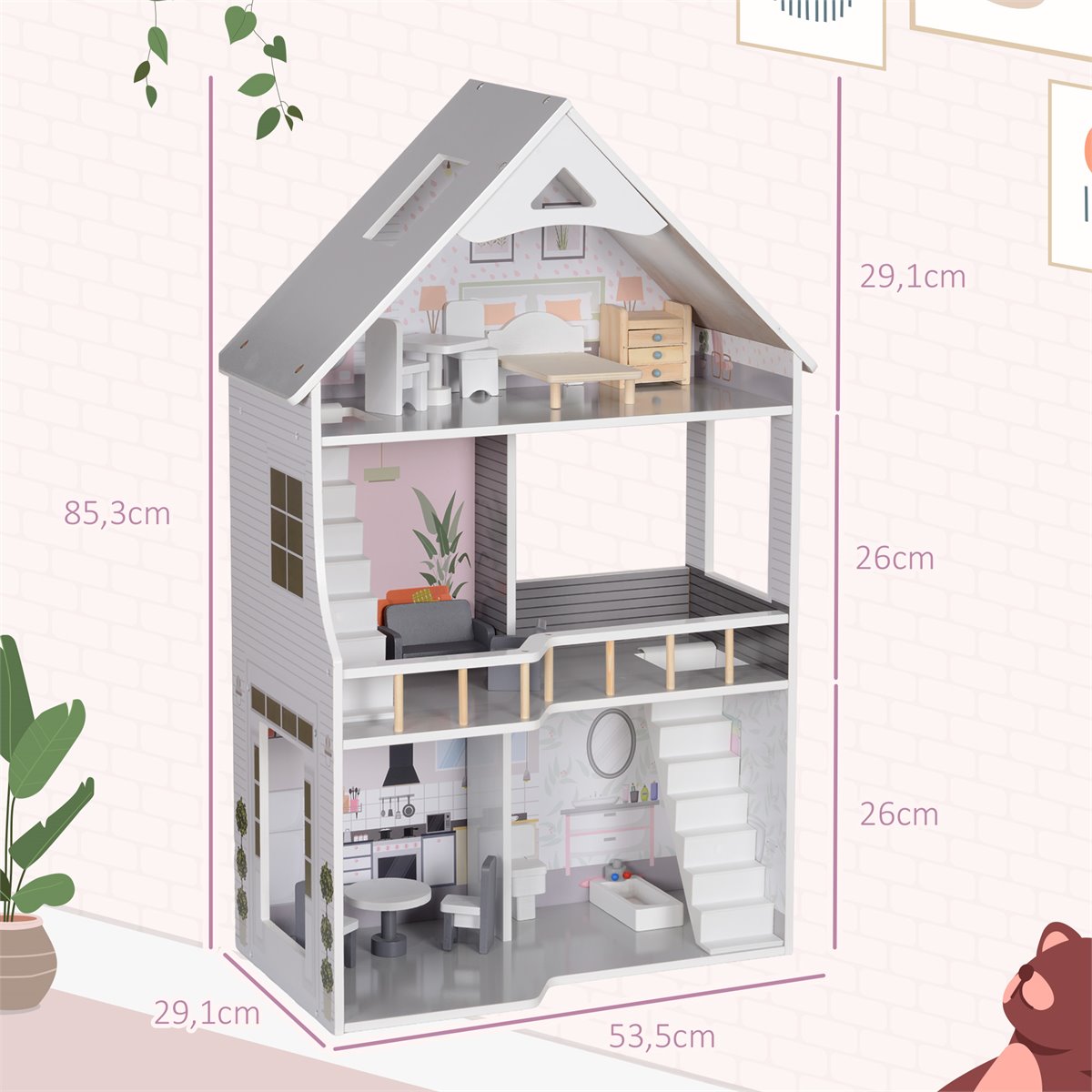 Deixe as crianças descobrirem um mundo de imaginação com esta casa de bonecas para crianças da AIYAPLAY! Com 80 cm de altura e três andares, este brinquedo de madeira vem totalmente mobiliado com 13 peças encantadoras. Ideal para promover habilidades sociais através do jogo compartilhado, é também uma excelente maneira de estimular a criatividade e a interação. Com um desenho aberto e espaçoso, esta casa de bonecas de madeira garante horas de diversão e aventuras para os pequenos Características: - Casa de bonecas com altura de 80 cm, ideal para crianças pequenas - Possui 3 andares e está completamente mobiliado - Inclui 13 peças de móveis e acessórios para criar histórias incríveis - Presente perfeito para desenvolver habilidades sociais e promover o jogo compartilhado - Estimula a criatividade e a imaginação das crianças, permitindo que elas criem e personalizem seus próprios cenários e histórias - Fabricada em MDF, atende às normas EN71-1-2-3 e EN16516 para segurança garantida - Requer uma montagem rápida e simples Especificaciones: - Cor: Multicor - Material: MDF e madeira de pinho - Medidas totais: 53,5x29,1x85,3 cm (CxLxA) - Altura do chão: 26 cm, 26 cm, 29,1 cm (de baixo para cima) - Medidas da varanda: 22x21,8x9,5 cm (CxLxA) - Idade certificada: acima de 3 anos - Idade recomendada: 3 a 6 anos - Em conformidade com as normas: EN71-1-2-3, EN16516 - Referência: 350-174V00GY O pacote inclui: - ● 1 x Casa de bonecas; ● 13 x Peças de mobiliário; ● 1 x Manual de instruções;