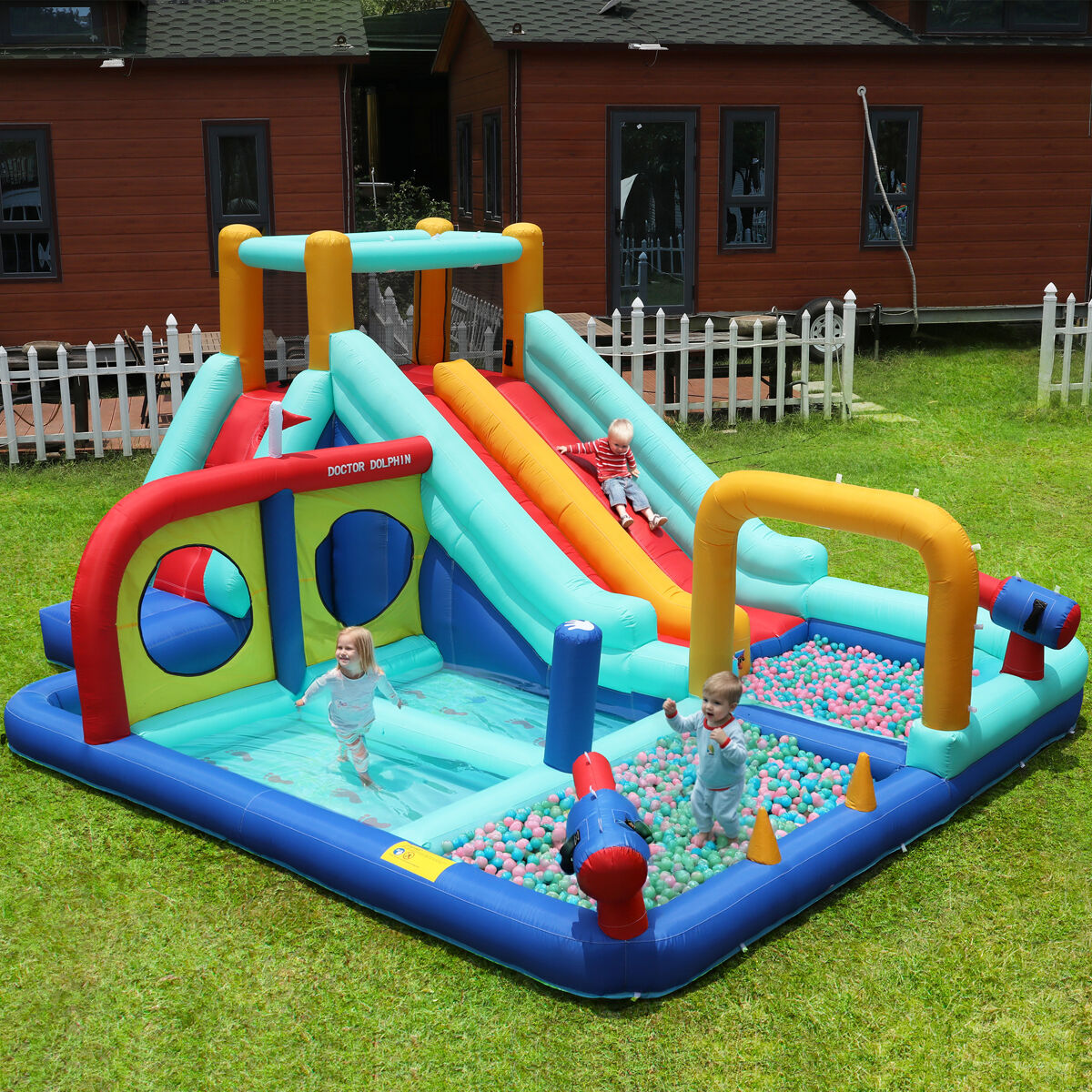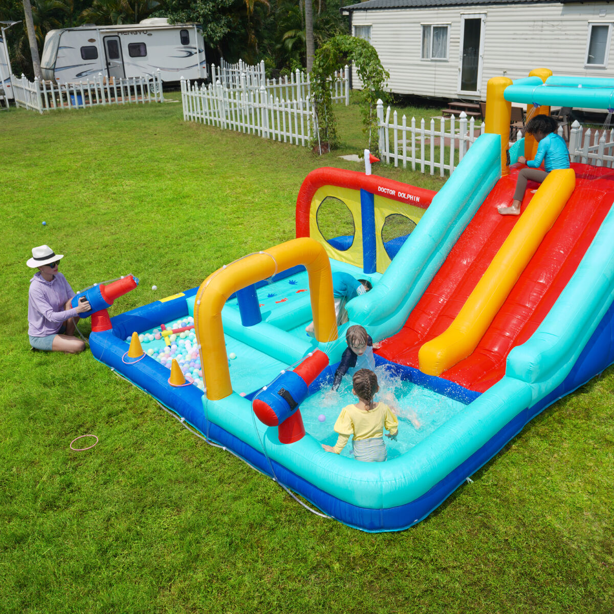 Experiência de brincadeira multifuncional – Combina dois escorregas aquáticos, fontes, pistolas de água, paredes de escalada, postes de boxe, túneis, jogos de lançamento de argolas e muito mais para proporcionar diversão interminável às crianças!