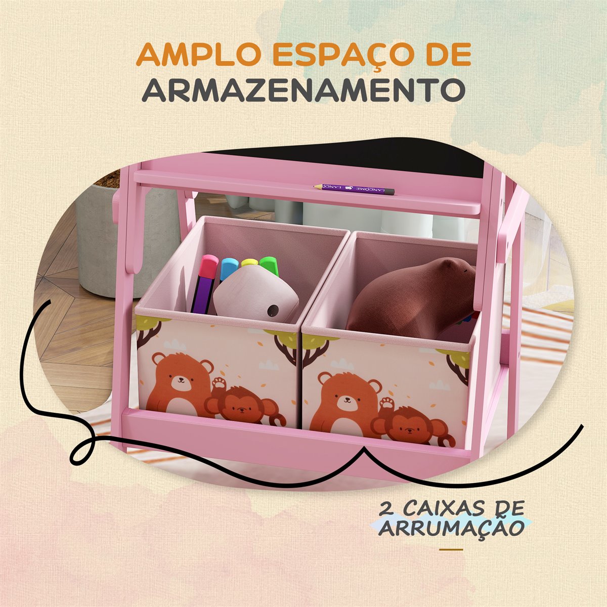 Estimule a criatividade do seu pequeno com este cavalete 2 em 1 da AIYAPLAY. Com um lado de ardósia e outro de quadro branco, é ideal para incentivar a imaginação e o talento artístico dos pequenos. Além disso, conta com duas práticas caixas para organizar os materiais de arte. Perfeito para pintar, desenhar e jogos educativos, este encantador cavalete proporciona horas de entretenimento e aprendizado Características: - Cavalete para crianças com desenho 2 em 1 - Possui uma ardósia de um lado e um quadro branco do outro, ideais para incentivar a criatividade dos pequenos artistas - As 2 caixas de arrumação são ideais para organizar os materiais de arte - Possui uma bonita cor rosa com um encantador desenho de animais selvagens - Fabricado em MDF resistente e ideal para uma utilização prolongada - A estrutura em forma de “A” certifica uma maior estabilidade e segurança - Requer montagem Especificaciones: - Cor: Rosa - Material: MDF e tecido não tecido - Medidas totais: 53,5x49x113 cm (CxLxA) - Medidas da prateleira: 47x32 cm (CxL) - Caixa de arrumação: 34x23x20 cm (CxLxA) - Carga máxima: 0,5 kg (por caixa) - Idade certificada: 3+ anos - Idade recomendada: 3-8 anos - Certificações: EN71-1-2-3 - Referência: 3B0-016V80PK O pacote inclui: - ● 1 x Cavalete para crianças; ● 2 x Caixas de arrumação; ● 1 x Manual de instruções