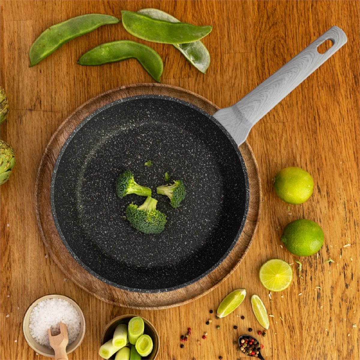 Fritadeira de 24 cm de alumínio forjado de alta qualidade, conta com 6 camadas e revestimento antiaderente Select Teflon™ Nonstick Coating, livre de PFOA, com fundo difusor de calor Full Induction, apta para máquina da louça e para todos os tipos de fogões, incluindo indução. Fundo indeformável de 5 mm de espessura. Frigideira de 24 cm de diâmetro.