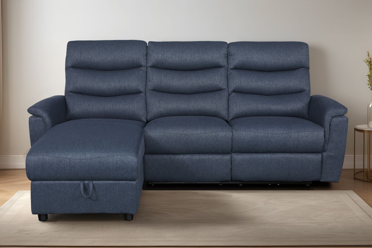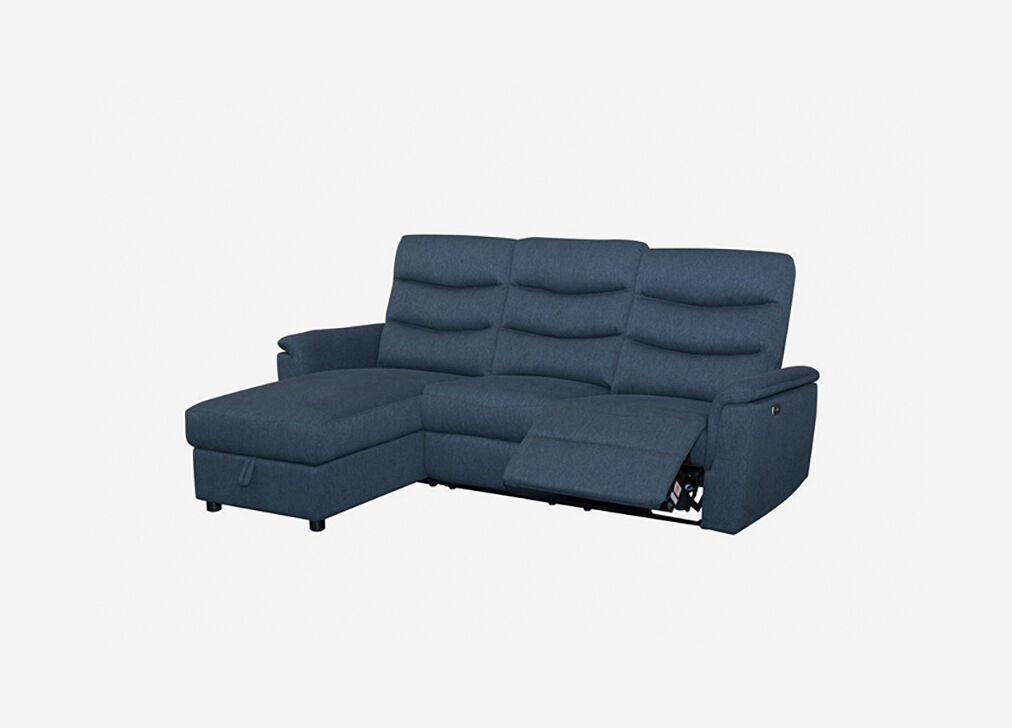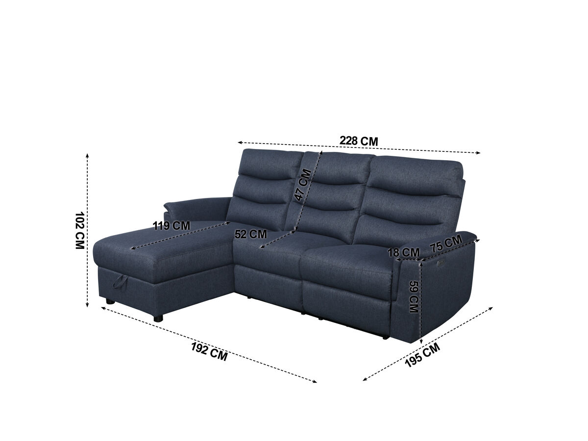 Chaisse Lounge com poltrona reclinável elétrica, apoio de cabeça, ajustável manualmente, com baú de armazenamento e interruptor USB. Com forro 100% poliéster e uma estrutura em madeira de pinho e contraplacado. Suspensão: Molas Zig Zag e correias NEA. Densidade da espuma nos assentos 28 Kg/m3. Pernas de plástico. Adquira o seu Chaise longue relax elétrico FAMILY lado esquerdo cor azul na Conforama!!!