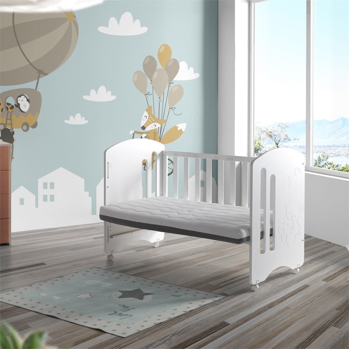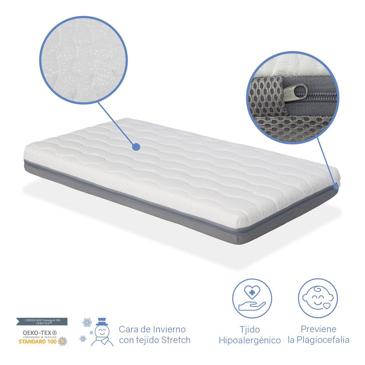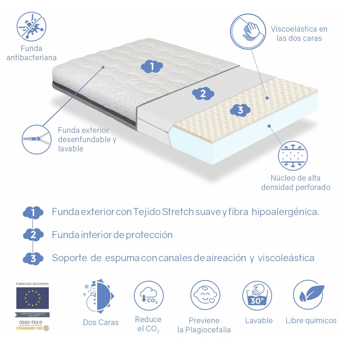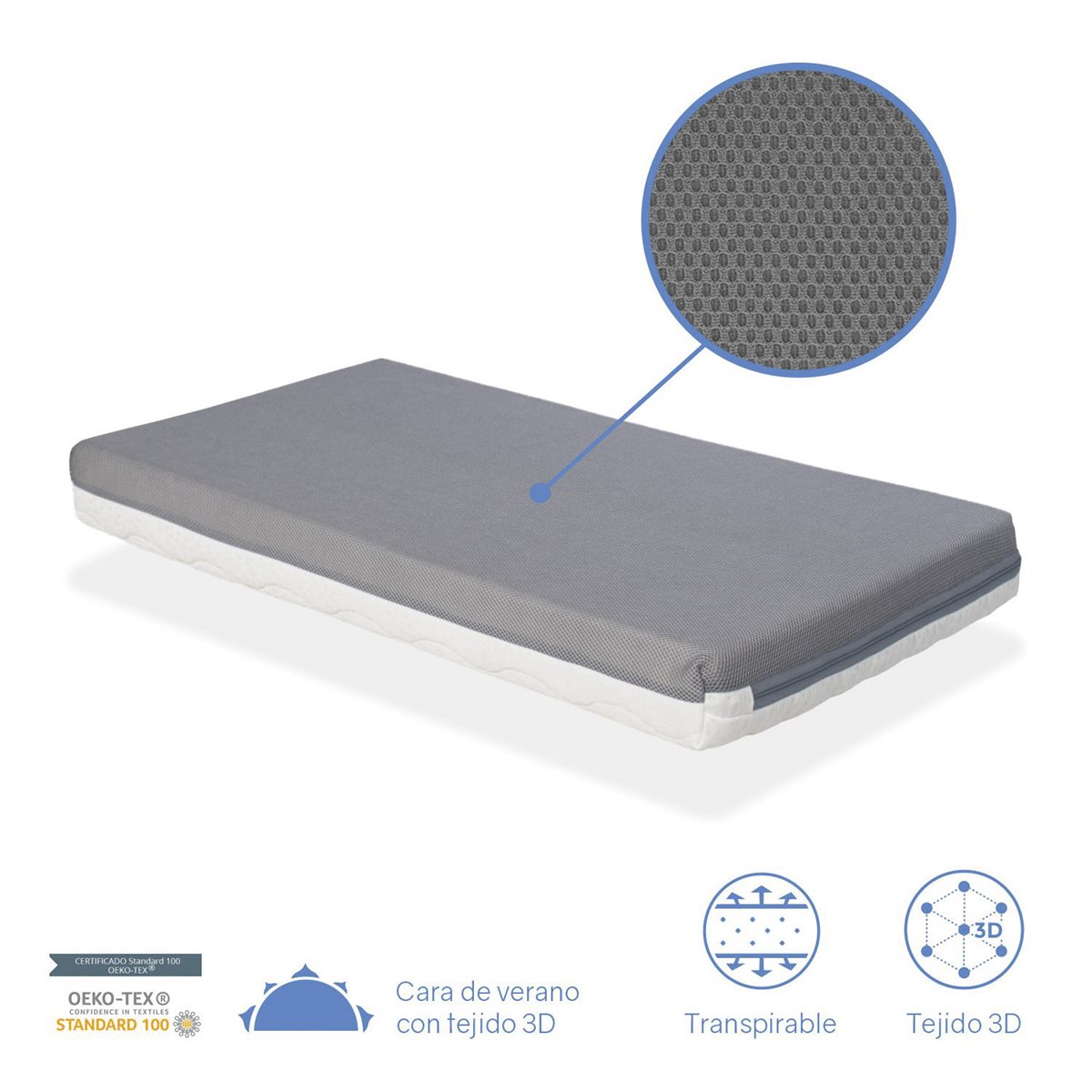 Colchão removível. Possui duas tampas. A capa externa é feita de tecido elástico macio e elástico em sua face superior. É acolchoado com fibras anti-ácaros que combatem naturalmente a proliferação de alergias e ajudam a proteger o descanso do nosso bebé. A face inferior é feita de tecido 3D altamente respirável que ajuda a reduzir o calor e o acúmulo de CO2. Também possui uma capa interna feita de tecido protetor multielástico para facilitar a remoção e proteger a espuma.