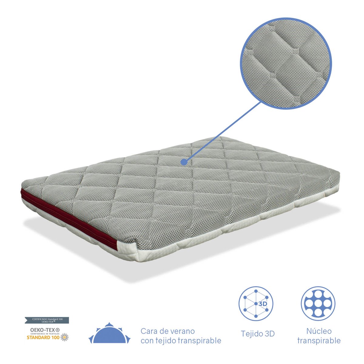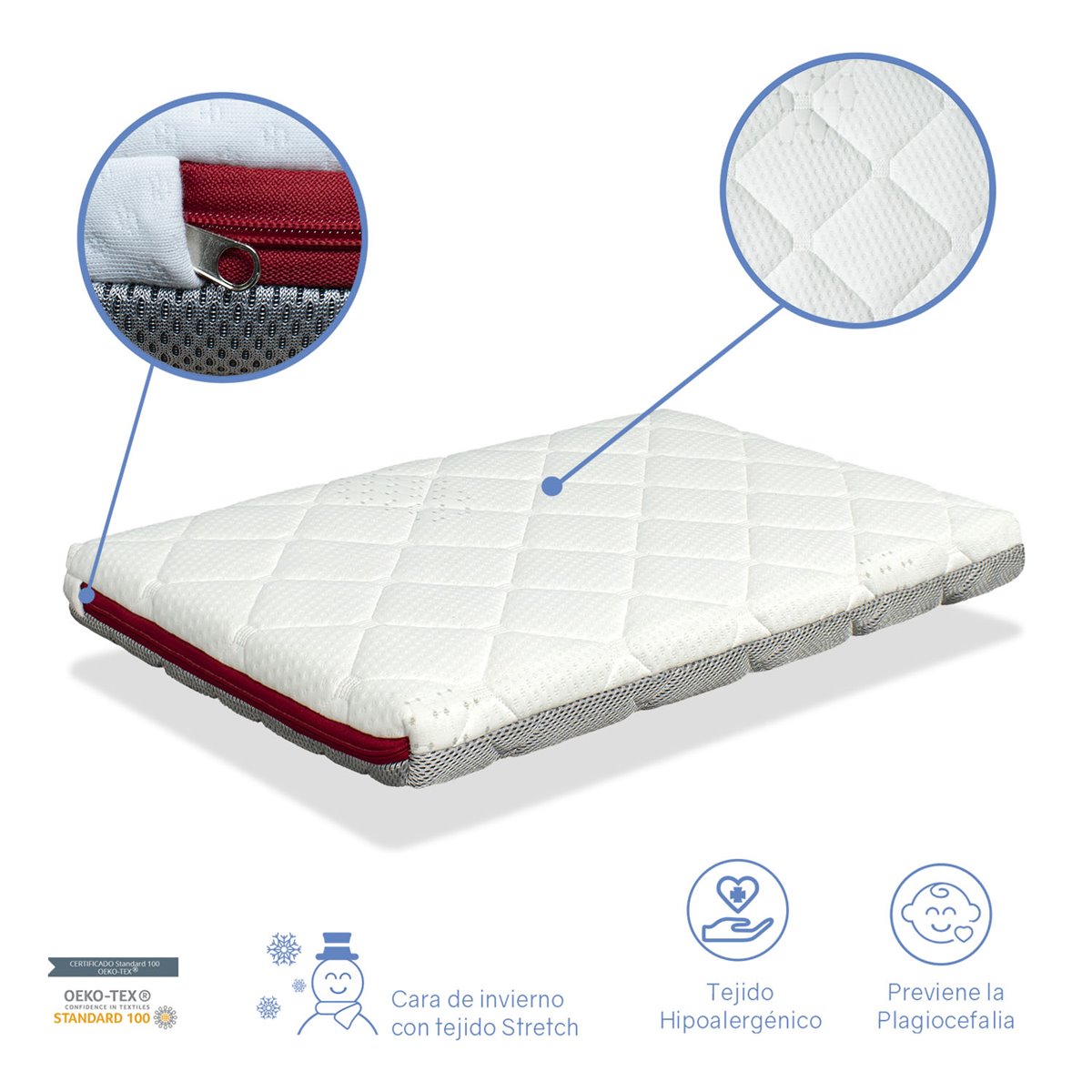 Colchão removível. Possui duas tampas. A capa externa é feita de tecido elástico macio e elástico em sua face superior. É acolchoado com fibras anti-ácaros que combatem naturalmente a proliferação de alergias e ajudam a proteger o descanso do nosso bebé. A parte inferior é feita de tecido 3D altamente respirável que ajuda a dissipar o calor. Também possui uma capa interna feita de tecido protetor multielástico para facilitar a remoção e proteger a espuma.