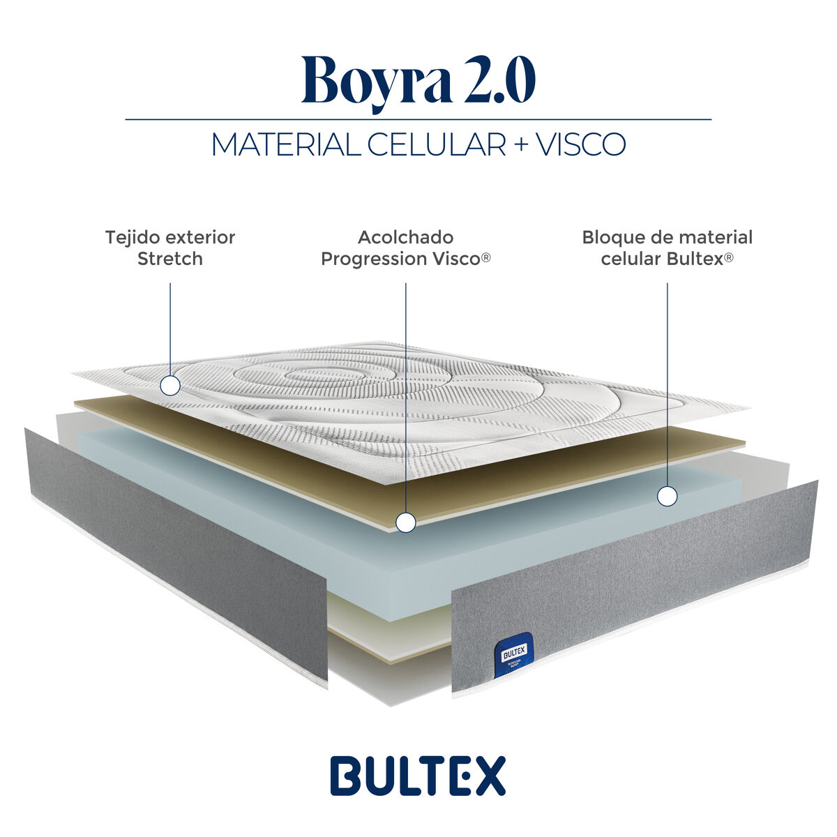 O colchão Boyra 2.0 é composto por um núcleo de espuma Bultex com enchimento Progression Visco® e uma camada Progression Fiber®. O seu núcleo de espuma Bultex, o material mais elástico e inovador para o descanso, permite uma posição perfeita das costas durante o sono, bem como uma primeira receção agradável do corpo graças à sua capacidade de se adaptar a cada peso e morfologia. A camada Progression Visco® é uma combinação de duas camadas, uma macia e reguladora da temperatura e a outra viscoelástica para reduzir a pressão muscular durante o sono. A sua camada de poliéter proporciona estabilidade e um ponto extra de firmeza ao resto. Todos os colchões com tecnologia Bultex® são tratados com a tecnologia de higiene máxima e permanente Total Barrier®, que impede o desenvolvimento das principais fontes de bactérias num colchão: fungos, ácaros e bactérias.