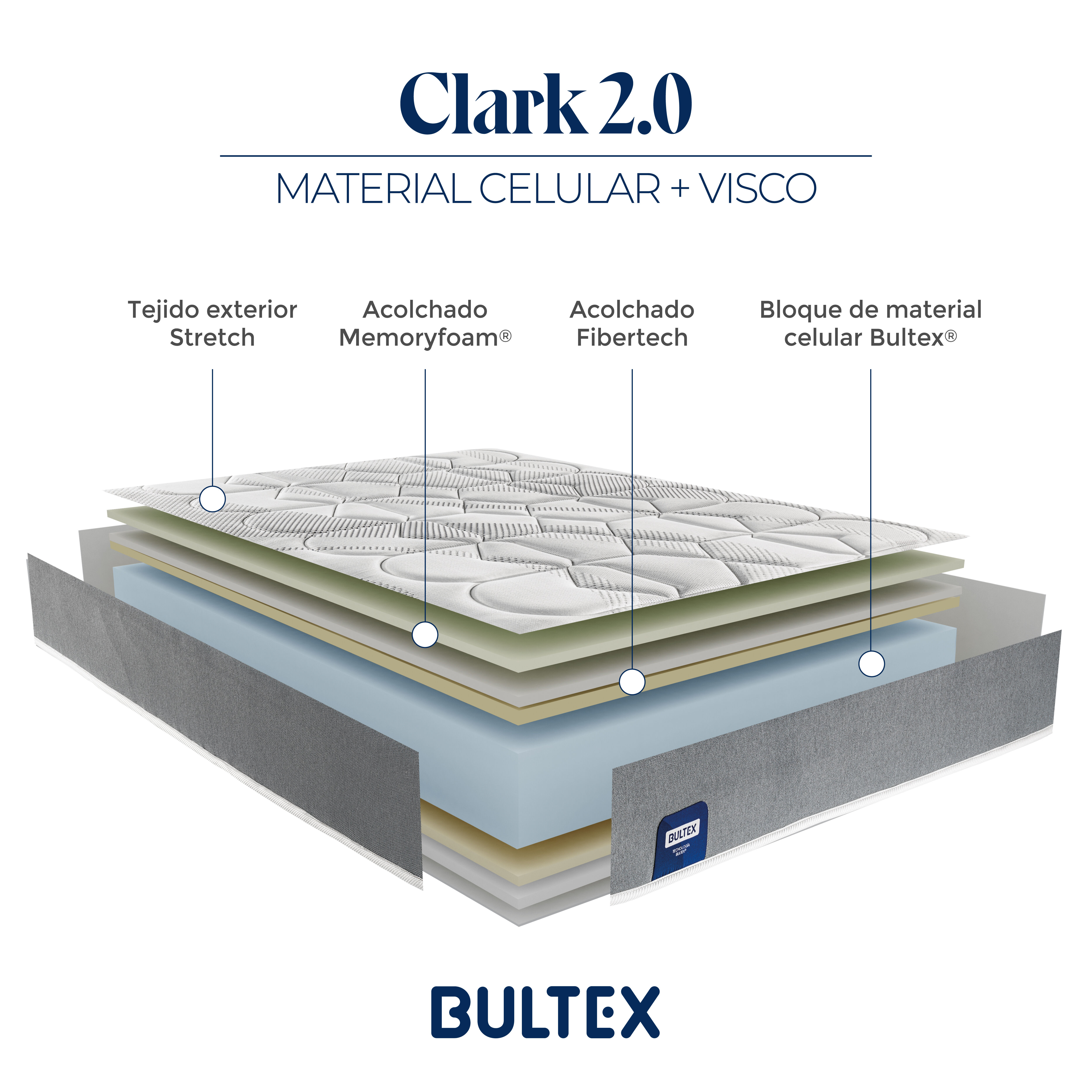 O colchão Clark 2.0 é composto por um núcleo de espuma Bultex perfilada e um estofo Fibertech com uma camada de apoio viscoelástica. O seu núcleo de espuma de alto desempenho permite à pessoa que dorme desfrutar de um conforto com uma firmeza e um equilíbrio suplementares, sem sacrificar uma postura de sono perfeita para as costas. A sua camada de fibra atérmica Fibertech® gera suavidade durante o sono e permite a passagem contínua do ar, optimizando a temperatura e a higiene do colchão durante o repouso. O material viscoelástico MemoryFoam® reduz a pressão muscular durante o sono, aumentando a qualidade do sono. A sua camada de fibras atérmicas Fibertech® gera suavidade durante o sono e permite a passagem contínua do ar, optimizando a temperatura e a higiene do colchão durante o descanso. Todos os colchões com tecnologia Bultex® são tratados com a tecnologia de higiene máxima e permanente Total Barrier®, que impede o desenvolvimento das principais fontes de bactérias num colchão: fungos, ácaros e bactérias.