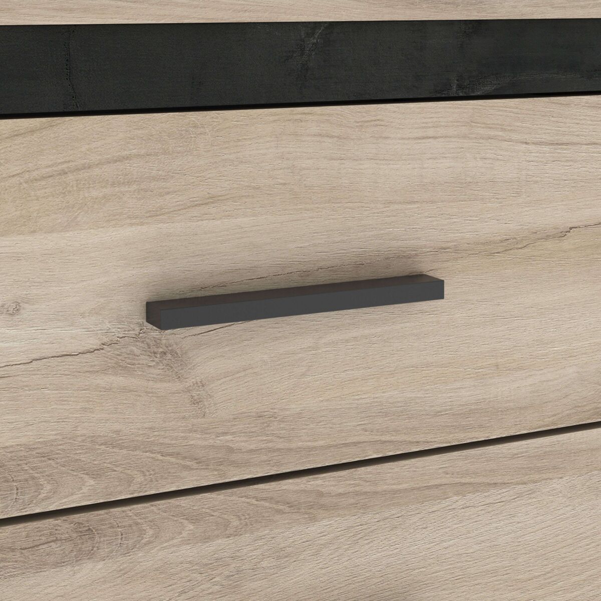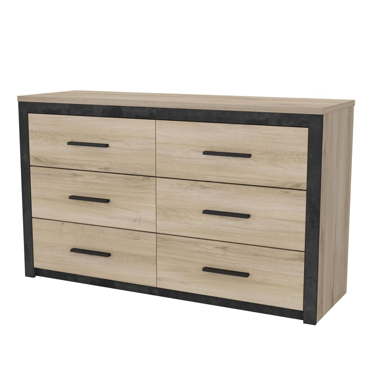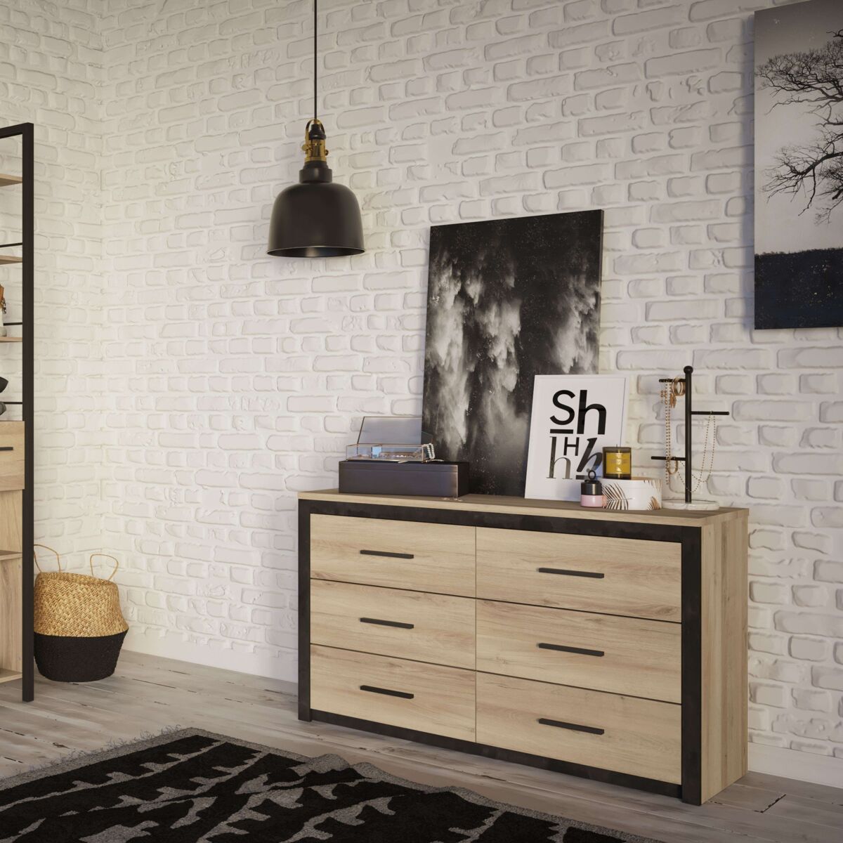 Fantástica cómoda de estilo industrial para a sua sala, quarto ou mesmo para a sua sala, com 6 gavetas, que lhe proporcionará uma arrumação extra e ao mesmo tempo decorará de forma original o espaço onde a colocar. Esta cómoda é feita em melamina de alta qualidade na cor carvalho Kronberg com detalhe em preto calçada à volta das gavetas e puxadores, que fazem com que esta cómoda se destaque do habitual, por isso, se procura uma cómoda diferente, esta é para você. A cama e as mesinhas de cabeceira da imagem não estão incluídas. Medidas: Altura 77'10 cm Largura 129'10 cm Profundidade 41,80 cm. São móveis com kit de montagem, que inclui manual de instruções e parafusos.