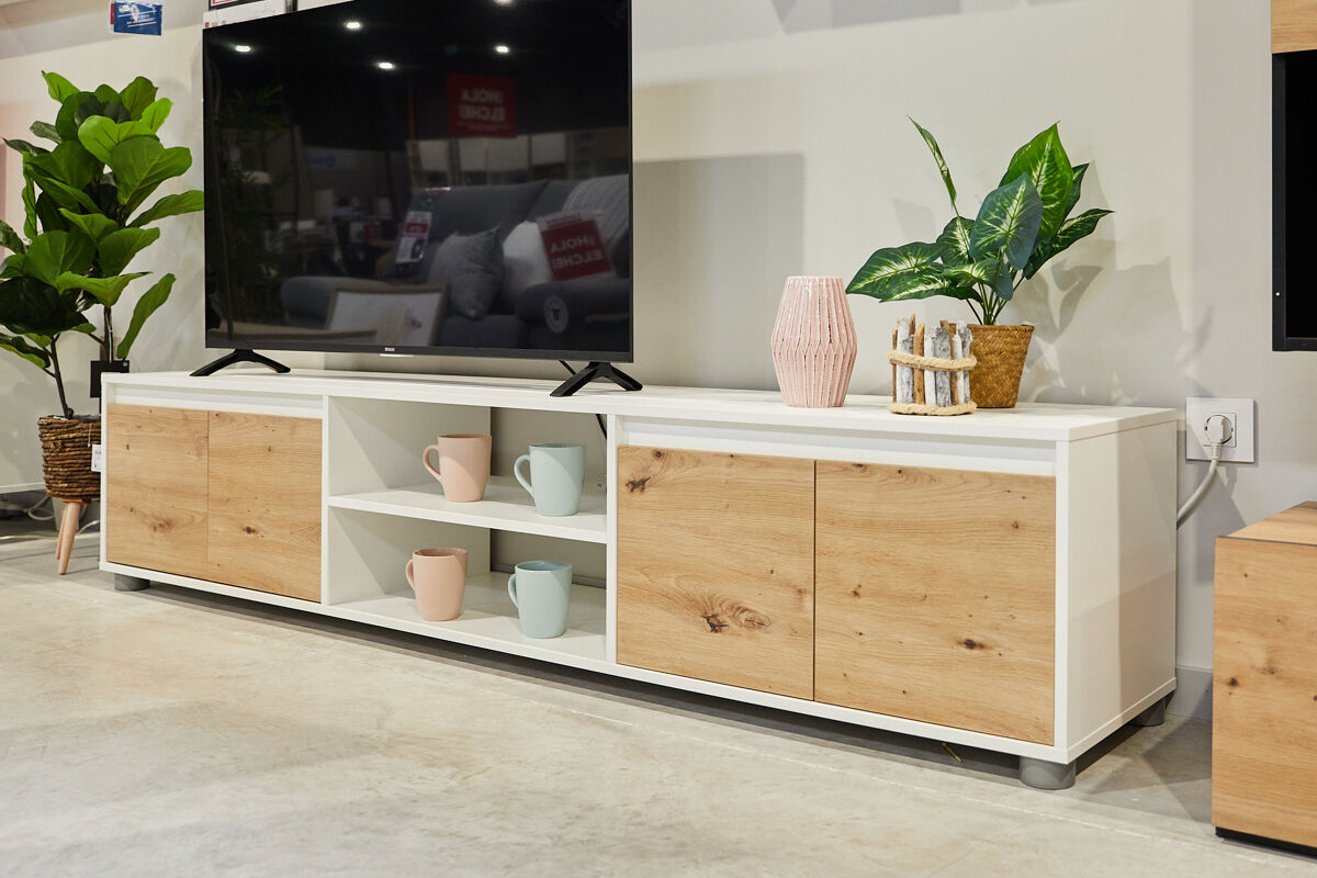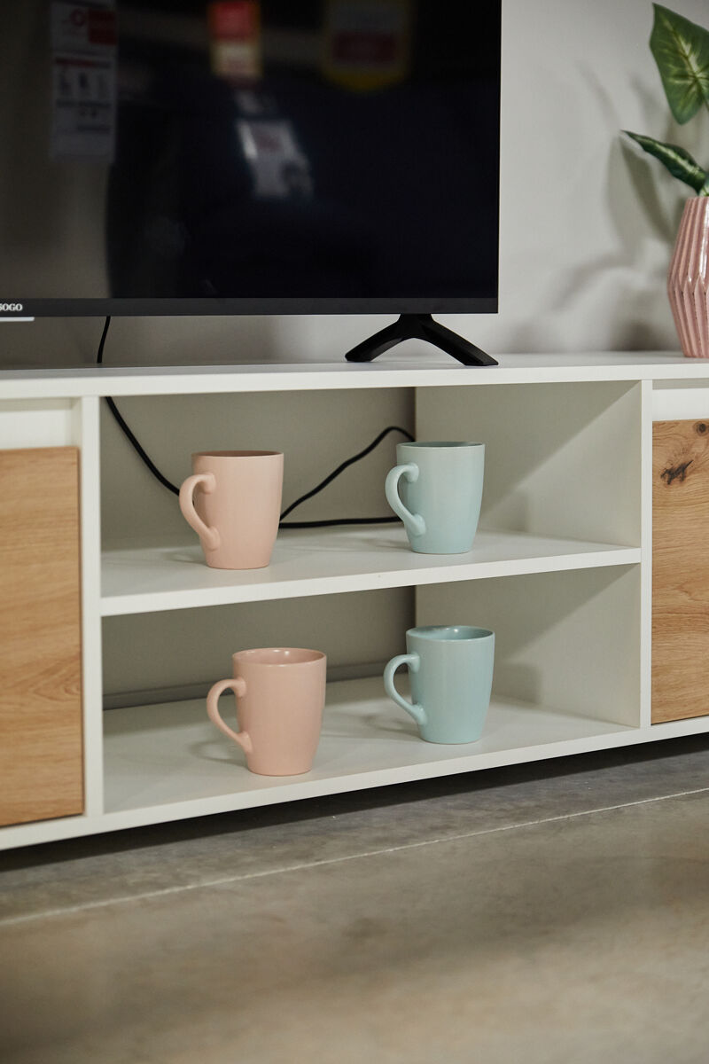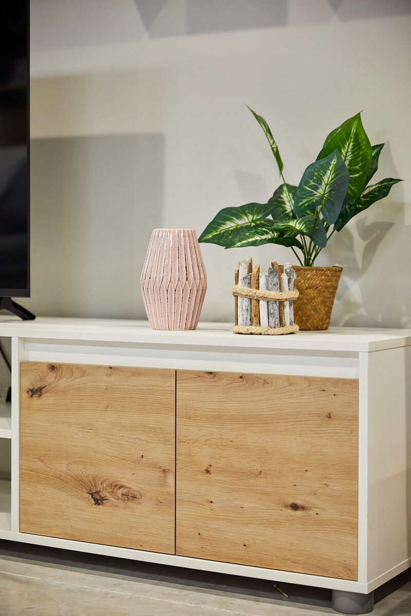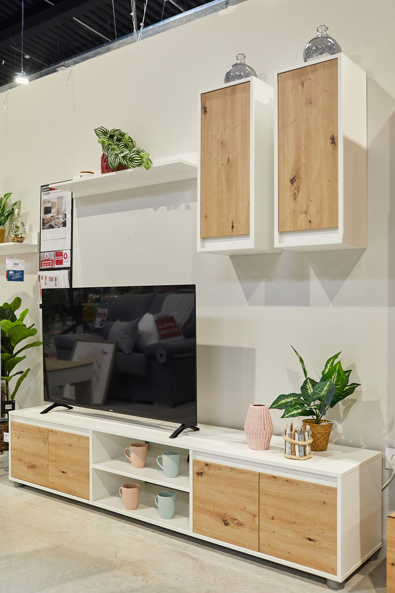 O compacto de TV Yuma é composto por um armário de TV com 4 portas e uma abertura central; dois módulos superiores com uma porta cada um e uma prateleira suspensa. É feito com placa de partículas melanizada. O design combina branco mate com acabamentos em carvalho. É uma bela e funcional peça de mobiliário contemporâneo que pode ser facilmente combinada com outros móveis da sua sala de estar, por exemplo com a mesa de centro Nelly.