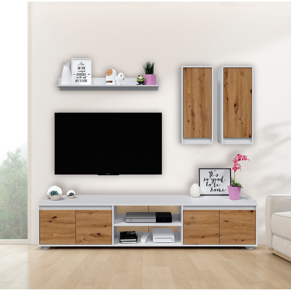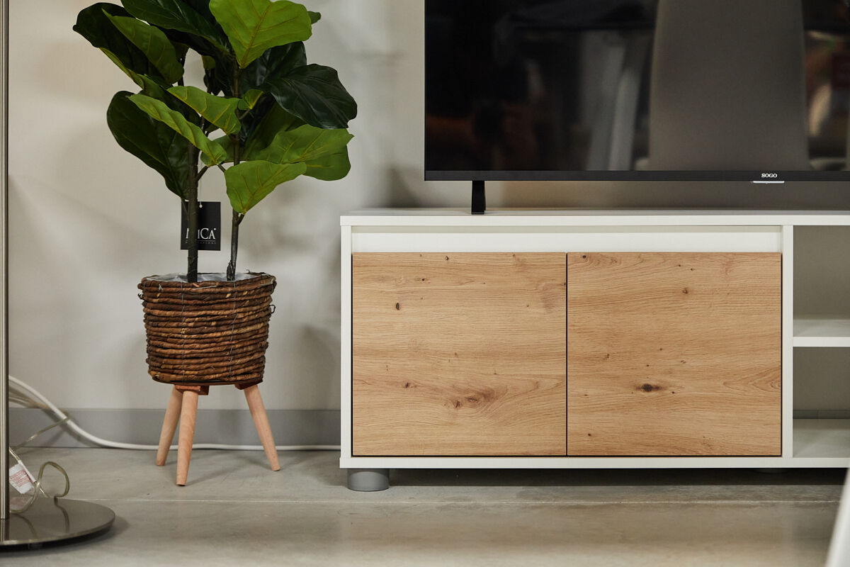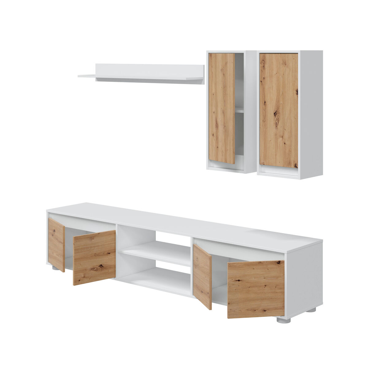 O compacto de TV Yuma é composto por um armário de TV com 4 portas e uma abertura central; dois módulos superiores com uma porta cada um e uma prateleira suspensa. É feito com placa de partículas melanizada. O design combina branco mate com acabamentos em carvalho. É uma bela e funcional peça de mobiliário contemporâneo que pode ser facilmente combinada com outros móveis da sua sala de estar, por exemplo com a mesa de centro Nelly.