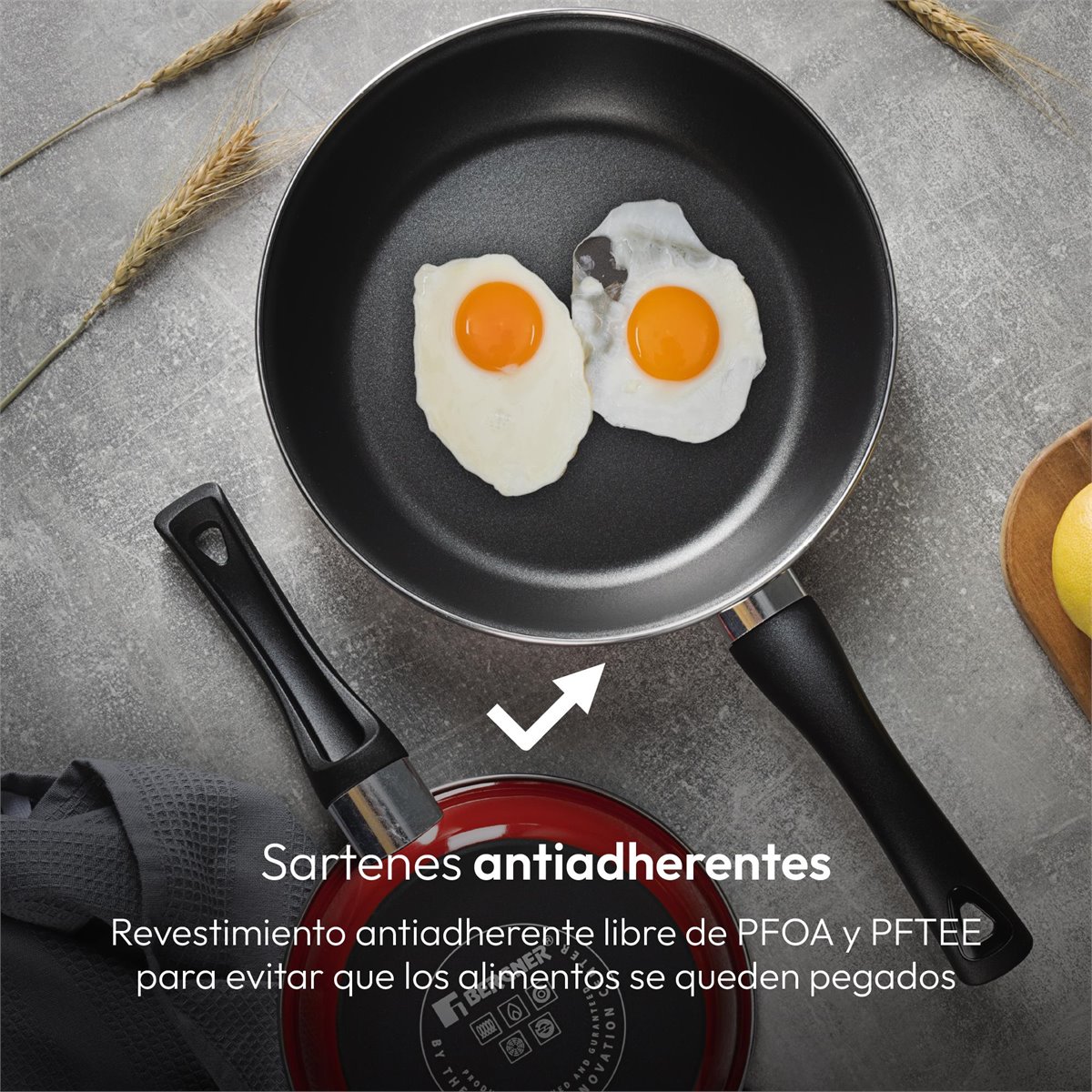 Nosso conjunto é feito de alumínio forjado, um material de máxima resistência e muito ultra-resistente e durável. Além disso, todas as panelas possuem revestimento antiaderente livre de PFOA e PFTEE para evitar que os alimentos grudem.