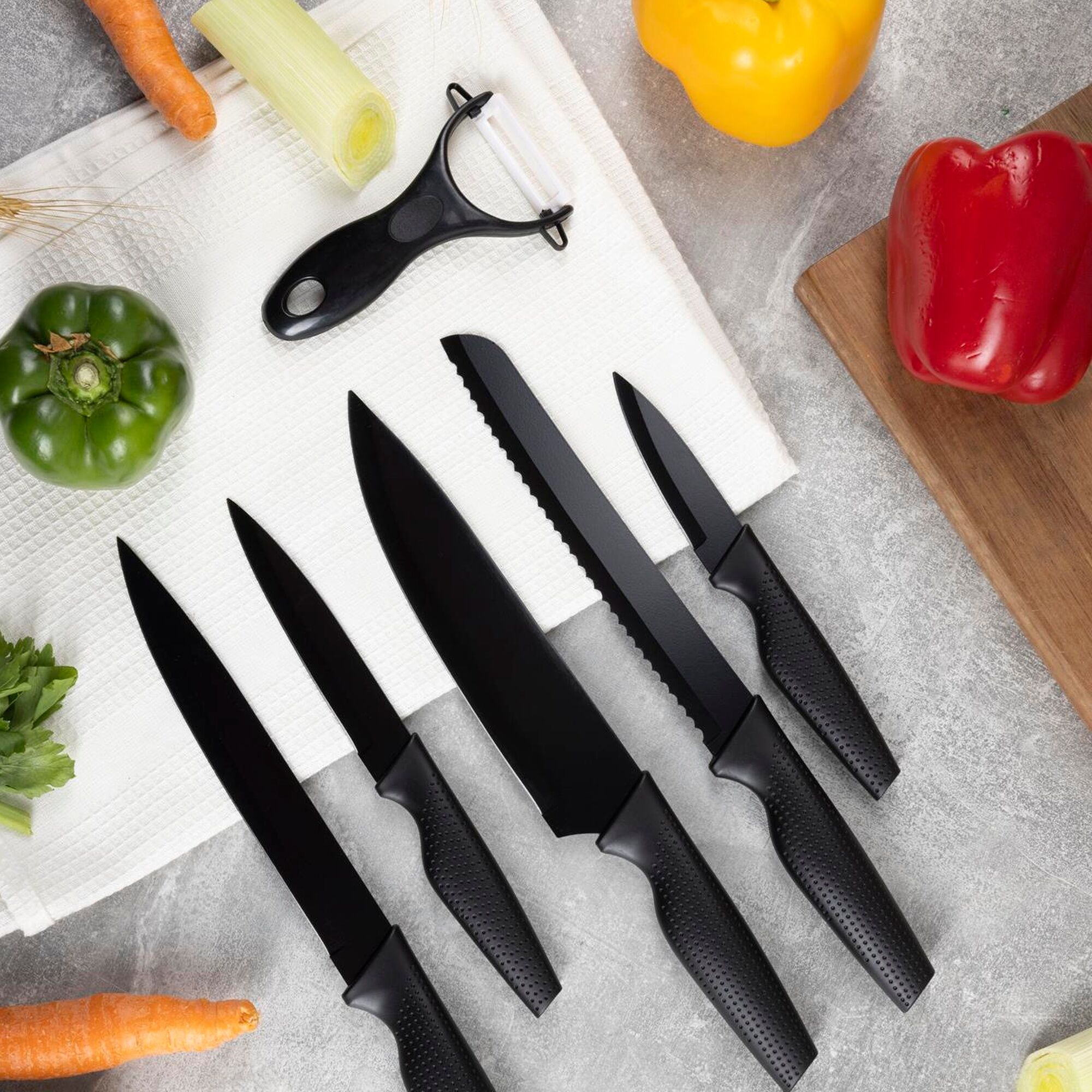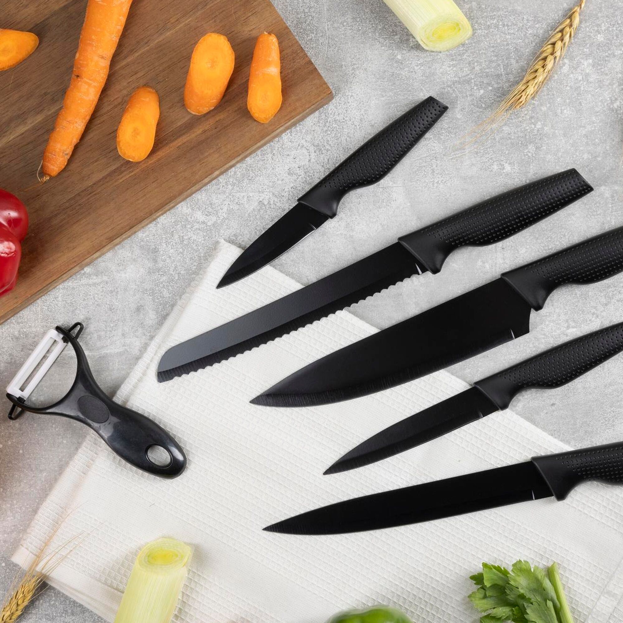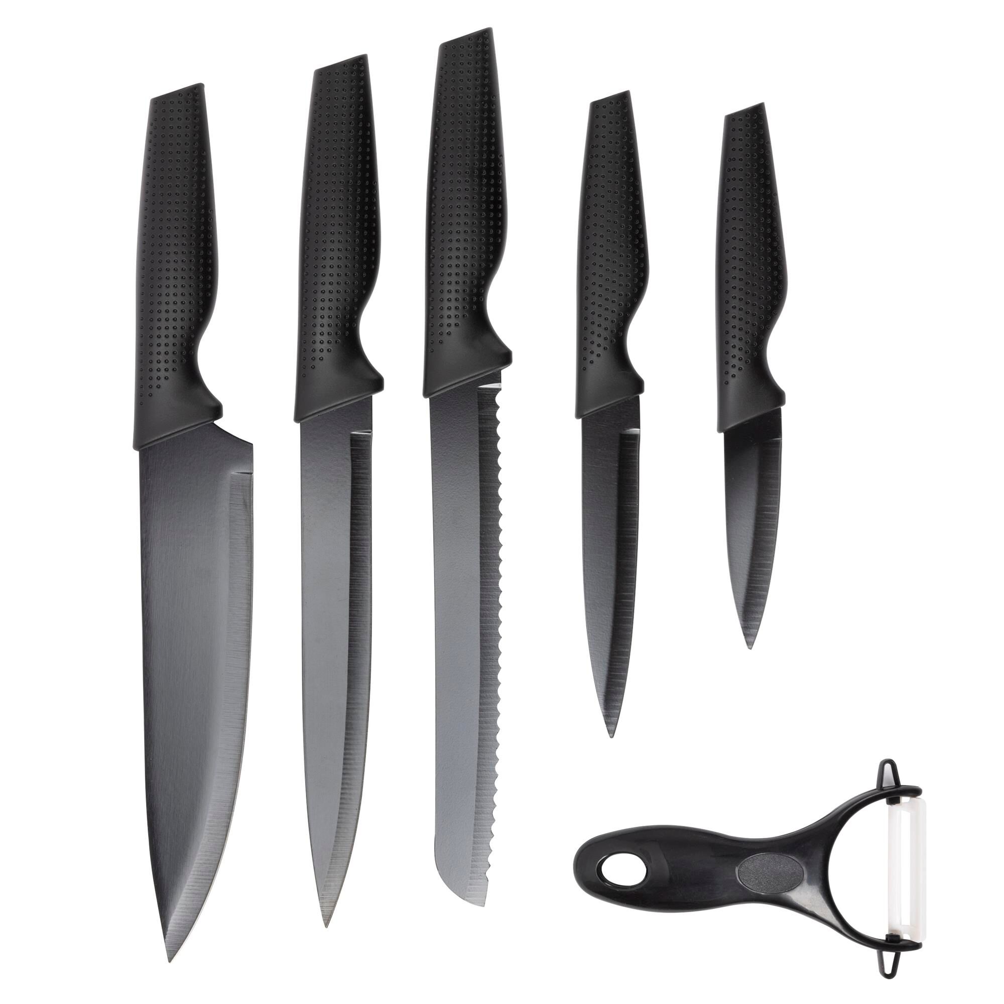 O conjunto inclui: Faca de Chef de 20 cm + Faca de Pão de 20 cm + Faca de Trinchar de 20 cm + Faca Utilitária de 12,5 cm + Descascador de 8,75 cm + Descascador.