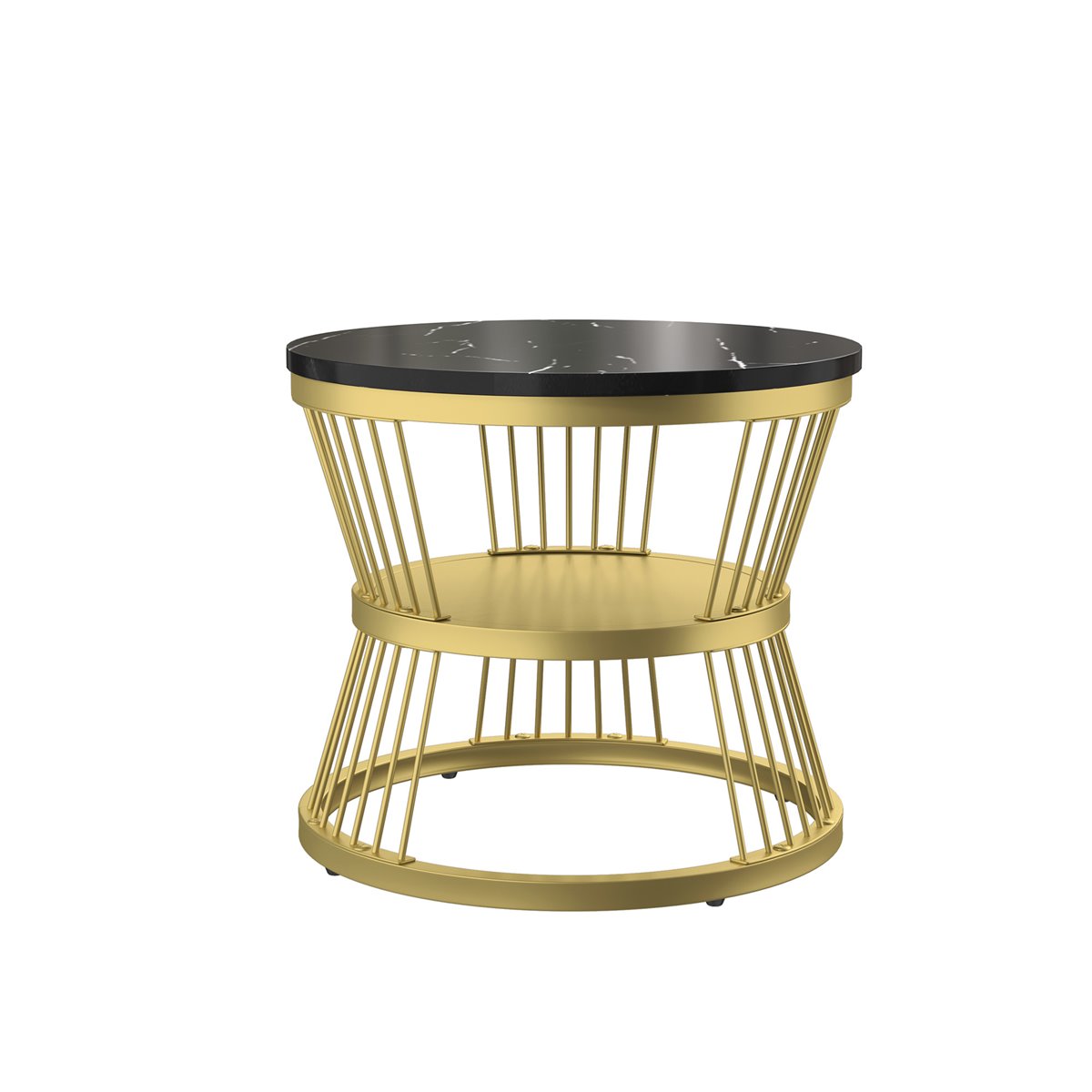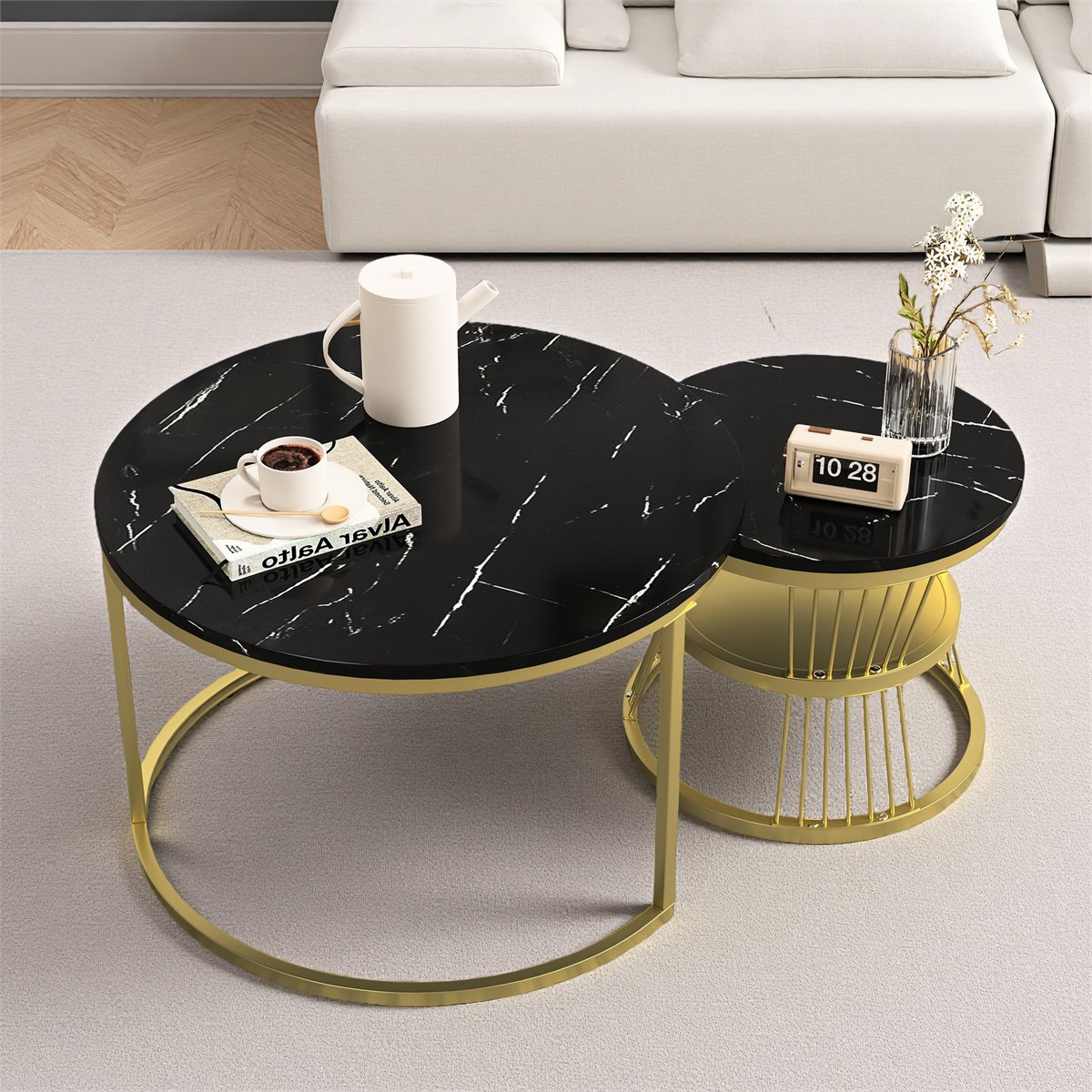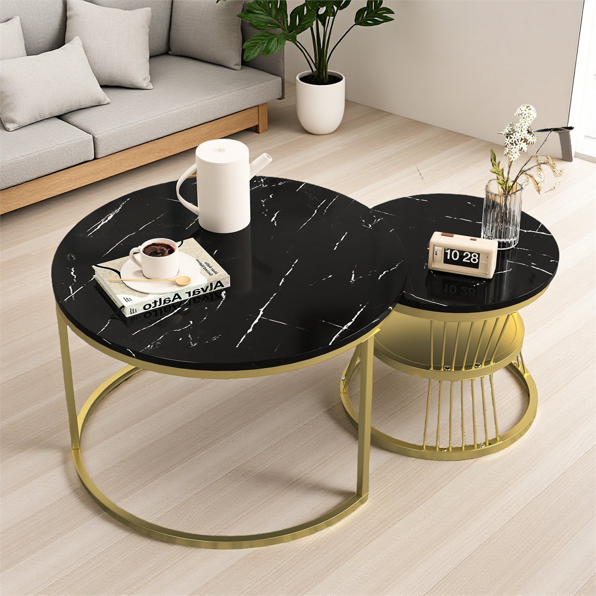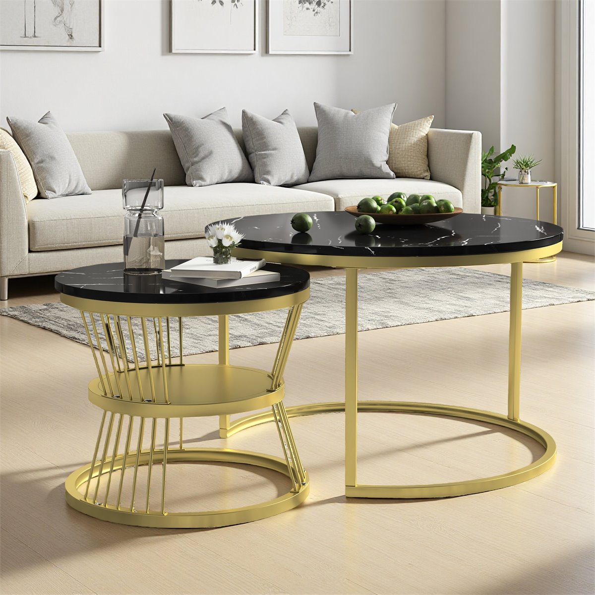Design Luxuoso e Moderno – Conjunto de 2 mesas redondas com tampo preto em efeito mármore e estrutura metálica dourada, ideal para salas elegantes e contemporâneas.