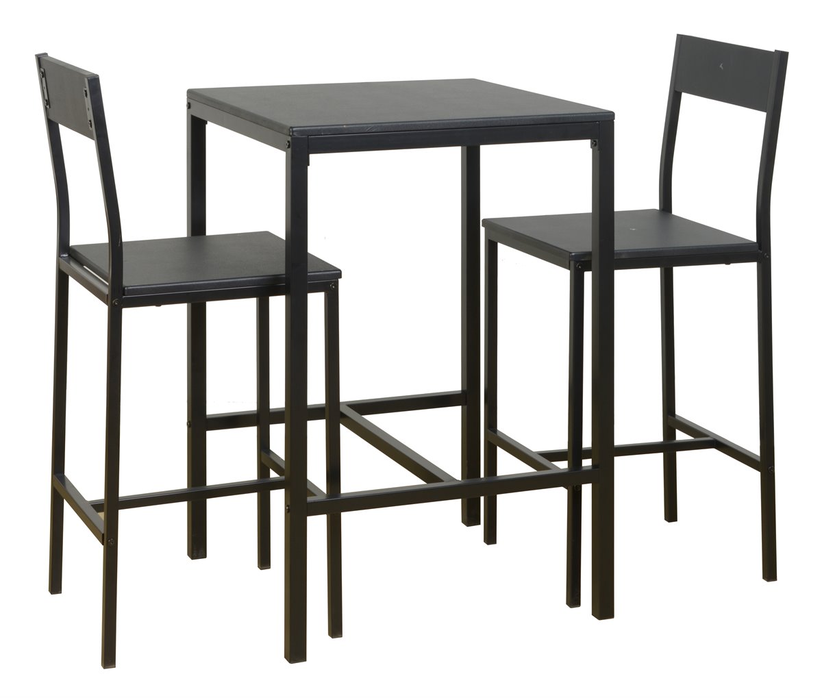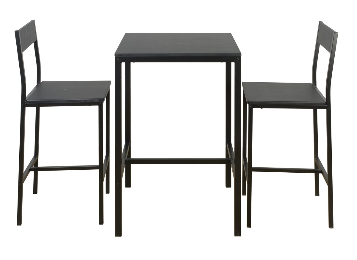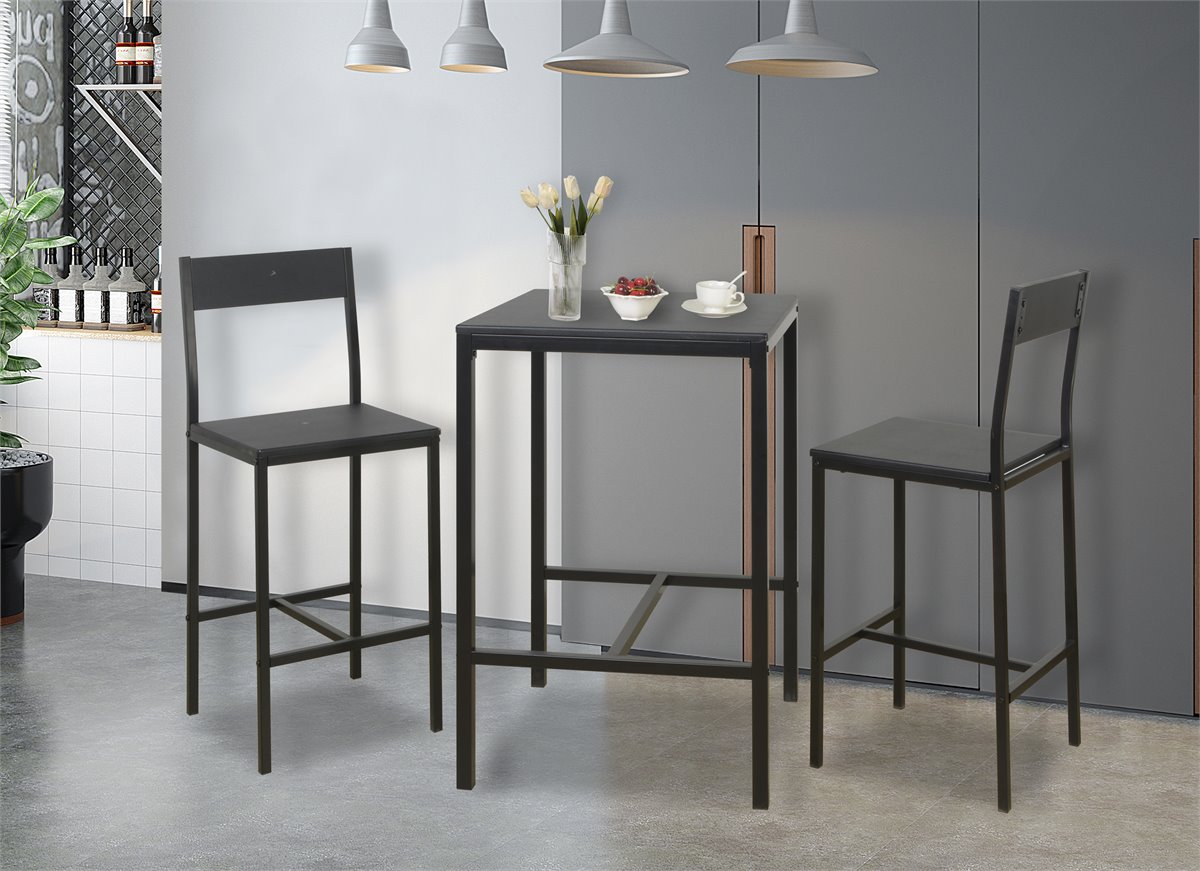 Apresentamos o conjunto de mesa alta + 2 bancos JAMIE. Conjunto de design industrial, elegante e muito resistente. O tampo da mesa e os assentos são fabricados em MDF com cobertura de PVC, a estrutura é fabricada em tubo de aço com revestimento em pó preto. A mesa mede 60x87x60 cm e o banco mede 39,5x95,5x43,5 cm. Este conjunto é perfeito para refeições casuais ou para tomar uma bebida com os seus amigos.