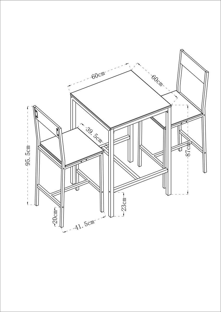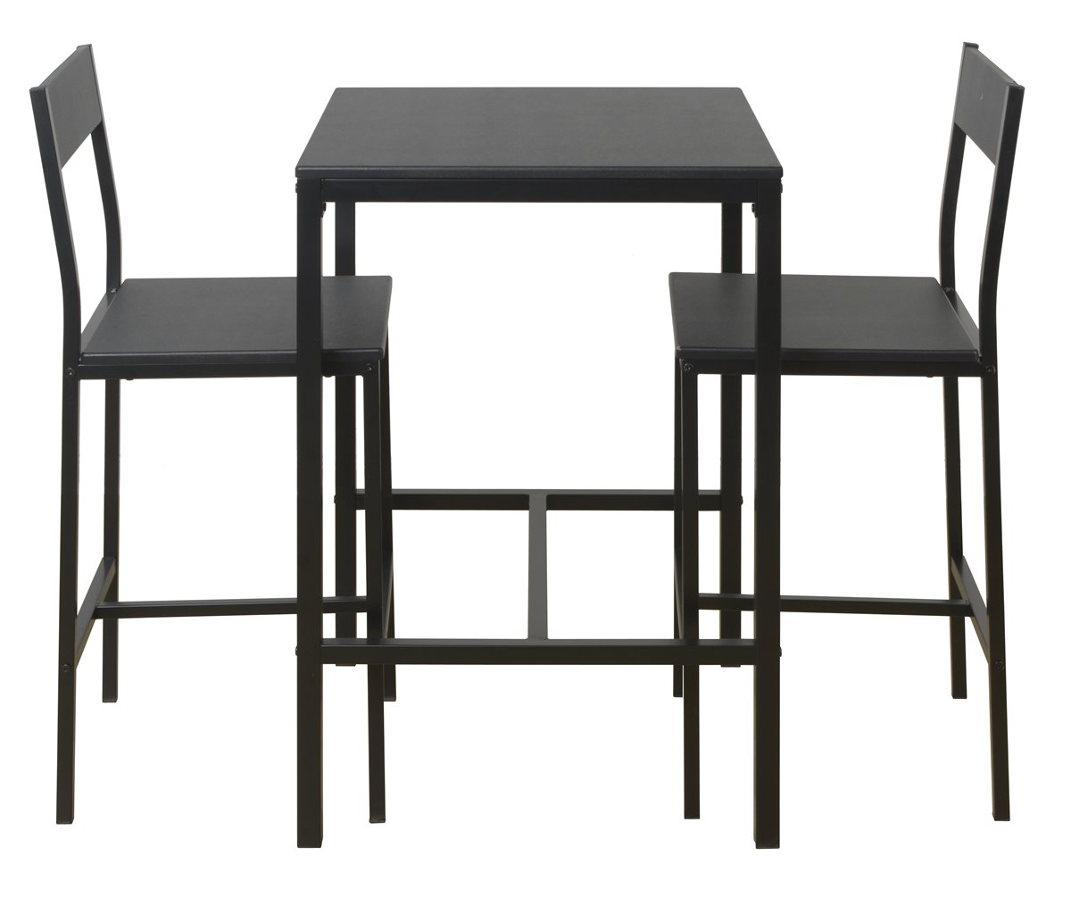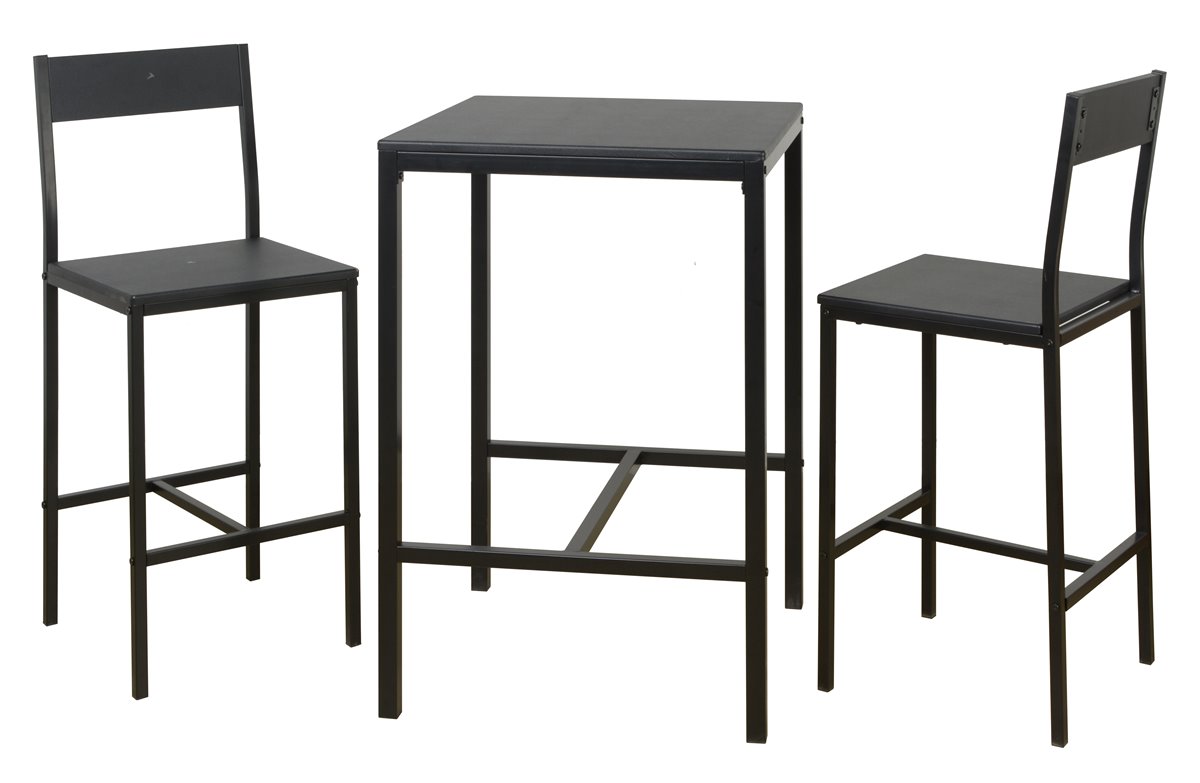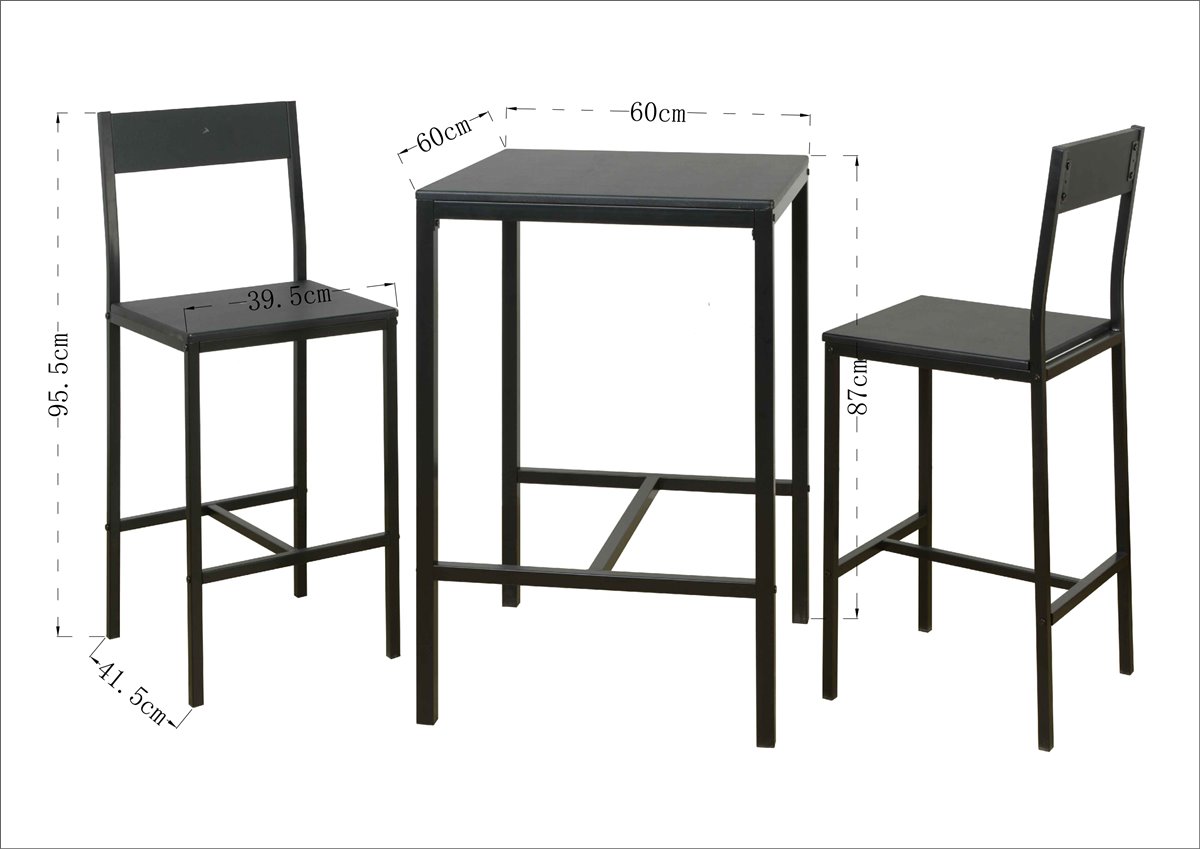 Apresentamos o conjunto de mesa alta + 2 bancos JAMIE. Conjunto de design industrial, elegante e muito resistente. O tampo da mesa e os assentos são fabricados em MDF com cobertura de PVC, a estrutura é fabricada em tubo de aço com revestimento em pó preto. A mesa mede 60x87x60 cm e o banco mede 39,5x95,5x43,5 cm. Este conjunto é perfeito para refeições casuais ou para tomar uma bebida com os seus amigos.