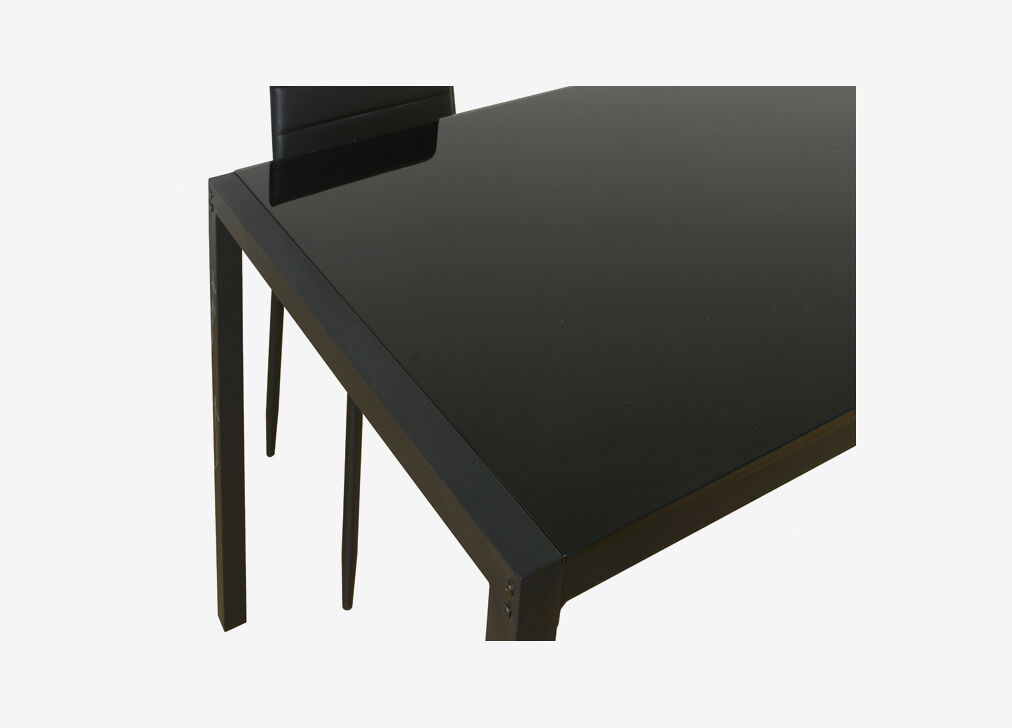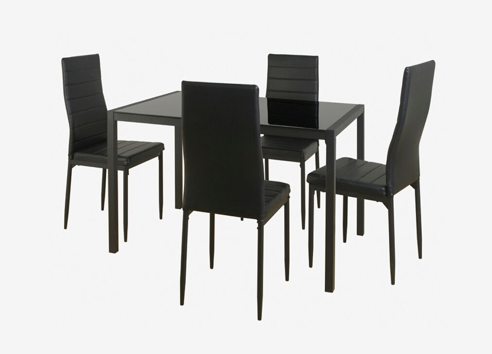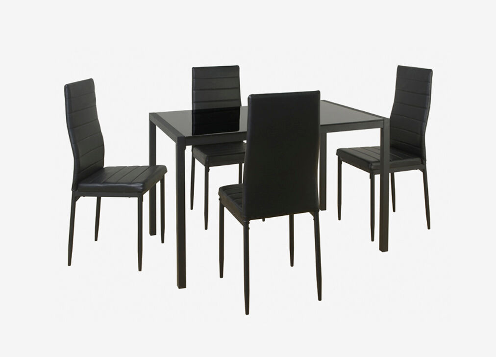 Conjunto de mesa + 4 cadeiras JET. Conjunto sofisticado composto por uma mesa fixa e 4 cadeiras fixas. A mesa é feita de aço preto revestido a pó e bancada de vidro temperado de 8 mm, onde você pode passar momentos inesquecíveis cercado por familiares e amigos. O design moderno das suas cadeiras, fazem com que para além do estilo, o conforto seja uma das suas características a destacar. Escolha o conjunto JET e poderá desfrutar de uma grande mesa de 120x80 cm e 4 cadeiras estofadas em PVC preto.