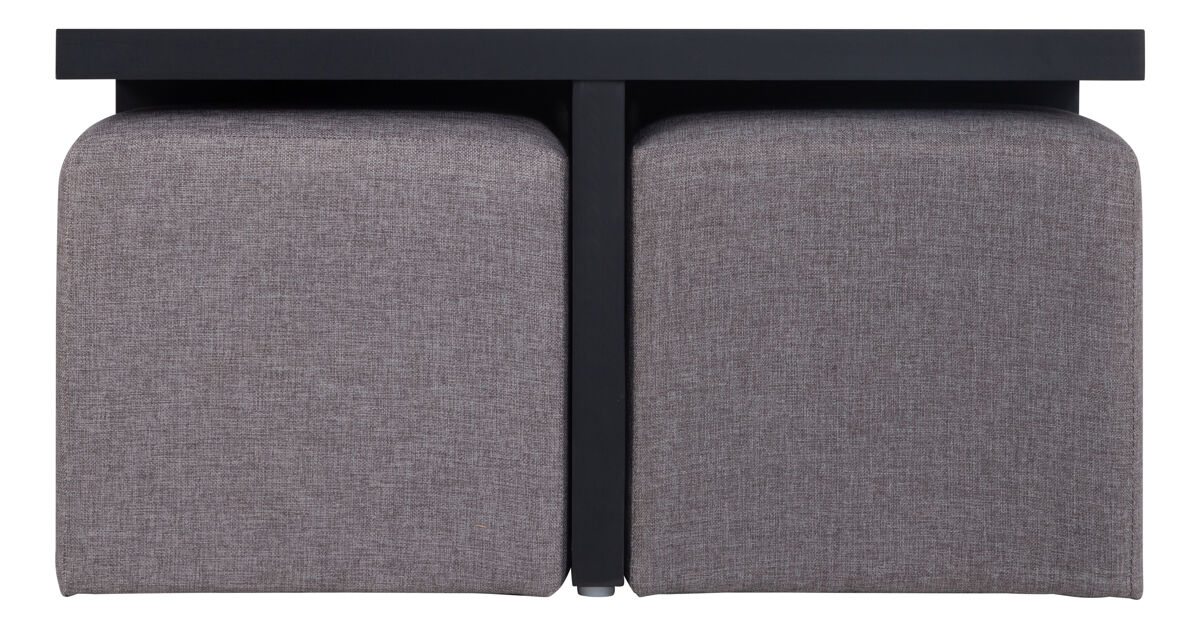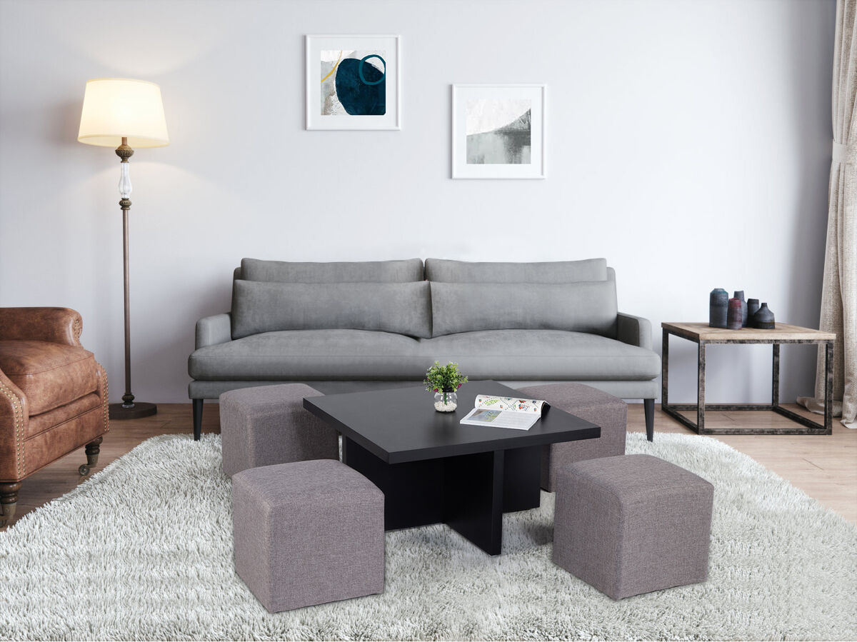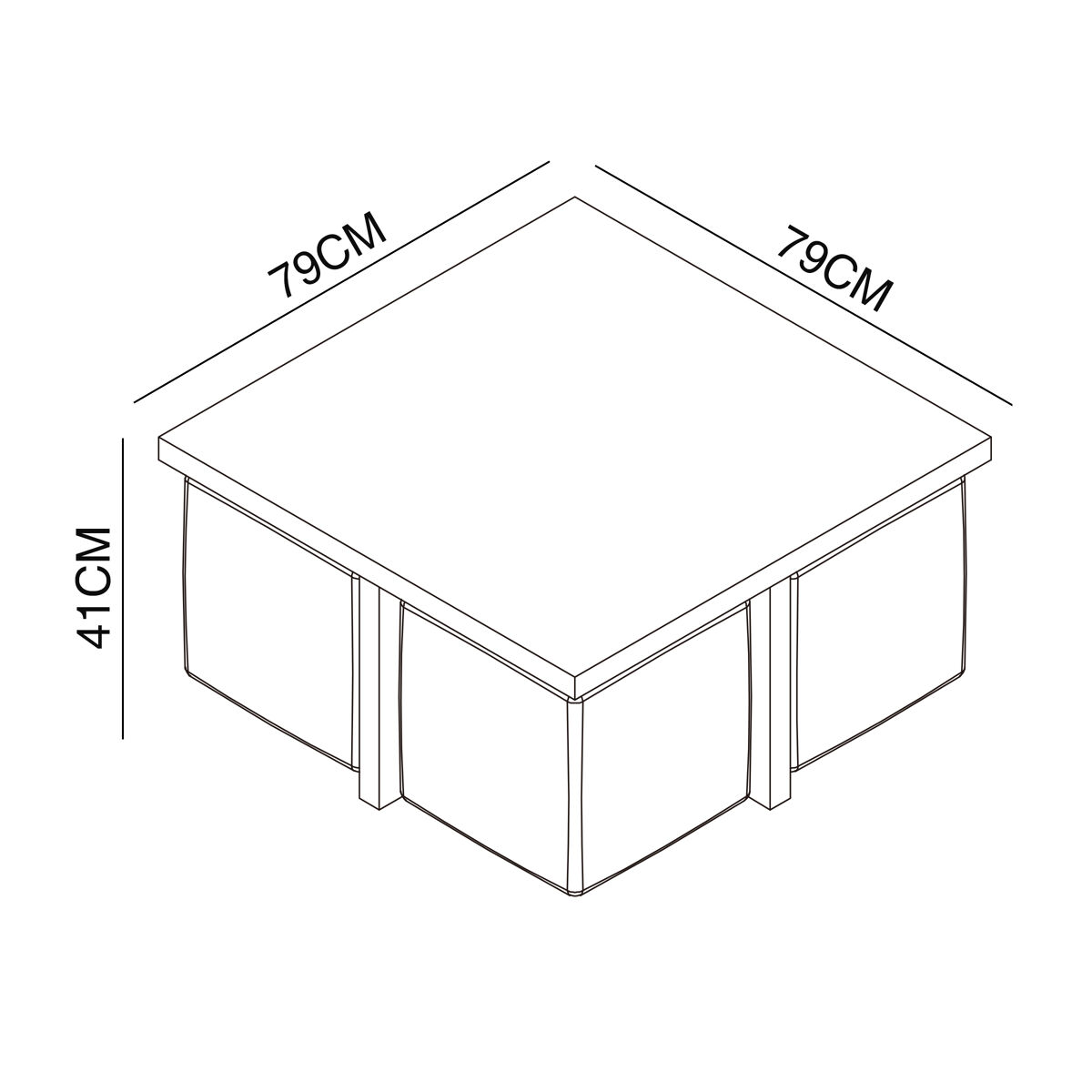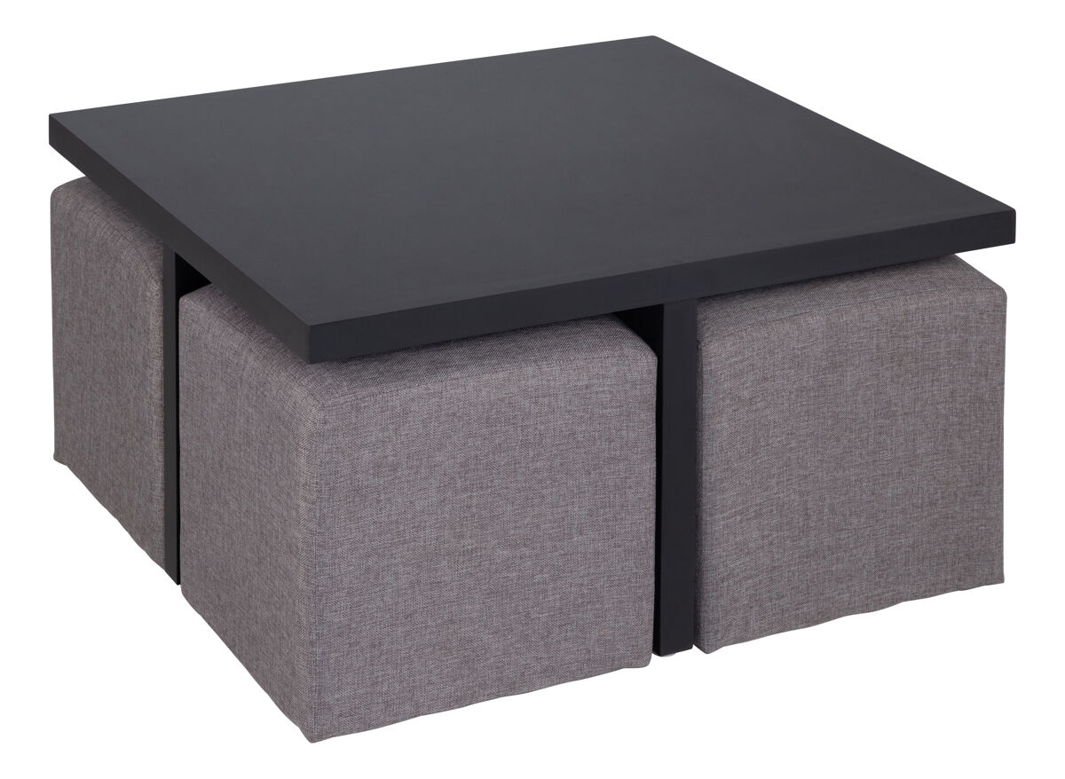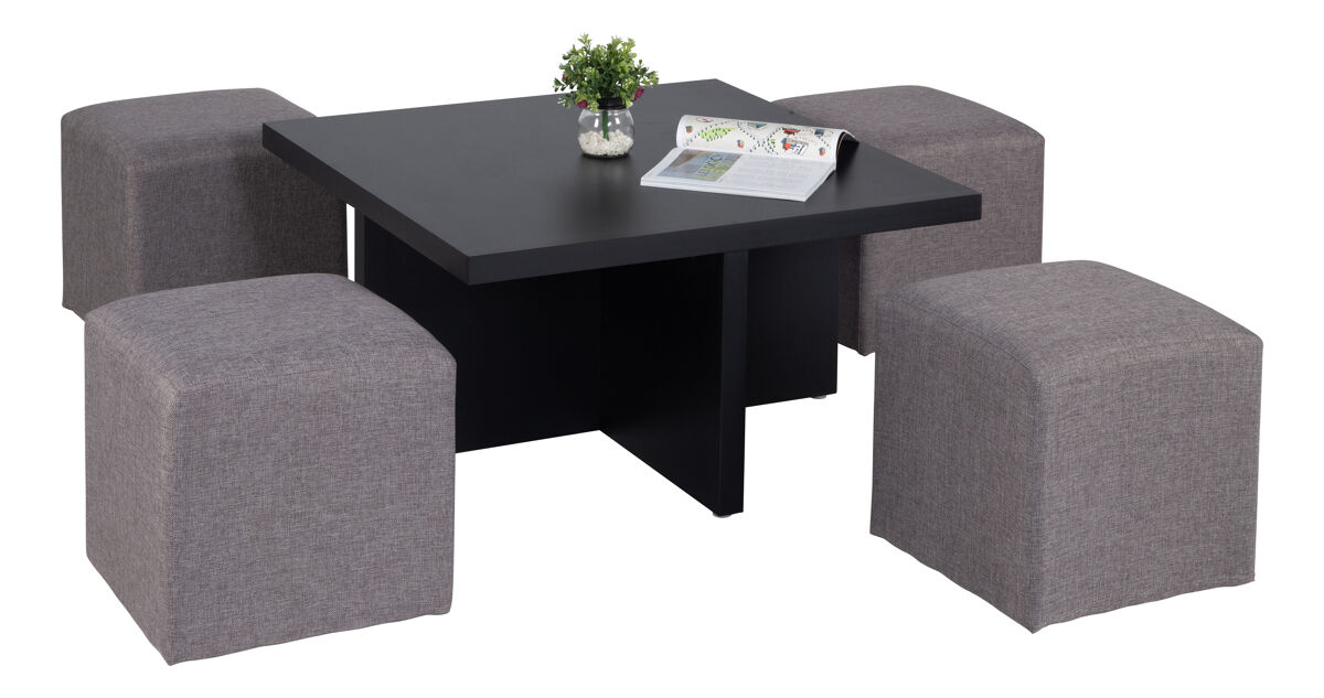 O Conjunto IDARA é a escolha perfeita para quem procura uma peça de mobiliário funcional e elegante. Este conjunto inclui uma mesa de centro quadrada em MDF preto e quatro práticos puffs, ideais para dar um conforto extra à sua sala de estar. Com dimensões de 79 cm de largura, 41 cm de altura e 79 cm de profundidade, este conjunto adapta-se a vários espaços, dando um toque moderno e prático à sua casa. Estilo e conforto num só conjunto!