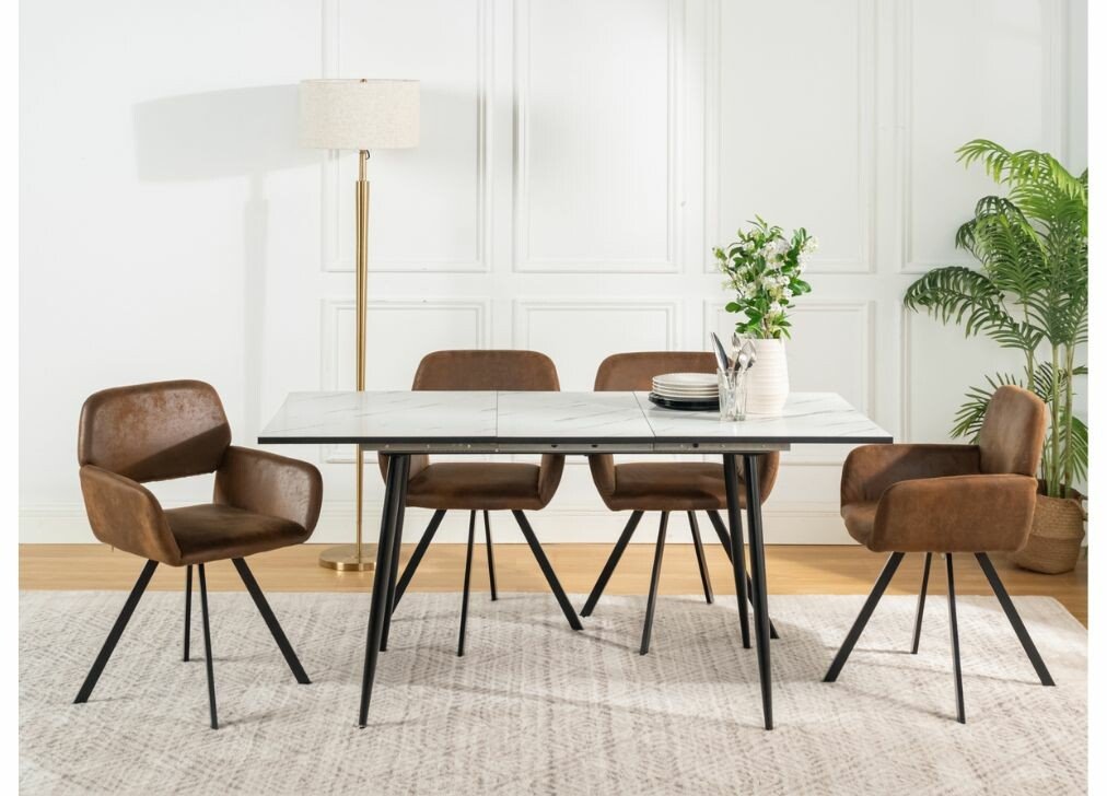 Conjunto de jantar extensível com mesa com efeito mármore branco e 4 cadeiras giratórias retro em microfibra castanha