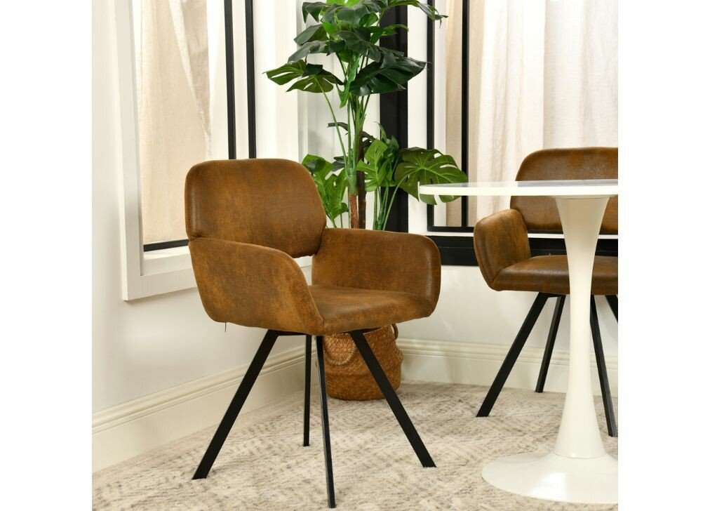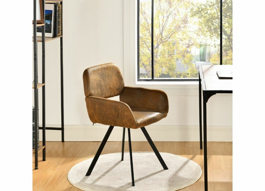 As cadeiras destacam-se pelo seu design ergonómico e rotação de 360°. O encosto envolvente, juntamente com os apoios de braços e o assento almofadado, proporcionam um conforto ideal mesmo durante longas horas de utilização. O seu estofamento em microfibra com efeito de pele envelhecida combina um visual aconchegante e elegante com durabilidade e facilidade de manutenção. Além disso, as pernas de metal angulares oferecem resistência e suporte até 120 kg por cadeira, garantindo durabilidade e estabilidade.