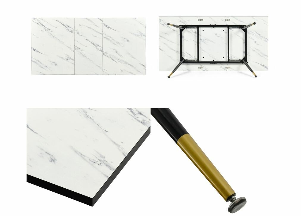 A mesa, com o seu tampo em MDF de 120 cm extensível até 160 cm, traz luz e sofisticação à sua sala de jantar. O seu acabamento com efeito mármore confere um aspeto elegante e requintado, enquanto as pernas em metal preto com detalhes dourados garantem estabilidade e acrescentam um toque de luxo. Ideal para 4 a 6 pessoas, é perfeita tanto para refeições em família como para reuniões com amigos.