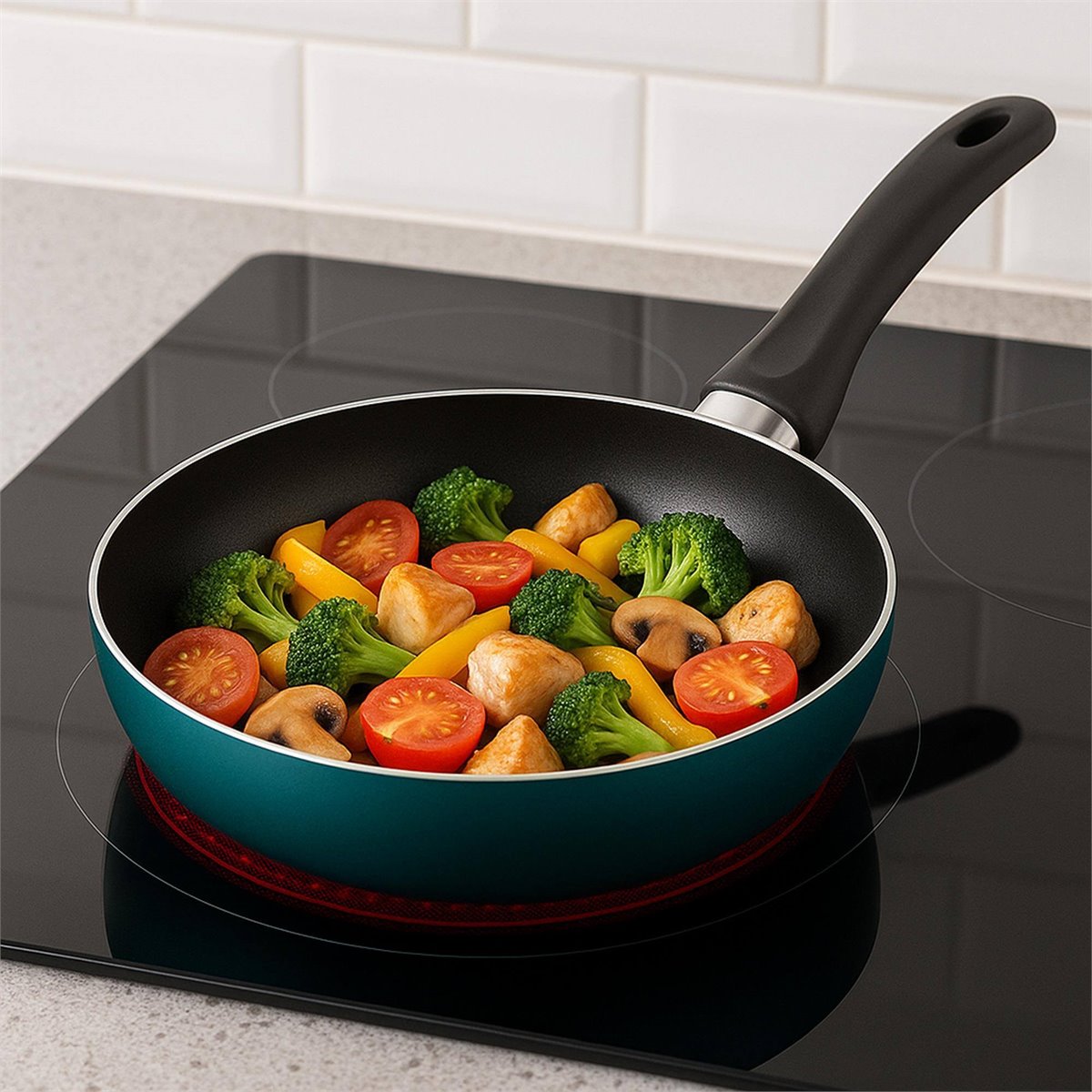 Inclui 3 frigideiras de alumínio prensado na elegante cor azul metálico (Ø16, Ø20 e Ø24cm), com interior antiaderente preto.