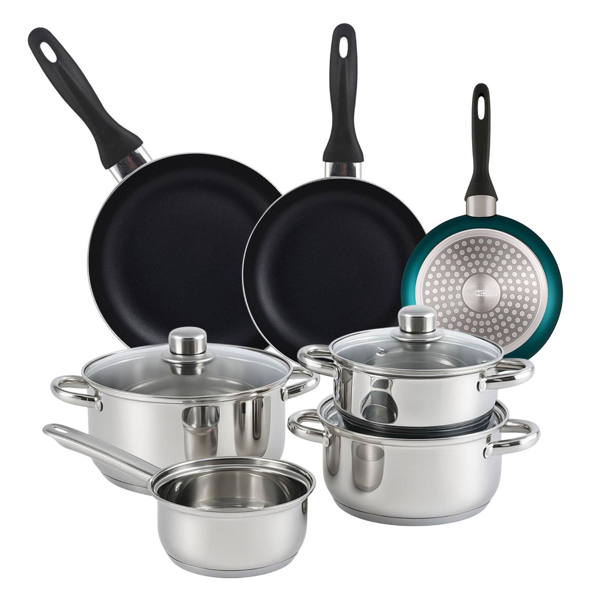 Conjunto de panelas Complete Well Home: conjunto de panelas de aço inoxidável com 12 peças (panelas de Ø16x9cm, panelas de Ø16x9cm, Ø18x10cm e Ø20x11cm, TODAS com tampa), com base de alumínio de 1 mm de espessura que garante uma distribuição uniforme do calor.