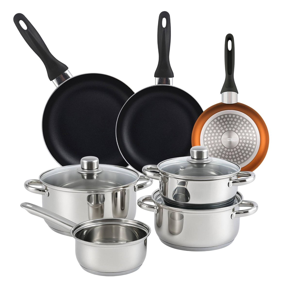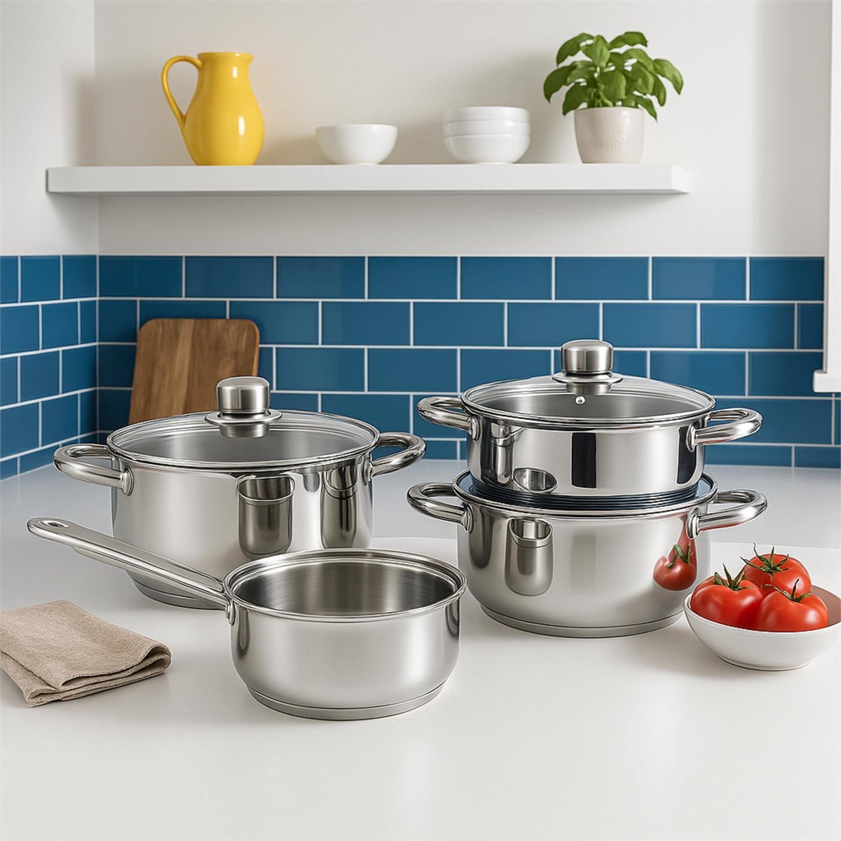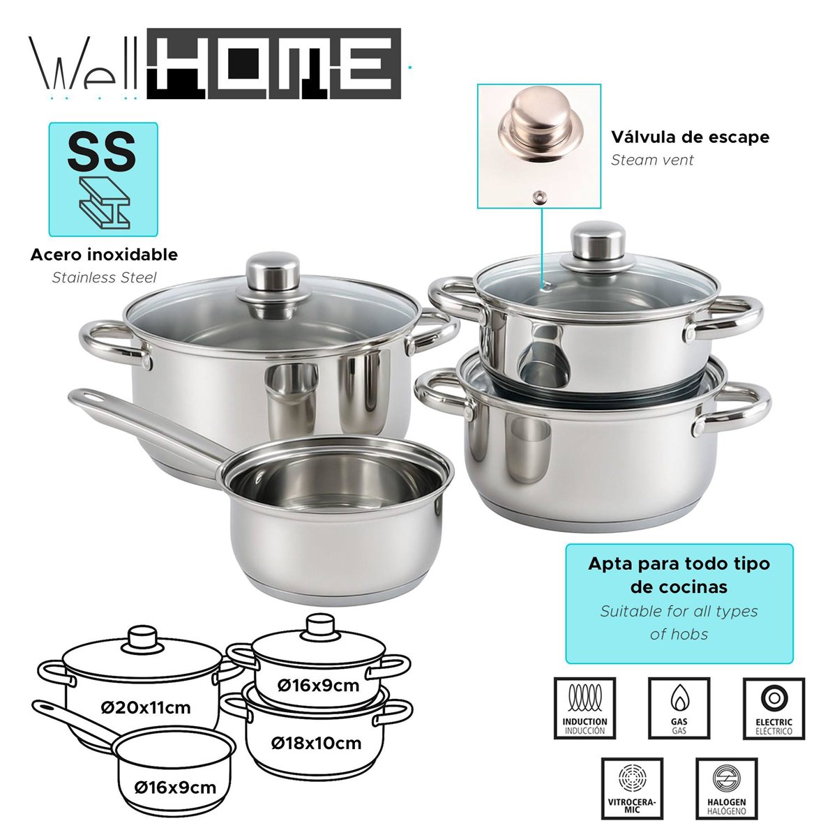 Conjunto de panelas Complete Well Home: conjunto de panelas de aço inoxidável com 12 peças (panelas de Ø16x9cm, panelas de Ø16x9cm, Ø18x10cm e Ø20x11cm, TODAS com tampa), com base de alumínio de 1 mm de espessura que garante uma distribuição uniforme do calor.