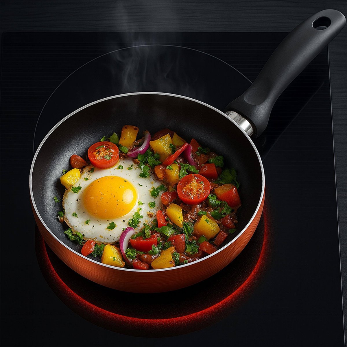 Inclui 3 frigideiras de alumínio prensado em elegante bronze metálico (Ø16, Ø20 e Ø24cm), com interior antiaderente preto.