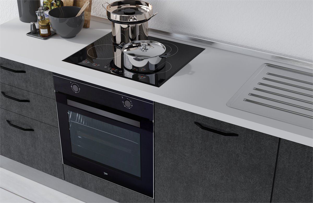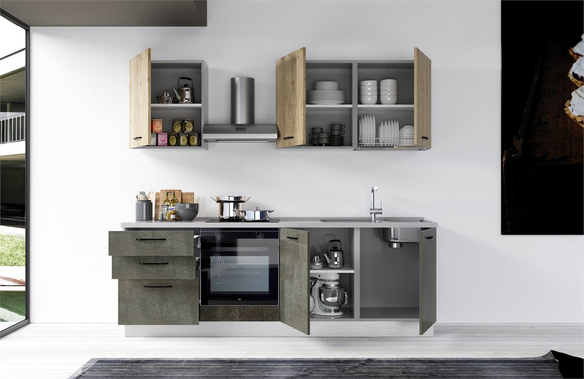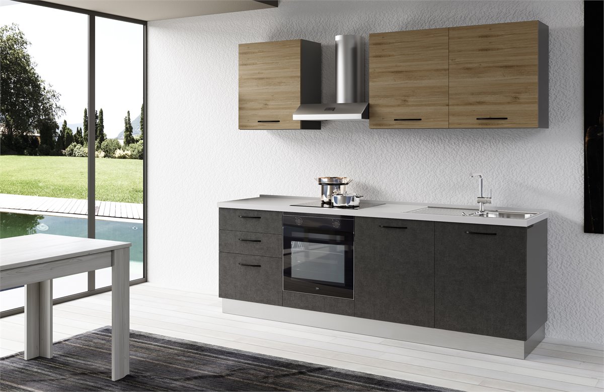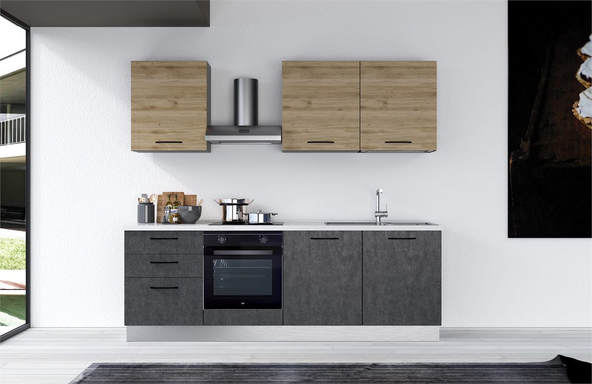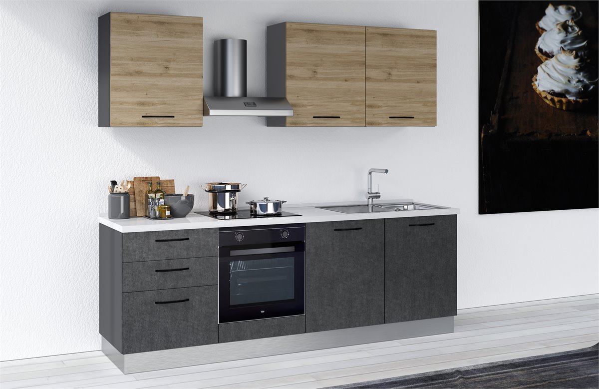 Cozinha GILDA 2.0 240x216 cm. À direita. Acabamento cinza escuro e madeira. É composta por 7 módulos, pia, torneira, exaustor, placa e forno. Seus módulos são feitos de placa de partículas. Portas e gavetas de fecho suave. É composta por 60cm base pia, 60cm base com 1 porta, base forno, 60cm base com 2 gavetas e 1 cesto, 60cm unidade de parede escorredor prato, 2 unidades de parede de 60cm. ExaustorKUMTEL DK6-731 . Eficiência energética D (A+++ a D). 2 Motores. Potência 140W. Capacidade de ventilação intensiva: 300 m3/h. Botões de controlo medidos. 3 Velocidades. Filtro de alumínio lavável para máquina de lavar louça, iluminação LED. O capô inclui o tubo/chaminé acima do motor. Dimensões: L59,8 x A15 x P48,4 cm. Placa vitrocerâmica CANDY CH64XB : 4 zonas de cozedura. Controlo táctil. 10 níveis de potência. Temporizador. Preto. Medidas: L59 x A4 x P52,6 cm. Forno convencional CANDY FIDCN200 com ventilador de refrigeração. Eficiência energética A (A+++ a D). Capacidade de 70 litros. Controlos mecânicos. 4 Funções. Limpeza aquática. Acessórios: 1 rack e 1 bandeja. Cor: L59,5 x A59,5 x P56,8 cm.