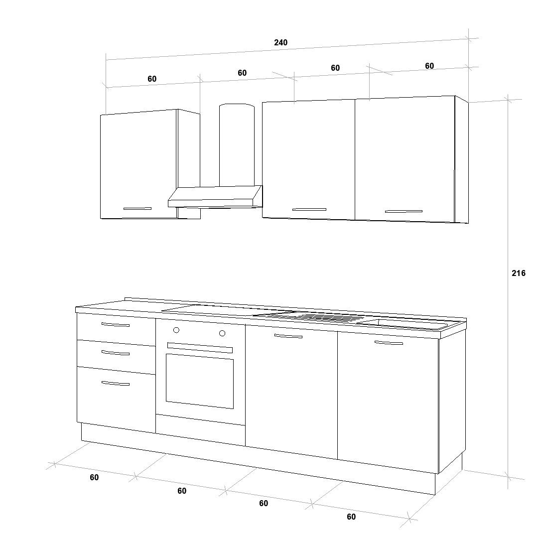 Cozinha GILDA 2.0 240x216 cm. À direita. Acabamento madeira e cinza claro. É composta por 7 módulos, pia, torneira, exaustor, placa e forno. Seus módulos são feitos de placa de partículas. Portas e gavetas de fecho suave. É composta por 60cm base pia, 60cm base com 1 porta, base forno, 60cm base com 2 gavetas e 1 cesto, 60cm unidade de parede escorredor prato, 2 unidades de parede de 60cm. ExaustorKUMTEL DK6-731 . Eficiência energética D (A+++ a D). 2 Motores. Potência 140W. Capacidade de ventilação intensiva: 300 m3/h. Botões de controlo medidos. 3 Velocidades. Filtro de alumínio lavável para máquina de lavar louça, iluminação LED. O capô inclui o tubo/chaminé acima do motor. Dimensões: L59,8 x A15 x P48,4 cm. Placa vitrocerâmica CANDY CH64XB : 4 zonas de cozedura. Controlo táctil. 10 níveis de potência. Temporizador. Preto. Medidas: L59 x A4 x P52,6 cm. Forno convencional CANDY FIDCN200 com ventilador de refrigeração. Eficiência energética A (A+++ a D). Capacidade de 70 litros. Controlos mecânicos. 4 Funções. Limpeza aquática. Acessórios: 1 rack e 1 bandeja. Cor: L59,5 x A59,5 x P56,8 cm.