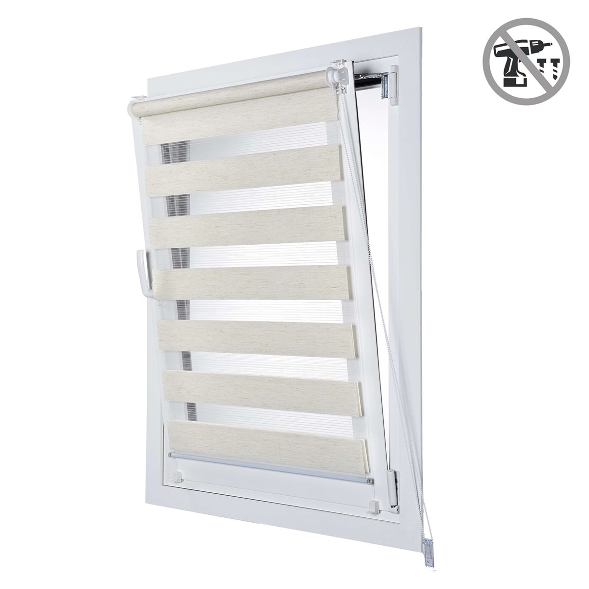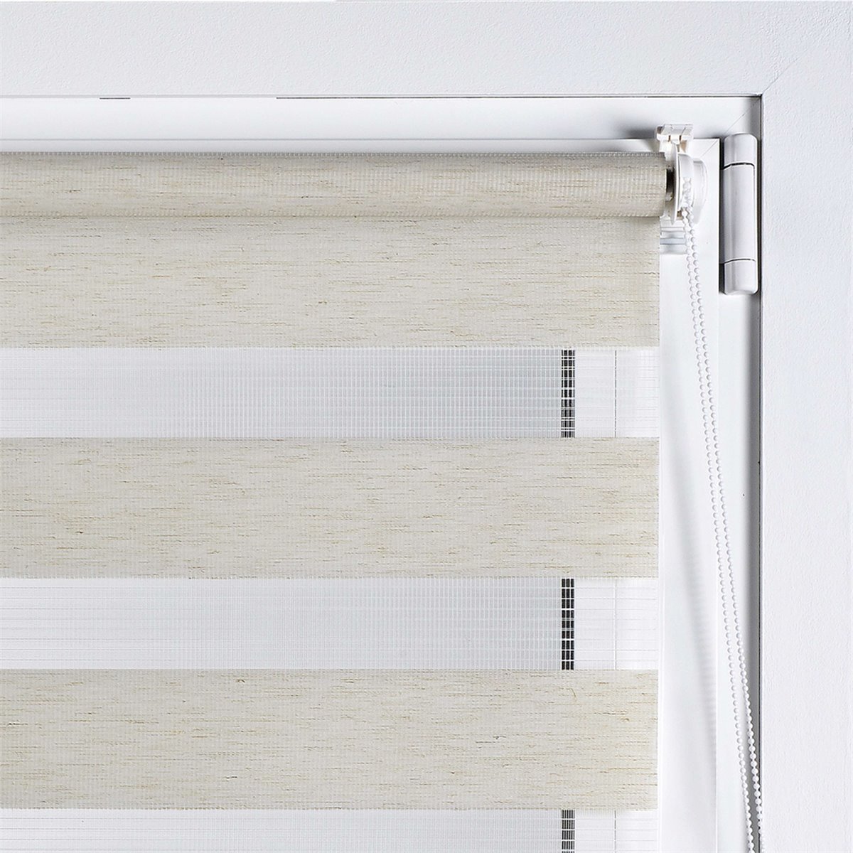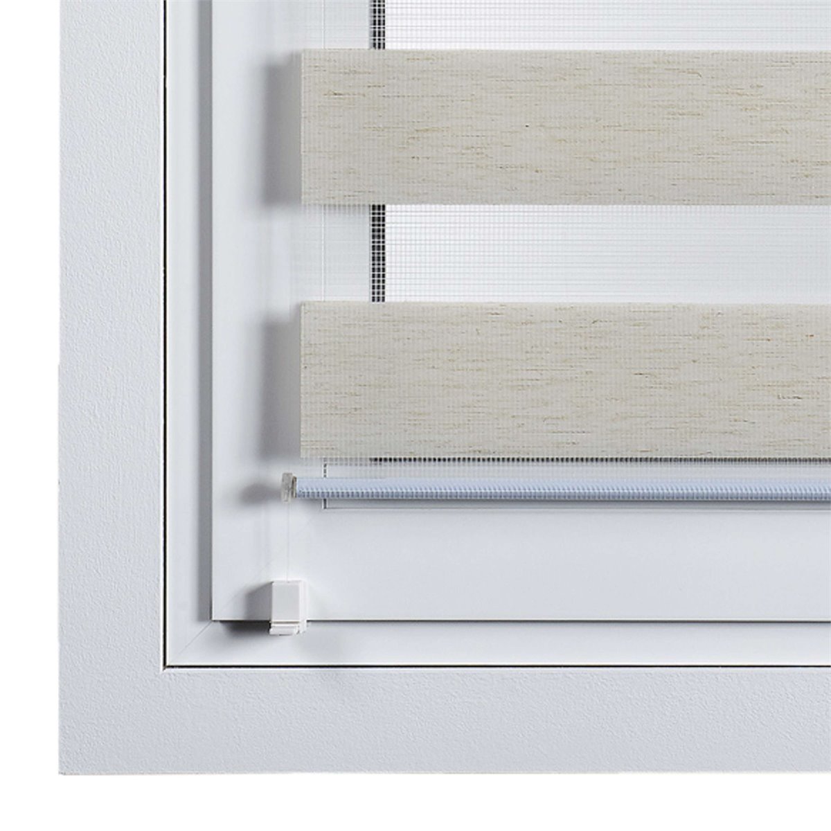 Estore de noite e de dia com tecido de gota dupla e posição dupla para jogar com a luminosidade e a privacidade da divisão. Quando o estore está fechado, a privacidade é elevada. Quando aberto, a privacidade será moderada. Composição: 100% poliéster. Sistema Easyfix: fácil instalação na parede, no tecto e também no caixilho da janela, sem furar, sem fazer buracos. Estore ideal para janelas de batente: inclui um sistema de bloqueio inferior para que o estore fique fixo ao caixilho da janela e não se mova. Inclui suportes de plástico, acessórios de instalação e sistema de segurança para crianças. Fácil de limpar com um pano ligeiramente húmido.