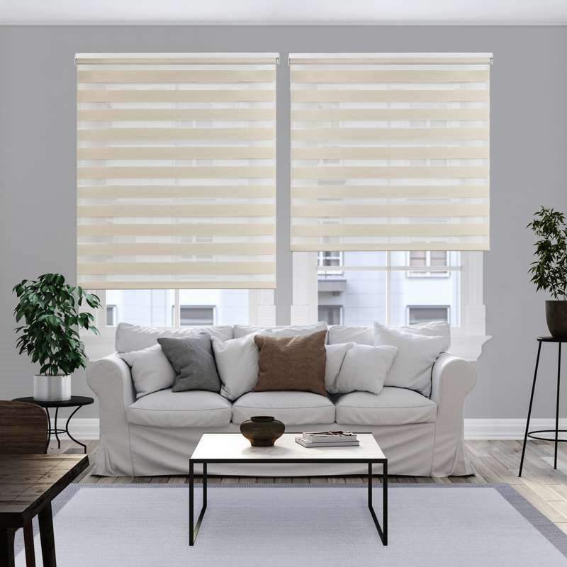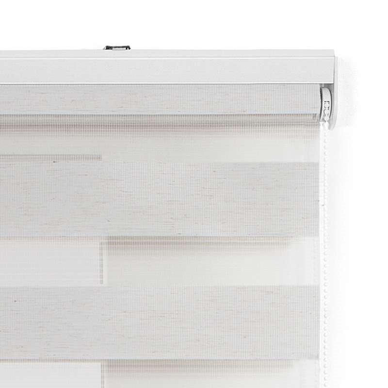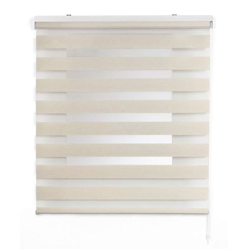 Estore decorativo e muito funcional para noite e dia, ideal para qualquer divisão: cozinhas, salas de estar, salas de jantar, quartos, escritórios, etc. .... Disponível nas alturas de 180cm (janelas) e 250cm (portas). Estore com tecido de duplo caimento e dupla posição: joga com a luminosidade e a privacidade da divisão. Quando o estore está fechado, a privacidade é elevada. Quando está aberto, a privacidade é moderada. Composição: 100% poliéster. 100% poliéster. O mecanismo é de alumínio e tem uma cobertura decorativa, o contrapeso está oculto, inclui suportes metálicos, acessórios para instalação no tecto ou na parede e um sistema de segurança para crianças. Fácil de limpar com um pano ligeiramente húmido.